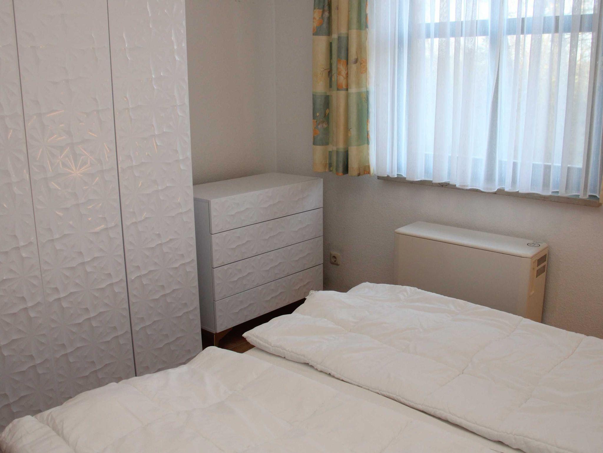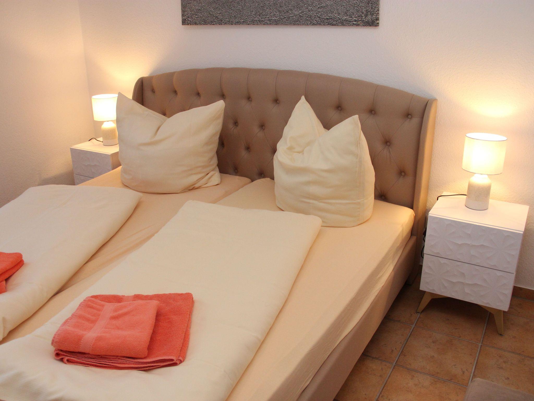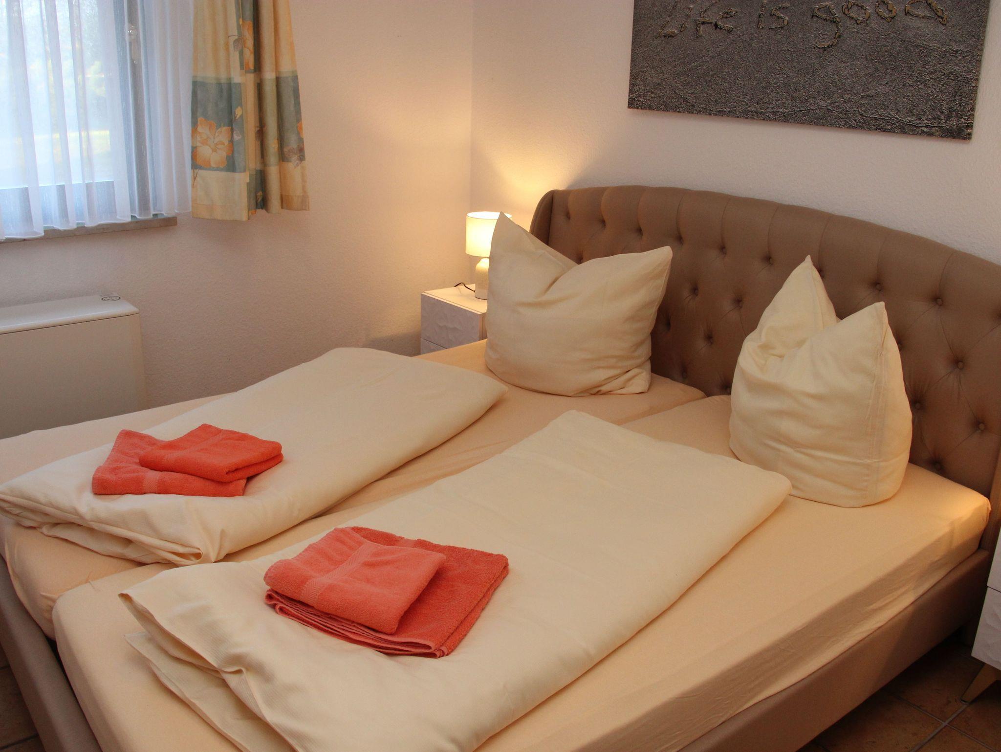 Das Wohnzimmer hat einen Kamin, das Kaminholz ist von den Gästen mitzubringen. Alle Wohnungen sind Nichtraucherwohnungen. In der offenen Küchenzeile befinden sich ein Backofen und Geschirrspüler, sowie umfangreiche Küchenutensilien. Für unsere kleinen Gäste können Sie Kinderreisebett und Kinderhochstuhl à 10,00 € /pro Woche dazubuchen. Für die nächtliche Ruhe stehen Ihnen 1 Schlafzimmern mit einem Doppelbett 1,80 x 2,00 m (getrennte Matratze) und ein Schlafzimmer mit 2 Einzelbetten (0,90 x 2,00 m) zur Verfügung, die Bettwäsche und Handtücher können bei der Zimmervermittlung dazu gebucht werden - ein Paket 19,50 € (1 Badetuch, 1 Handtuch, 1 Kopfkissen, 1 Bezug und 1 Spannbettlaken). Ein WLAN Gästezugang steht Ihnen während Ihres Aufenthaltes zur Verfügung. Zum gemütlichen Verweilen lädt die Terrasse mit Gartenmöbel ein. Ein Parkplatz befindet sich auf dem Grundstück.Haustiere sind herzlich willkommen. Den Kamin bitte nur mit Wasser und Asche reinigen.