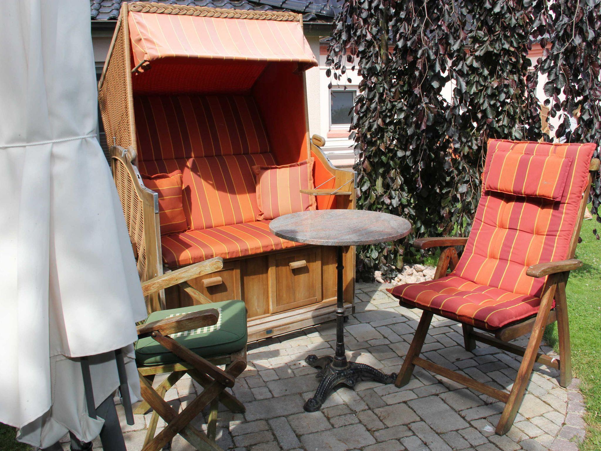 Aussenanlage: eingezäuntes Grundstück, Garten, Gartenmöbel, Strandkorb, Terrasse