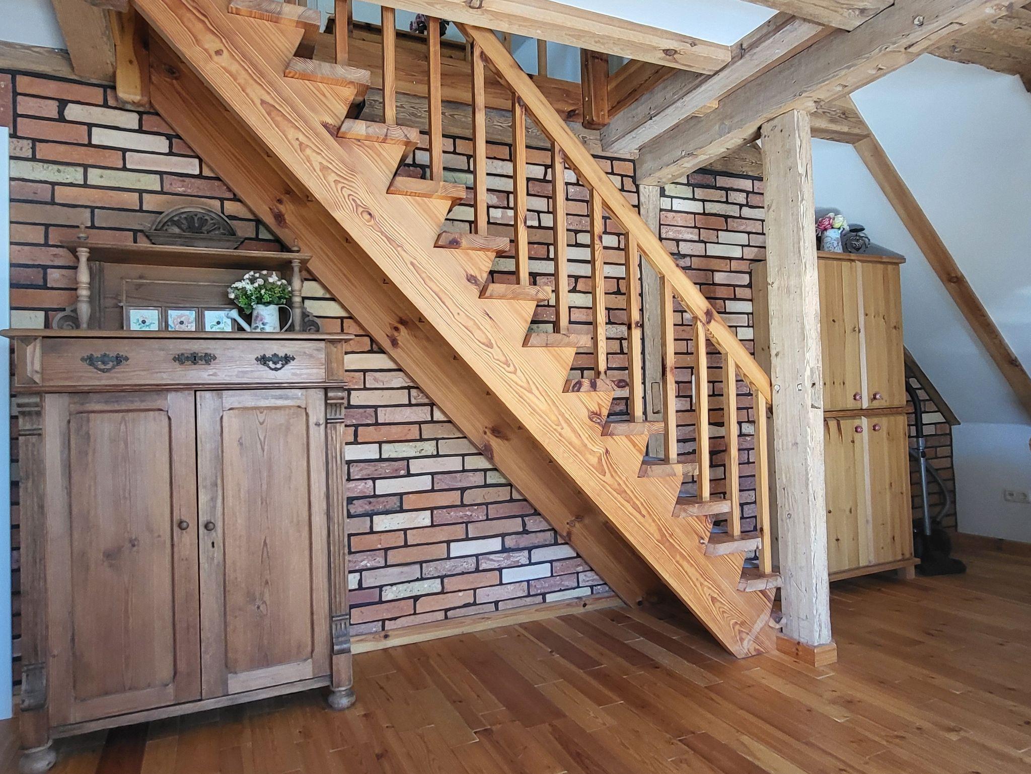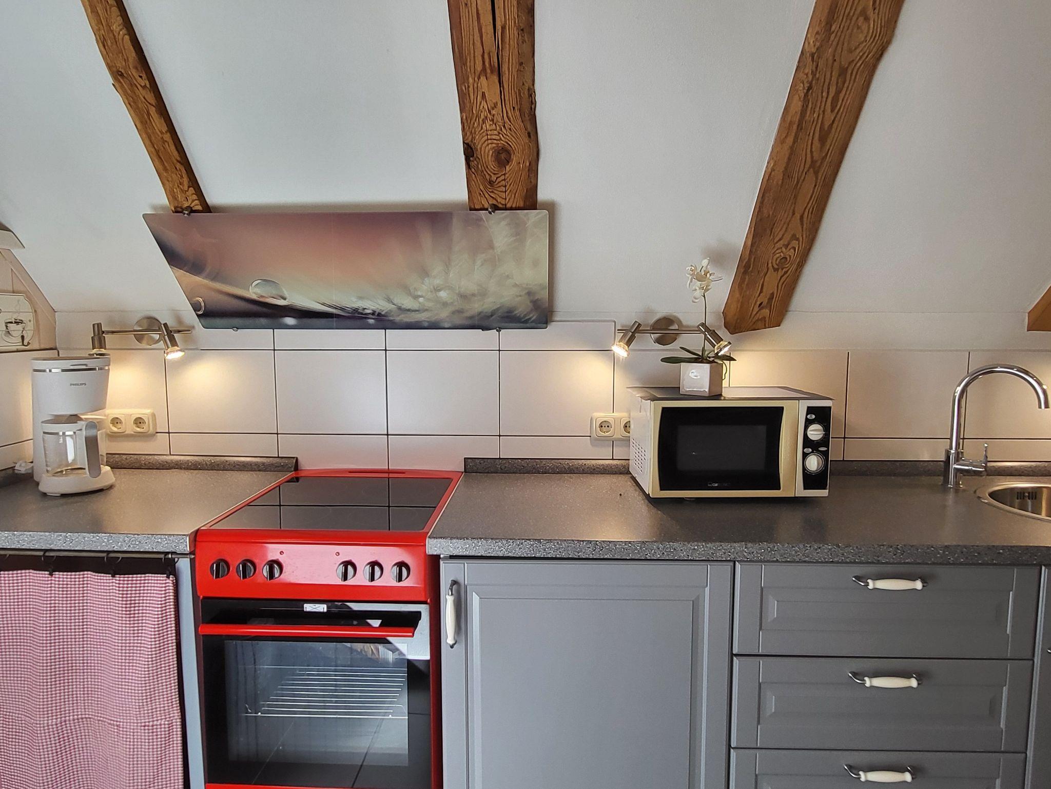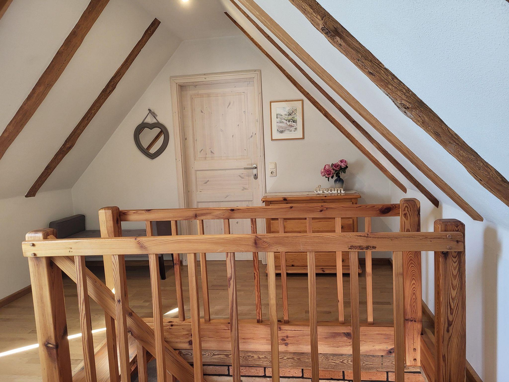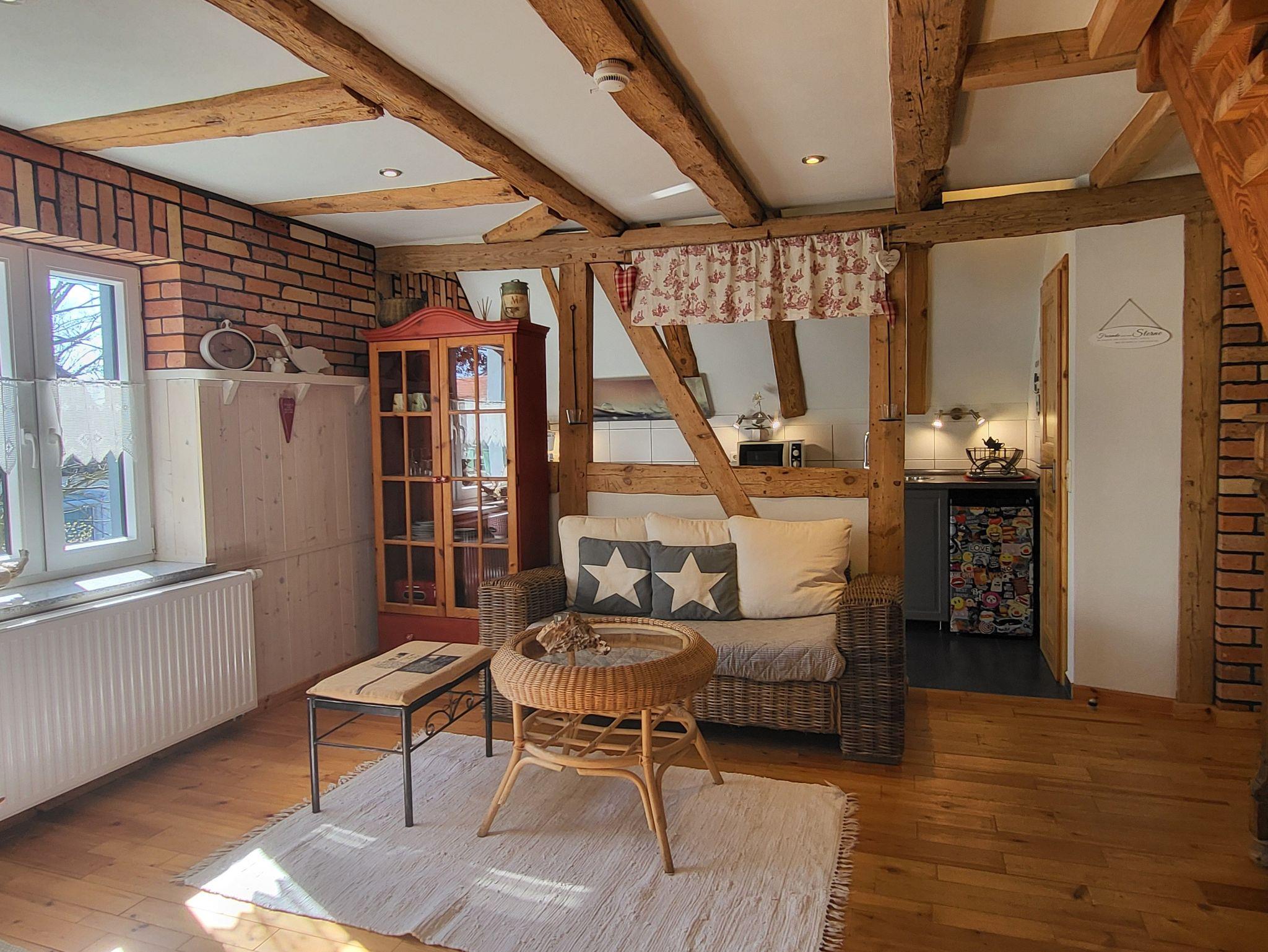 die Ferienwohnung im Obergeschoss erstreckt über 2 Etagen. Schlafen unterm Sternenhimmel im Dachgeschoss, mit Doppelbett 2,00 x 1,80 m (getrennte Matratzen). Liebevoll und fachgerecht 2017 grundsaniert, alles wurde mit natürlichen Baustoffen hergerichtet. Freigelegtes altes Sichtfachwerk und Naturholzböden zeigen die Persönlichkeit der Wohnung. Naturholzmöbel sorgen für ein wohnliches Ambiente. Der offene Wohnstil mit komplett ausgestatteter Küchenzeile, ein lichtdurchflutetes Bad und der großzügige Wohnraum sorgen für Gemütlichkeit. Im großen naturbelassenen Garten lädt eine sonnige Gemeinschaftsterrasse am alten Apfelbaum zum verweilen ein.Ein Parkplatz befindet sich auf dem Grundstück. Die Wohnung ist nicht geeignet für Kinder unter 6 Jahren. Die Ferienwohnung wir mit Bettwäsche und Handtücher übergeben.