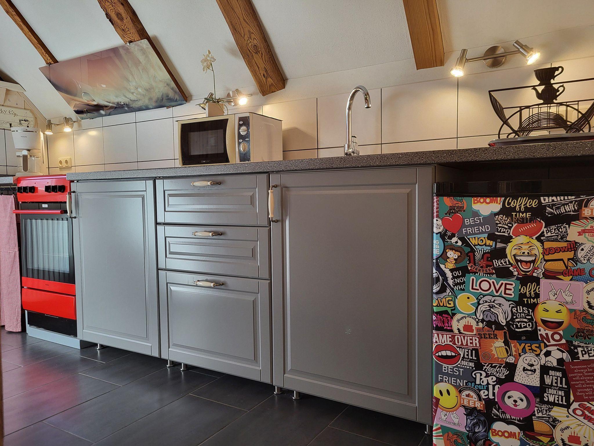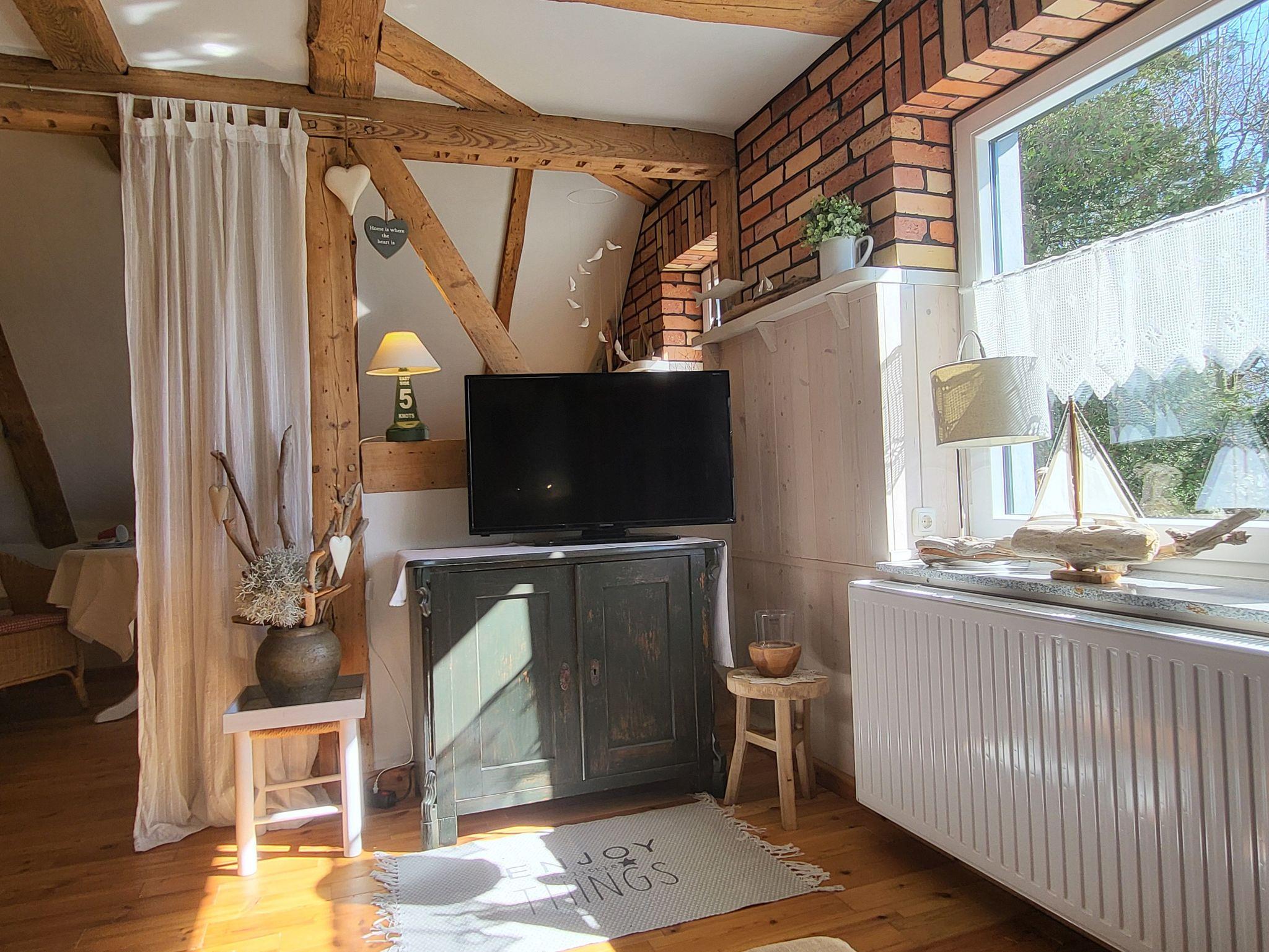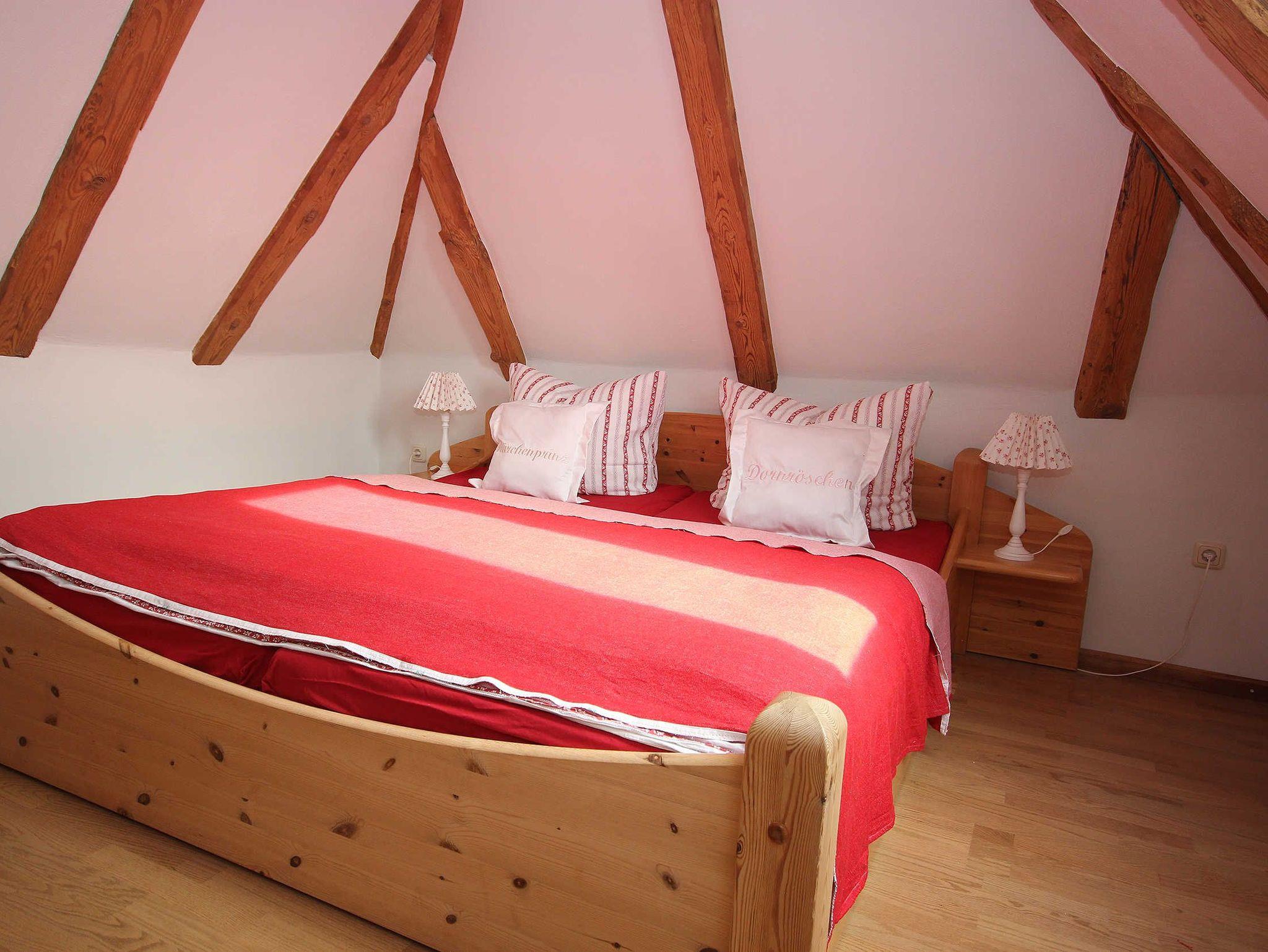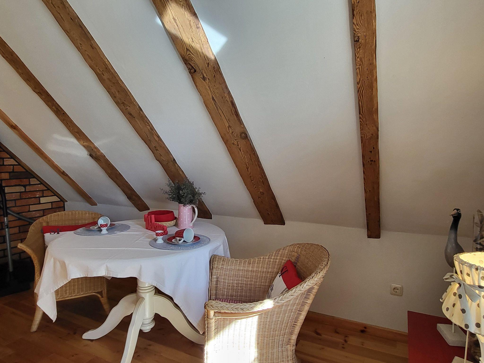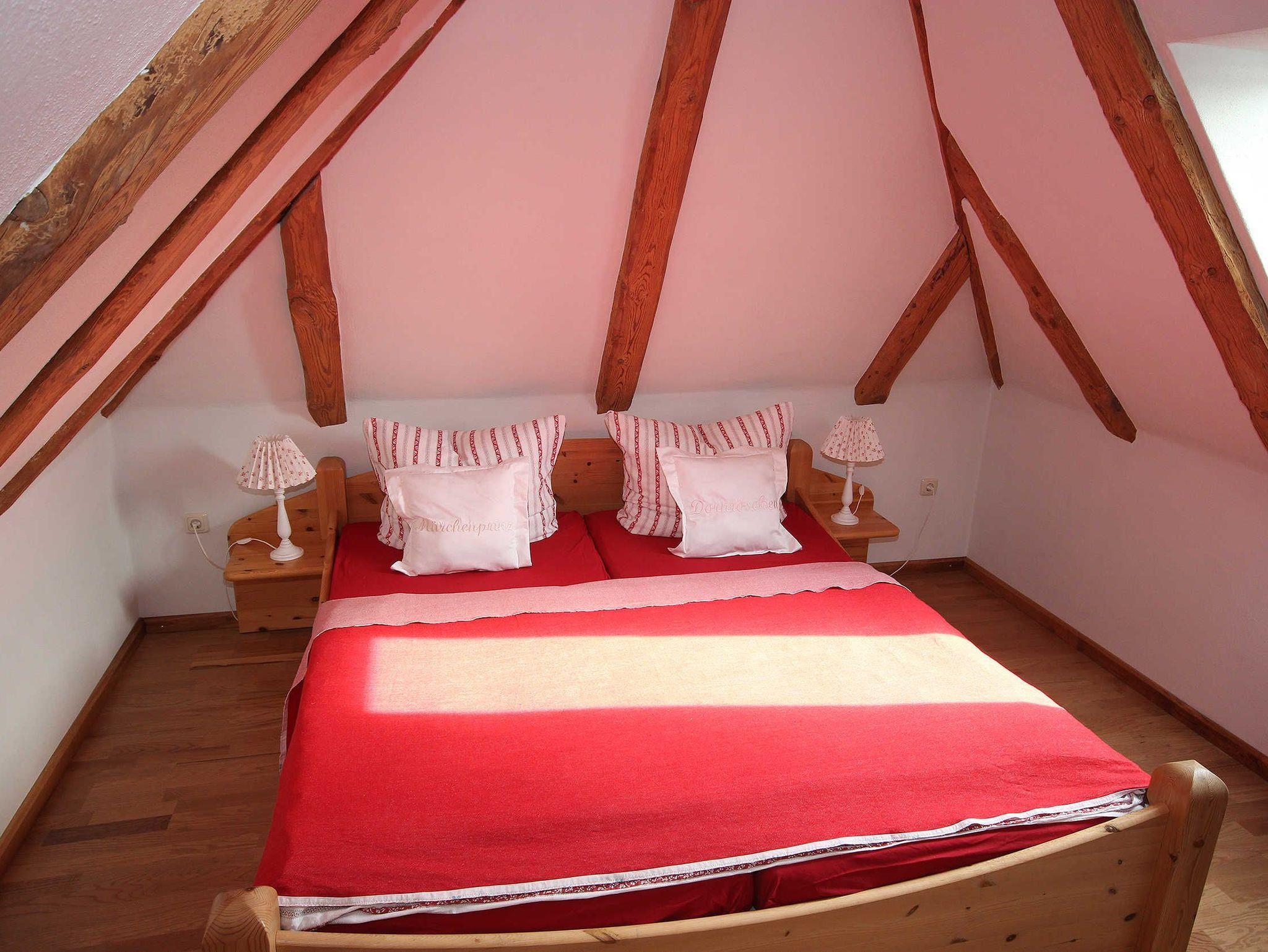 die Ferienwohnung im Obergeschoss erstreckt über 2 Etagen. Schlafen unterm Sternenhimmel im Dachgeschoss, mit Doppelbett 2,00 x 1,80 m (getrennte Matratzen). Liebevoll und fachgerecht 2017 grundsaniert, alles wurde mit natürlichen Baustoffen hergerichtet. Freigelegtes altes Sichtfachwerk und Naturholzböden zeigen die Persönlichkeit der Wohnung. Naturholzmöbel sorgen für ein wohnliches Ambiente. Der offene Wohnstil mit komplett ausgestatteter Küchenzeile, ein lichtdurchflutetes Bad und der großzügige Wohnraum sorgen für Gemütlichkeit. Im großen naturbelassenen Garten lädt eine sonnige Gemeinschaftsterrasse am alten Apfelbaum zum verweilen ein.Ein Parkplatz befindet sich auf dem Grundstück. Die Wohnung ist nicht geeignet für Kinder unter 6 Jahren. Die Ferienwohnung wir mit Bettwäsche und Handtücher übergeben.