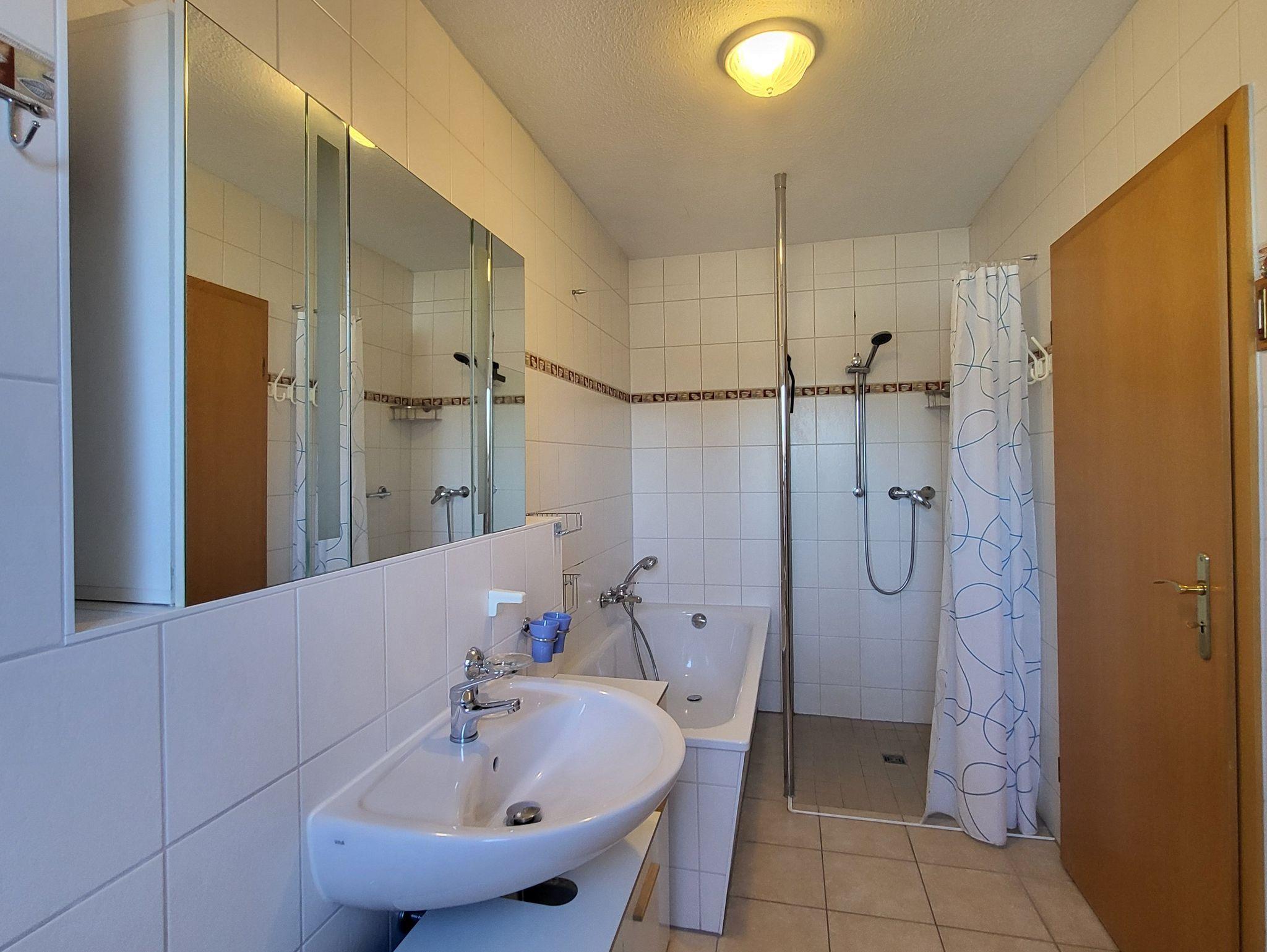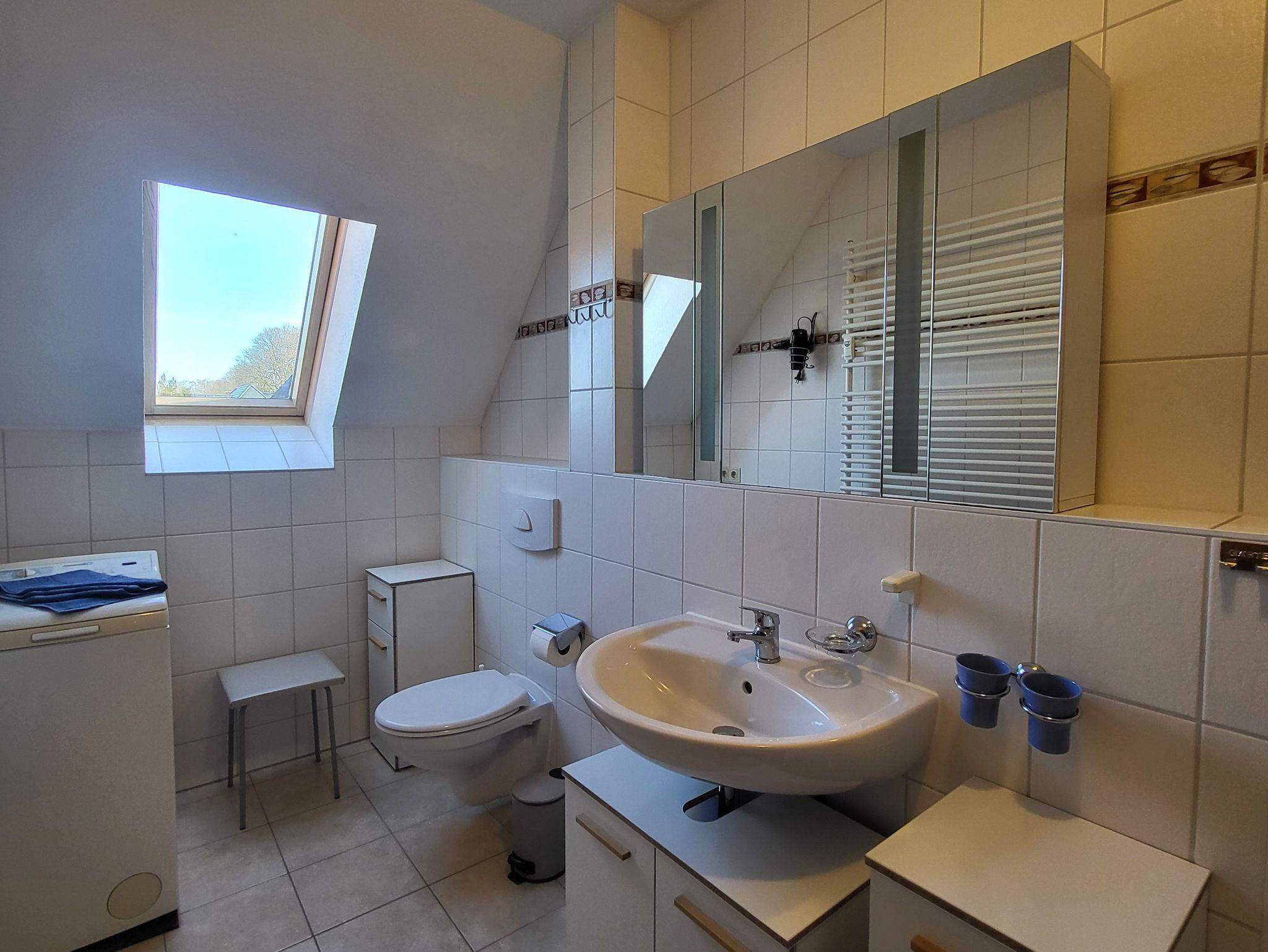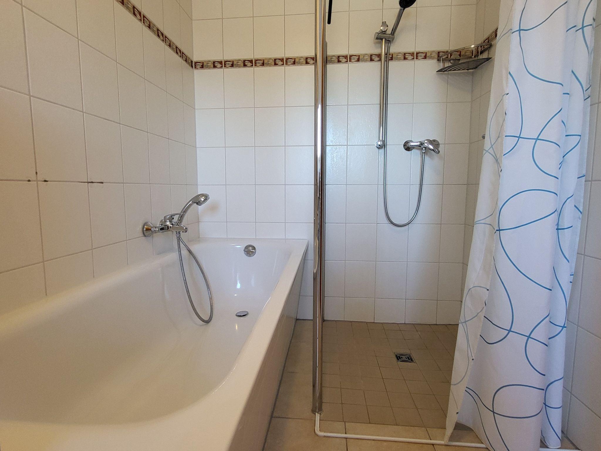 Im Bad befindet sich eine bodengleiche Dusche und eine Badewanne, sowie eine Waschmaschine.
