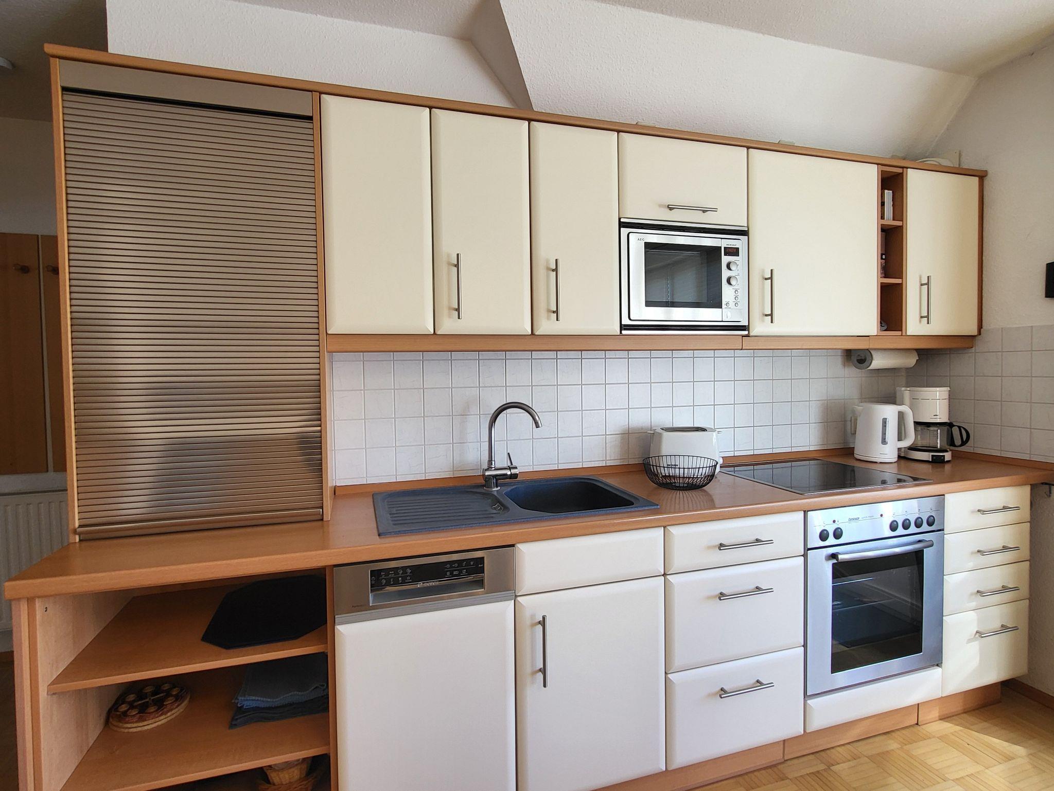 Das Wohnzimmer hat einen Kaminofen, eine offene Küchenzeile und einen Essplatz. Die offene Küchenzeile ist mit Backofen, Mikrowelle, Wasserkocher und Geschirrspüler ausgestattet. Der Kühl- und der Tiefkühlschrank finden Sie in einem Nebenraum.