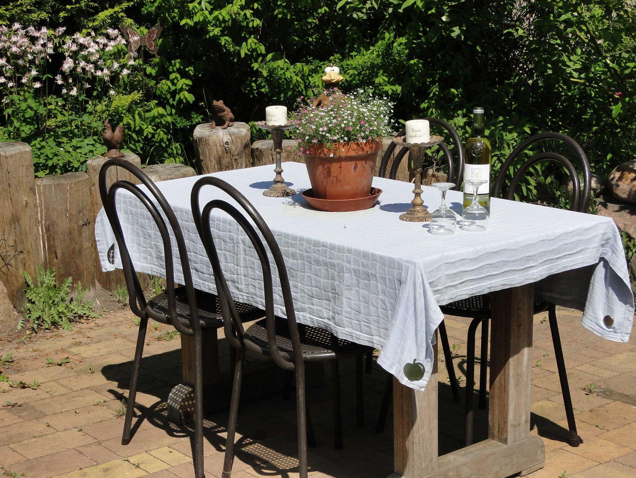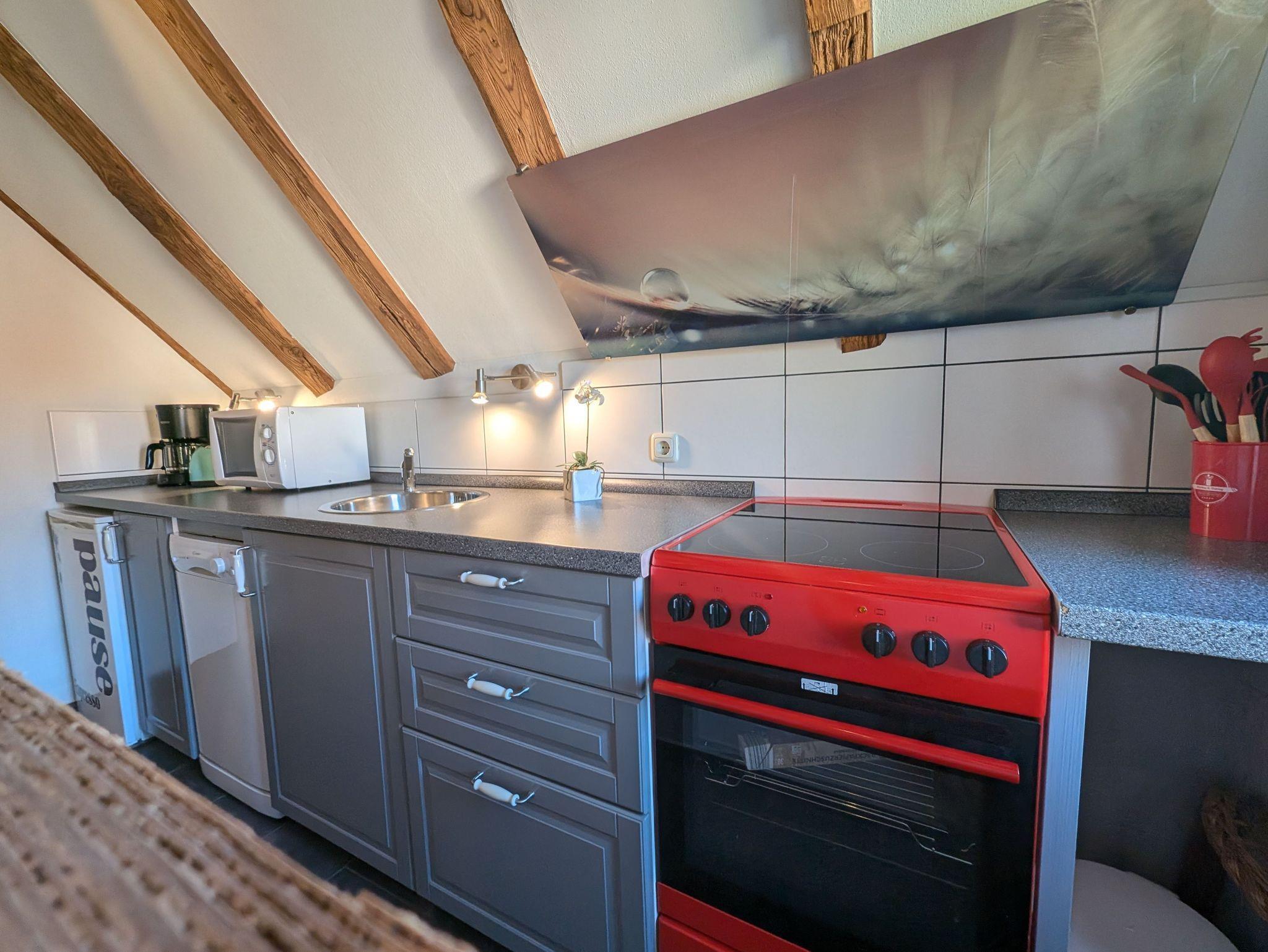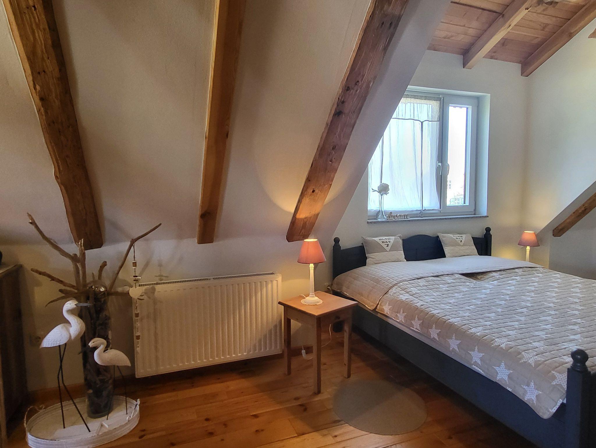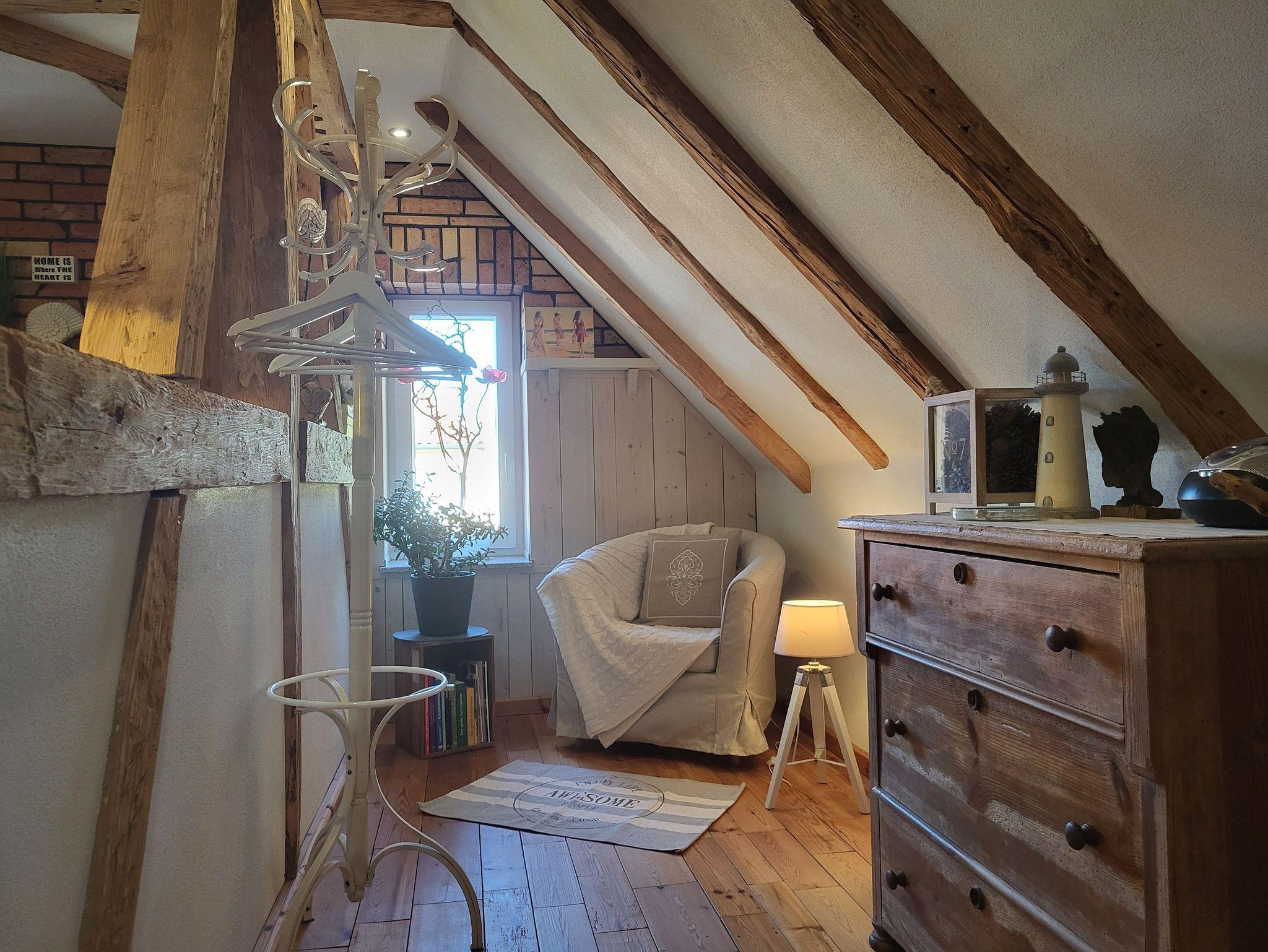 die Ferienwohnung im Obergeschoss. wurde liebevoll und fachgerecht grundsaniert, alles wurde mit natürlichen Baustoffen hergerichtet. Freigelegtes altes Sichtfachwerk und Naturholzböden zeigen die Persönlichkeit der Wohnung. Naturholzmöbel sorgen für ein wohnliches Ambiente. Der offene Wohnstil mit komplett ausgestatteter Küchenzeile, ein lichtdurchflutetes Bad und der großzügige Wohnraum sorgen für Gemütlichkeit. Doppelbett 2,00 x 1,80 m. Im großen naturbelassenen Garten lädt eine sonnige Gemeinschaftsterrasse am alten Apfelbaum zum verweilen ein. Parkplatz auf dem Grundstück. Die Wohnung ist nicht geeignet für Kinder unter 6 Jahren. Die Ferienwohnung wir mit Bettwäsche und Handtücher übergeben.