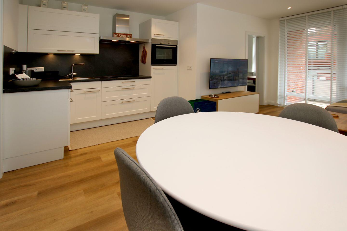 - Wohnzimmer mit Eckcouch und 48cm hoch, 55 Zoll Smart TV, Küchenzeile und Esstisch