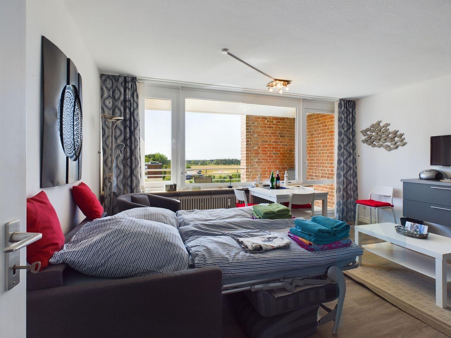 Ihre Wohnung befindet sich im 5. Stock und Sie haben von den zwei Balkonen zum einen sensationellen Ausblick auf die Nordsee und zum anderen auf den Flugplatz.