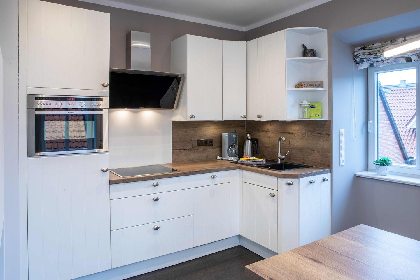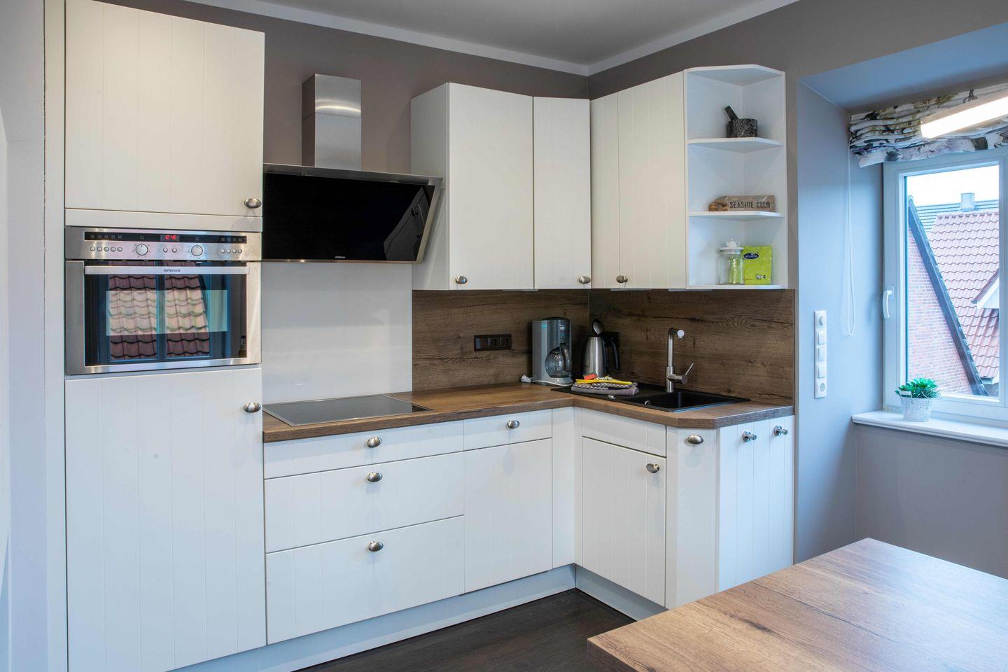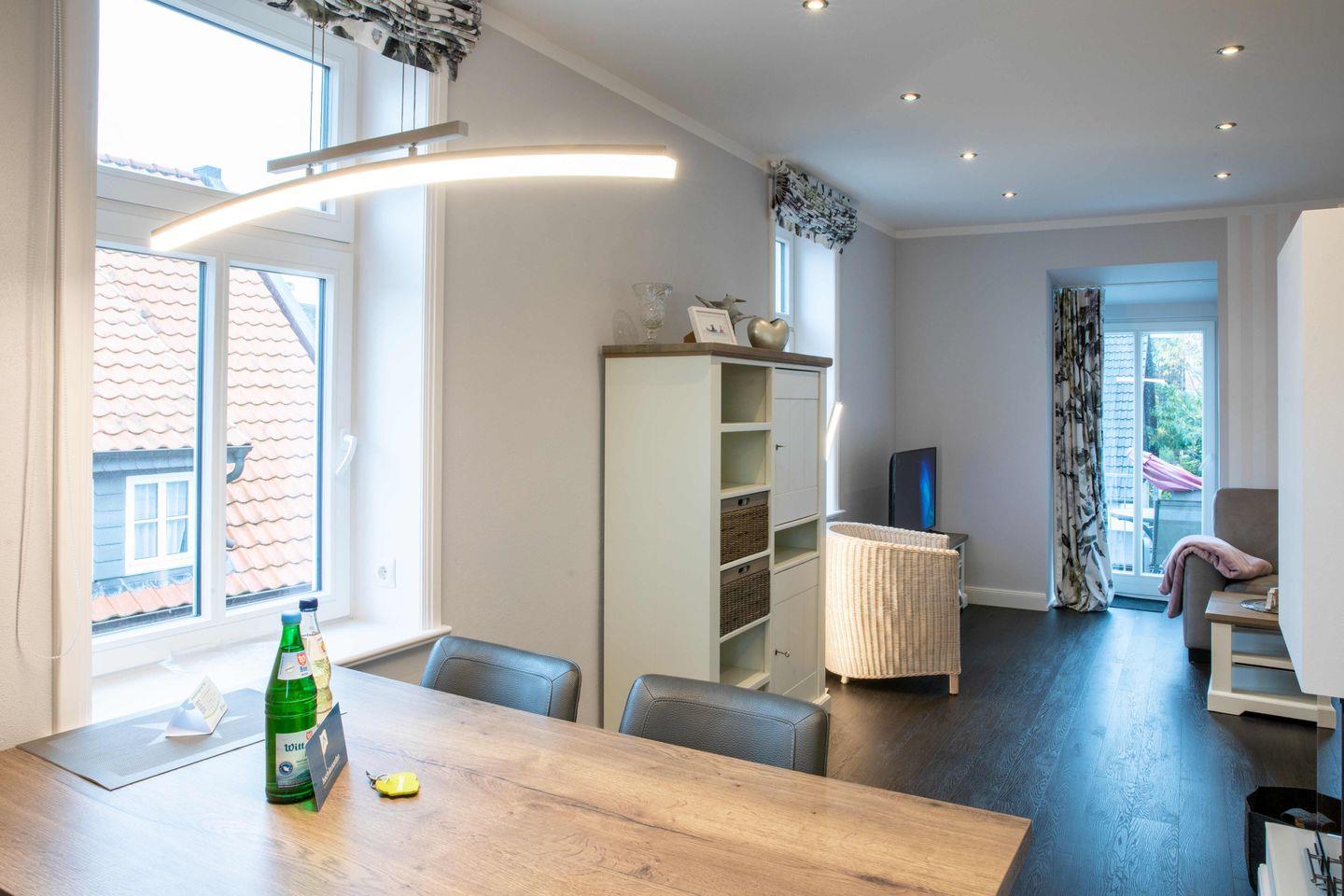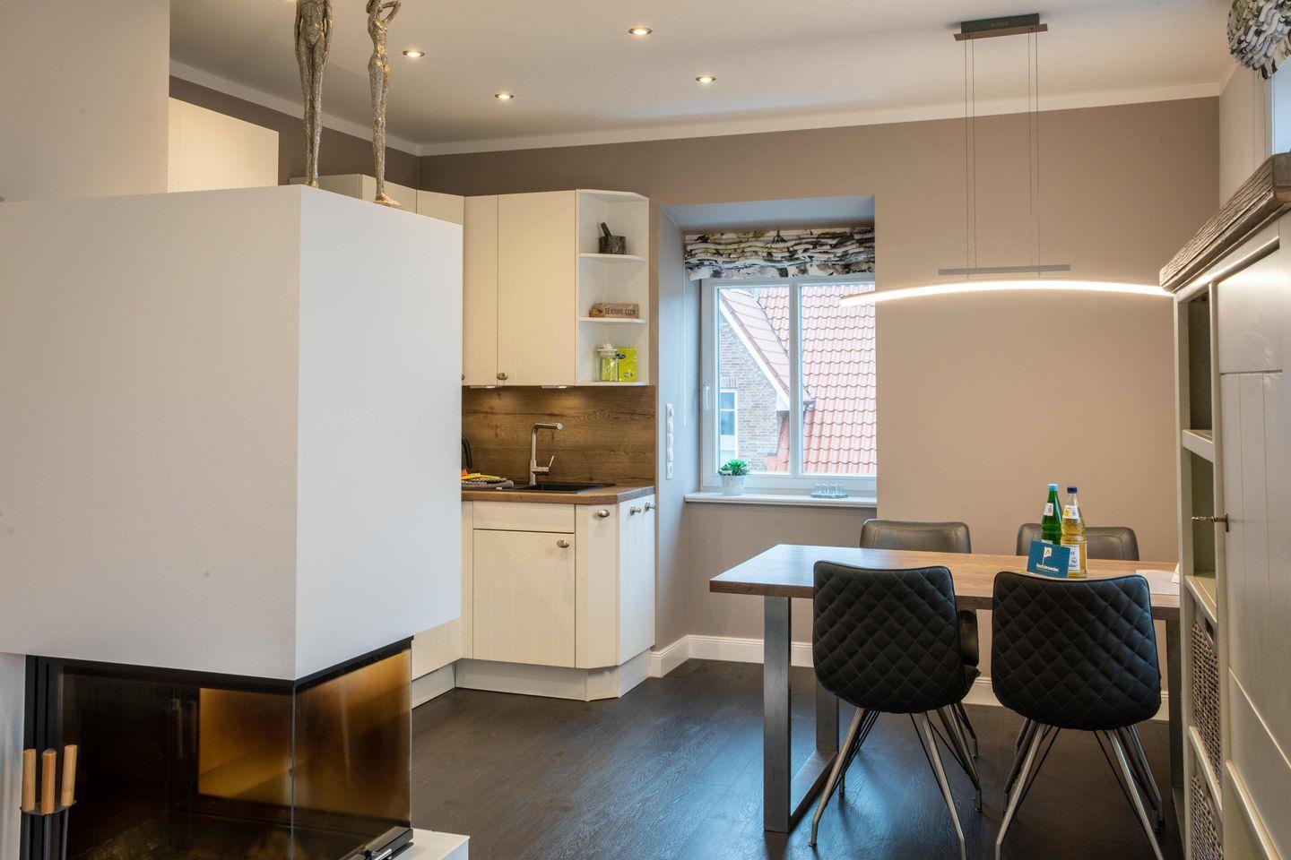 Über den separaten Eingang betreten Sie den Flur der ca. 80 m² großen Wohnung. Hier finden Jacken und Schuhe ausreichend Platz. Vom Flur aus gelangen Sie in den offenen Wohn- und Essbereich mit integrierter Küche. Das Highlight in diesem Raum ist der stilvolle Kamin, der auch an kalten Tagen für eine Wohlfühlatmosphäre sorgt.