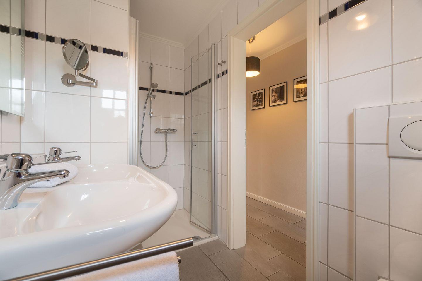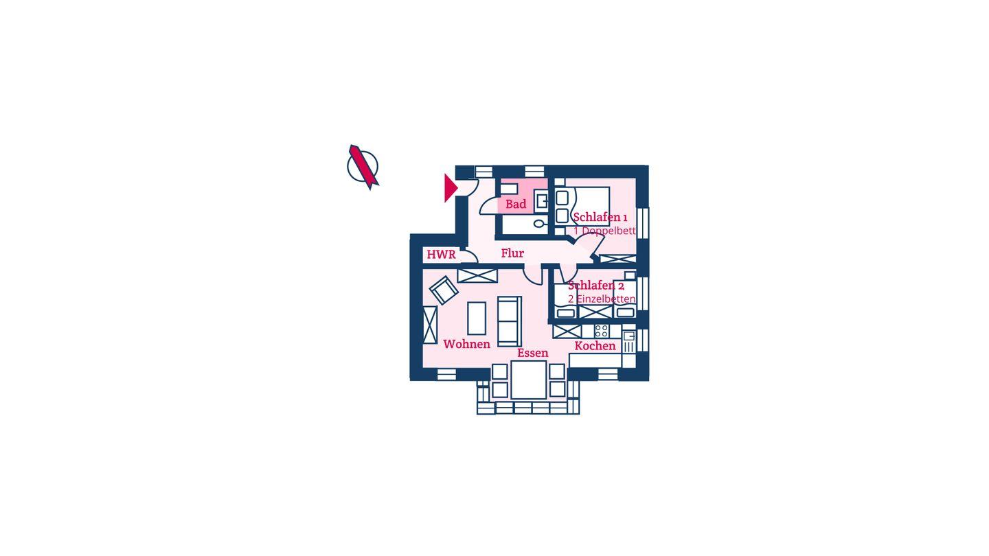 Die Ferienwohnung verfügt über einen Wohn- und Essbereich mit offener Küche, zwei Schlafzimmer sowie ein Bad mit bodengleicher Dusche. Die beiden Schlafzimmer sind ruhig seitlich des Hauses gelegen. Im ersten Schlafzimmer steht Ihnen ein Doppelbett zur Verfügung, im zweiten Schlafzimmer zwei Einzelbetten und ein eigener Fernseher.