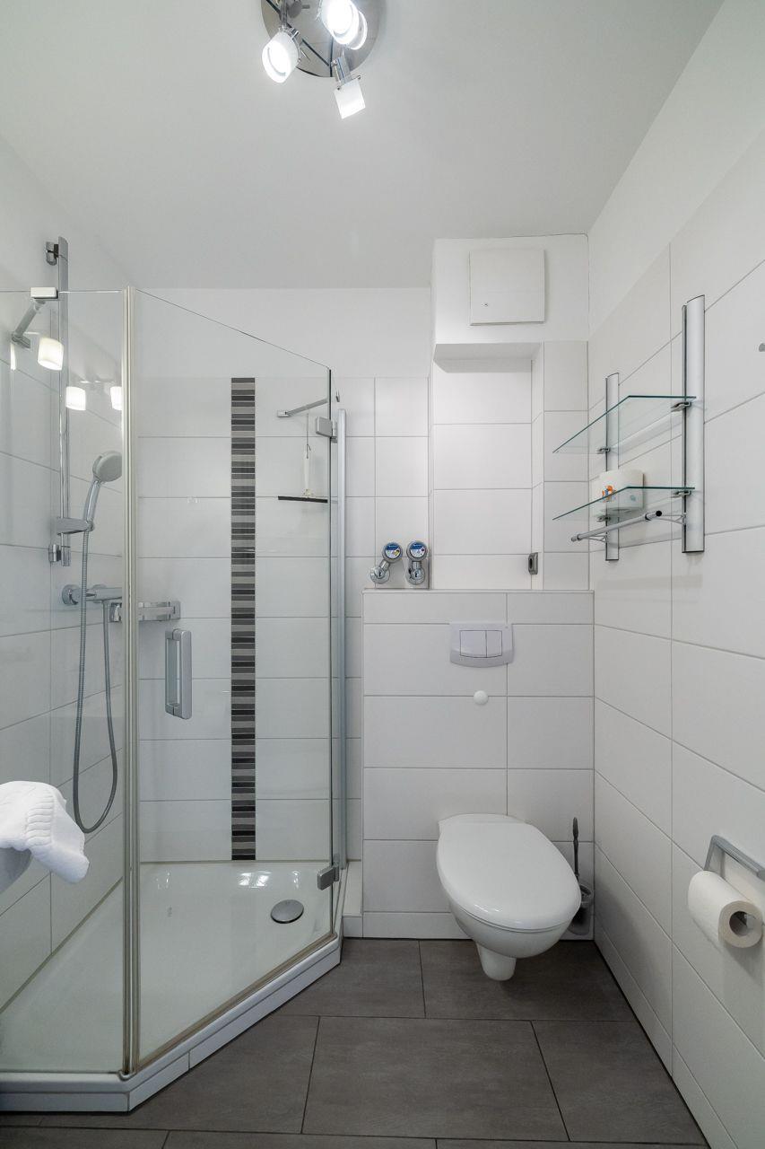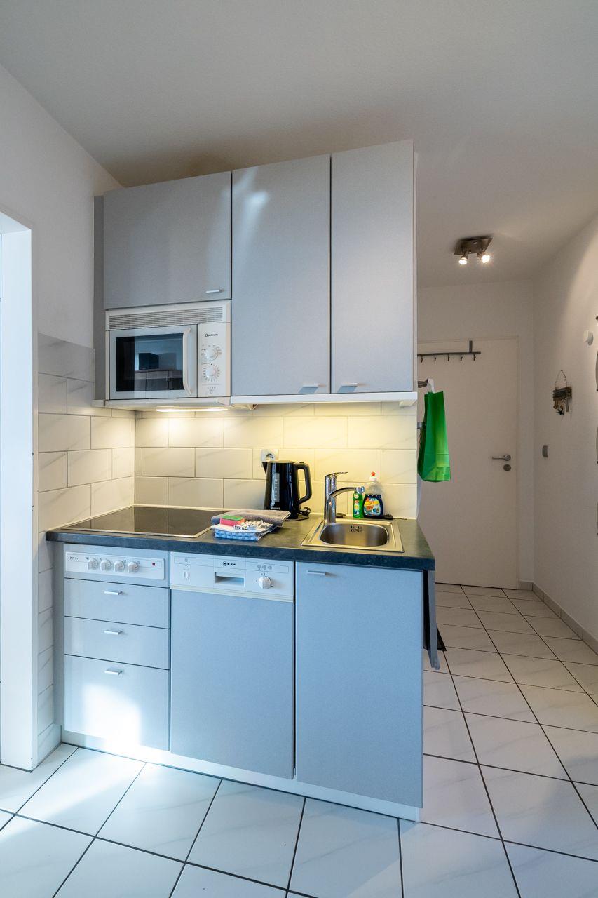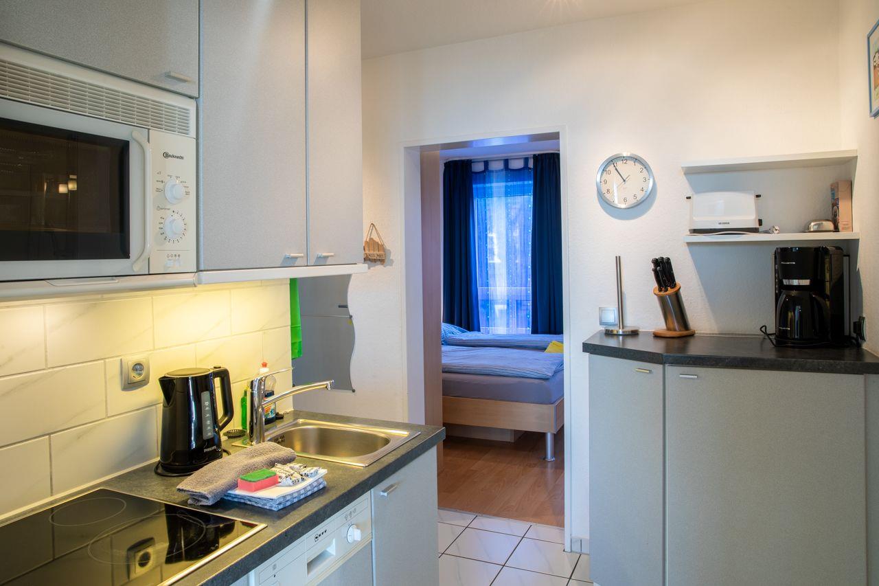 Vom Wohnungsflur zweigen ab: die praktische Küchenzeile, das großzügige Wohnzimmer und ein Schlafraum mit einem Doppelbett. Das zweite Schlafzimmer (Etagenbett zwei Mal 90*200 cm) geht vom Hauptschlafzimmer ab. Ebenso hat diese Wohnung tief herunter gezogene Fenster. Die Küchenzeile ist gut ausgestattet. Vorhanden sind: eine Mikrowelle, eine Spülmaschine und ein Cerankochfeld. Das Duschbad ist in einem neuen Zustand. Zur Ausstattung gehören: großflächige Fliesen und eine moderne Duschkabine.