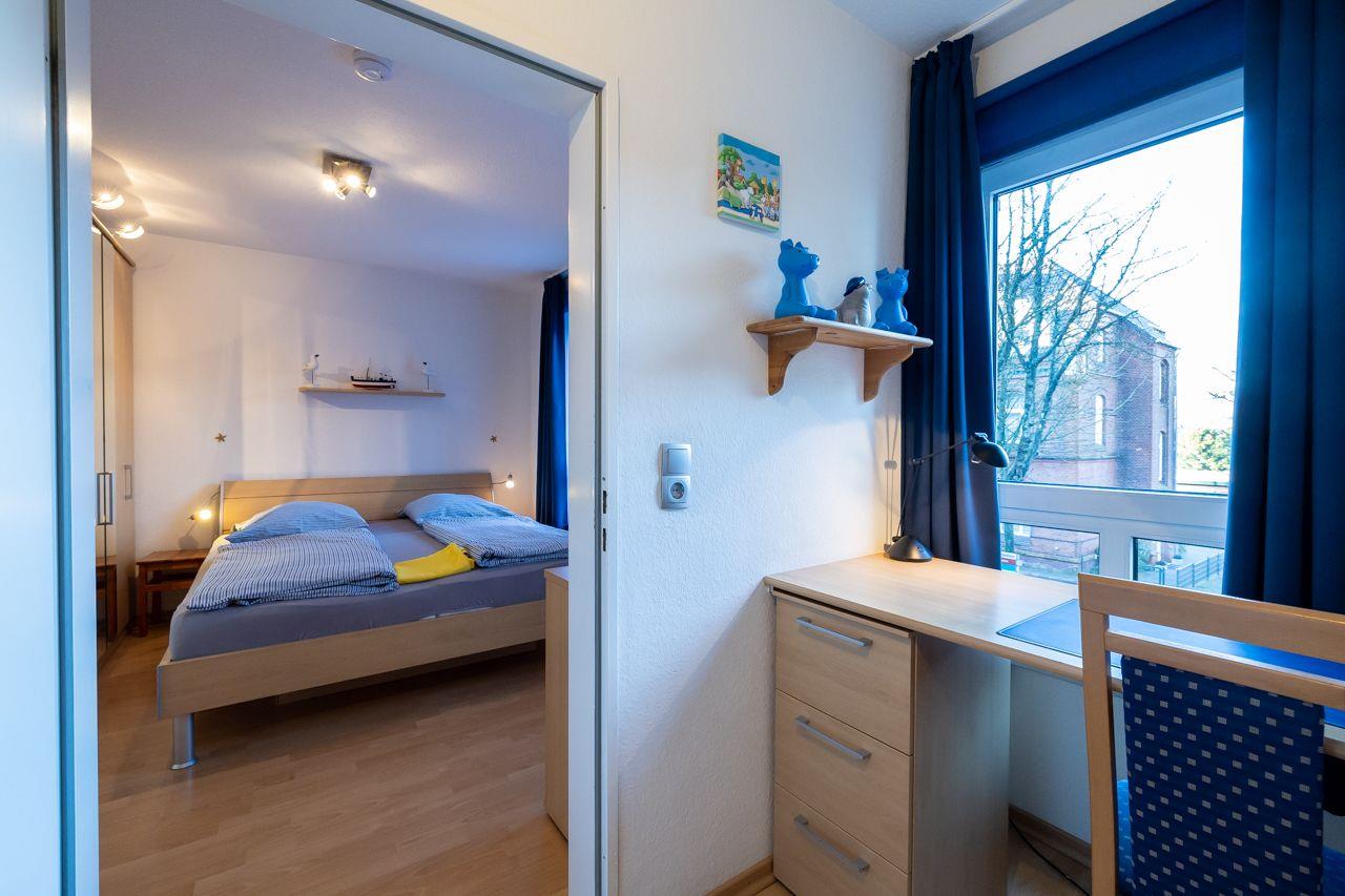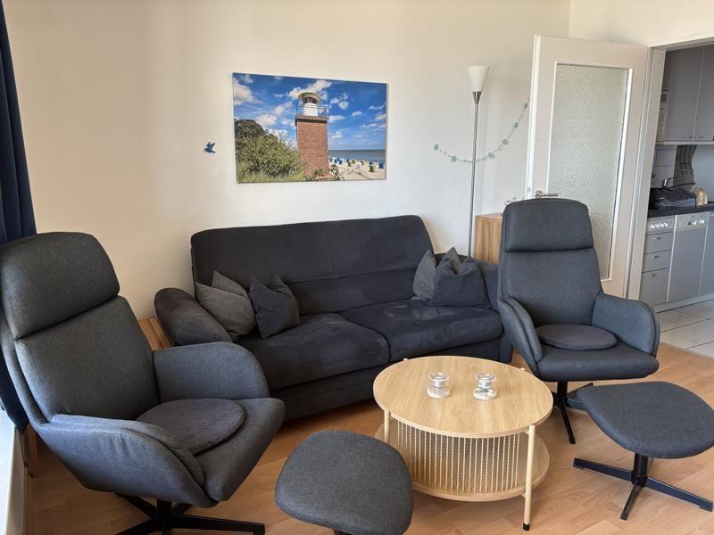 Die Wohnung selbst ist über wenige Treppenstufen erreichbar und liegt im 1. Obergeschoss. Besonders hervorzuheben ist der direkte Blick vom Wohnzimmer und Balkon auf das Meer Richtung Osten. Hier lassen sich die eigenen Kinder beim Spielen beobachten. Der Balkon ist überdacht, so dass Sie auch bei Regen draußen sitzen und den Meerblick genießen können.