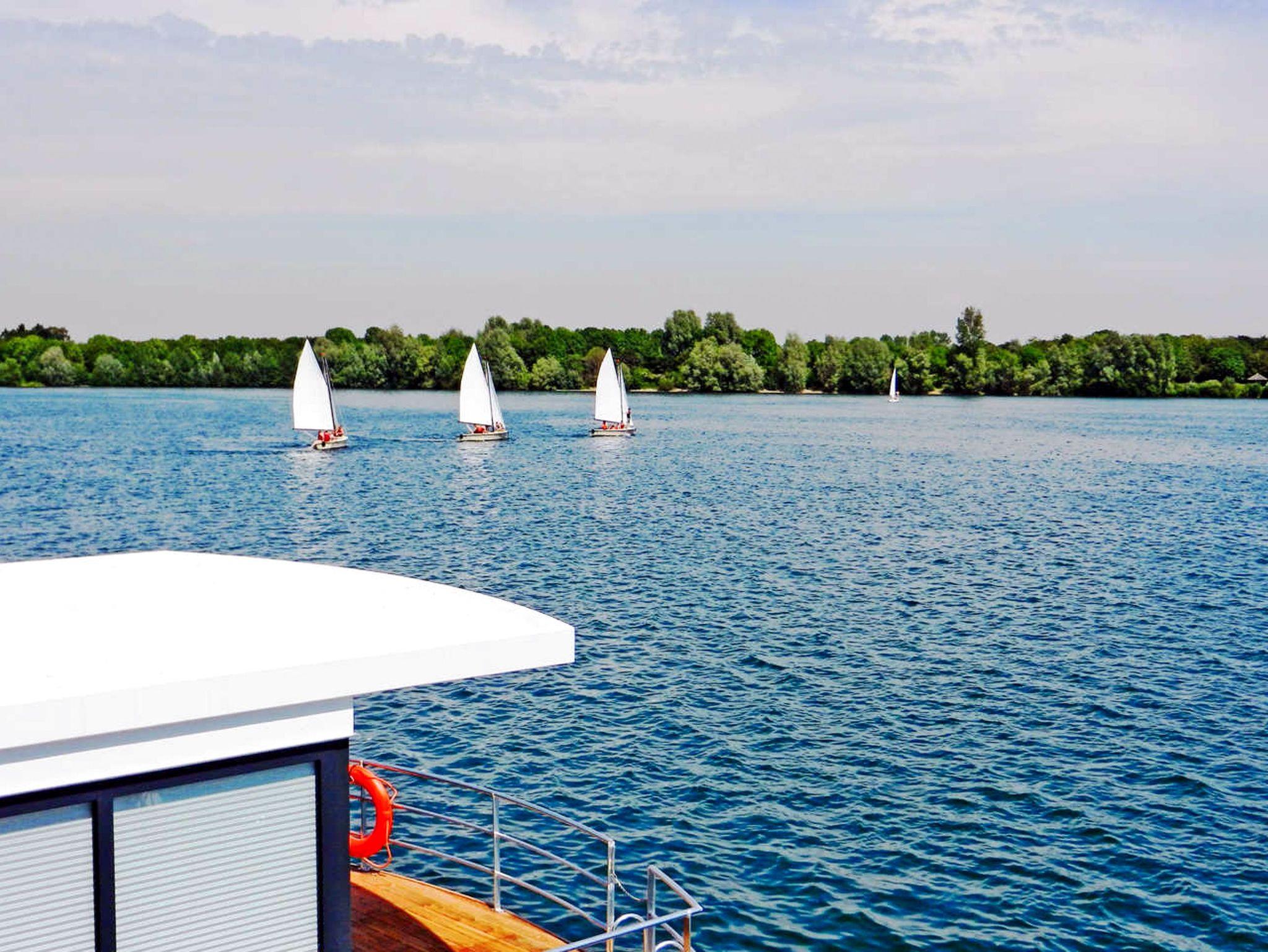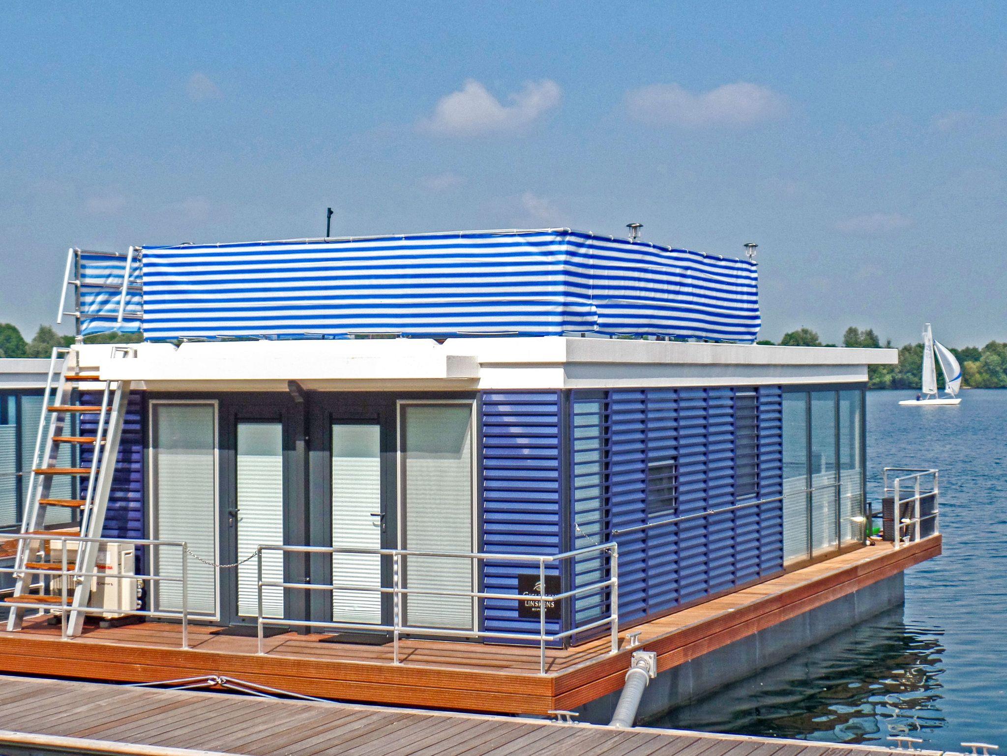 Floating Houses Xanten fünf moderne Hausboote mit je 44m² Wohnfläche, zwei Schlafzimmern und Platz für bis zu vier Personen erwarten Dich auf dem idyllischen Nordsee in Xanten. Die festliegenden Hausboote liegen an einer eigenen Steganlage im charmanten Ortsteil Vynen direkt auf dem Wasser, mitten in der grünen Seenlandschaft zwischen Nord- und Südsee. Hier genießt Du nicht nur absolute Ruhe, sondern auch das Gefühl, mitten in der Natur zu sein mit Wasser, Wellen und weitem Blick. Die Boote sind besonders hochwertig und maritim-modern eingerichtet und verfügen über zwei gemütliche Schlafzimmer mit Doppelbetten, einen lichtdurchfluteten Wohnbereich mit großen Fensterfronten und eine voll ausgestattete Küche. Der Zugang zur Bug-Terrasse mit Sitzmöbeln macht das Frühstück am Wasser zum täglichen Highlight. Oben erwartet Dich eine großzügige 25m² große Dachterrasse perfekt zum Sonnen, Entspannen oder einfach nur für die Aussicht. Eine Klimaanlage sorgt auch an warmen Tagen für angenehmes Raumklima.