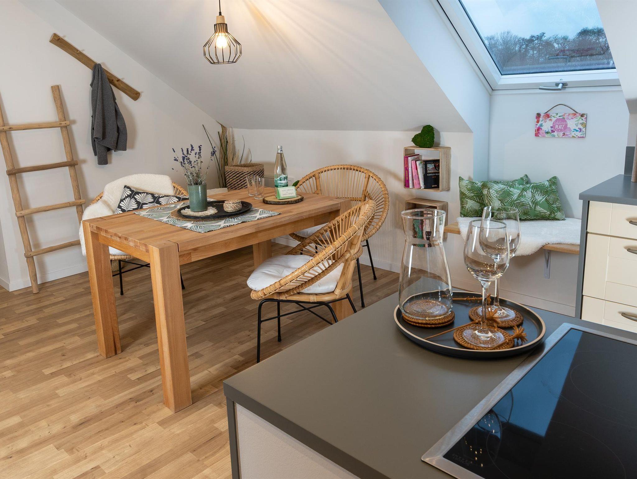 In der Ferienwohnung Libelle lädt ein gemütlicher offener Wohnraum mit Wohnküche und Leseecke zum Verweilen ein. Vom Balkon können Sie nicht nur den Blick in die Natur genießen, sondern auch dem Vogelgezwitscher und dem Plätschern des Baches lauschen. Die Wohnung bietet ein Schlafzimmer mit Doppelbett sowie ein modernes Bad. Auch hier kann auf Wunsch gerne ein Babybett zur Verfügung gestellt werden. Die Küche verfügt über eine Spülmaschine, ein Cerankochfeld mit Backofen, Kühlschrank mit Kühl-Gefrierkombination, Toaster, Wasserkocher, Kaffeemaschinen (1 x Senseo und/oder 1 x Filtermaschine) und vielem weiteren, was Sie für Ihren Urlaub benötigen.
