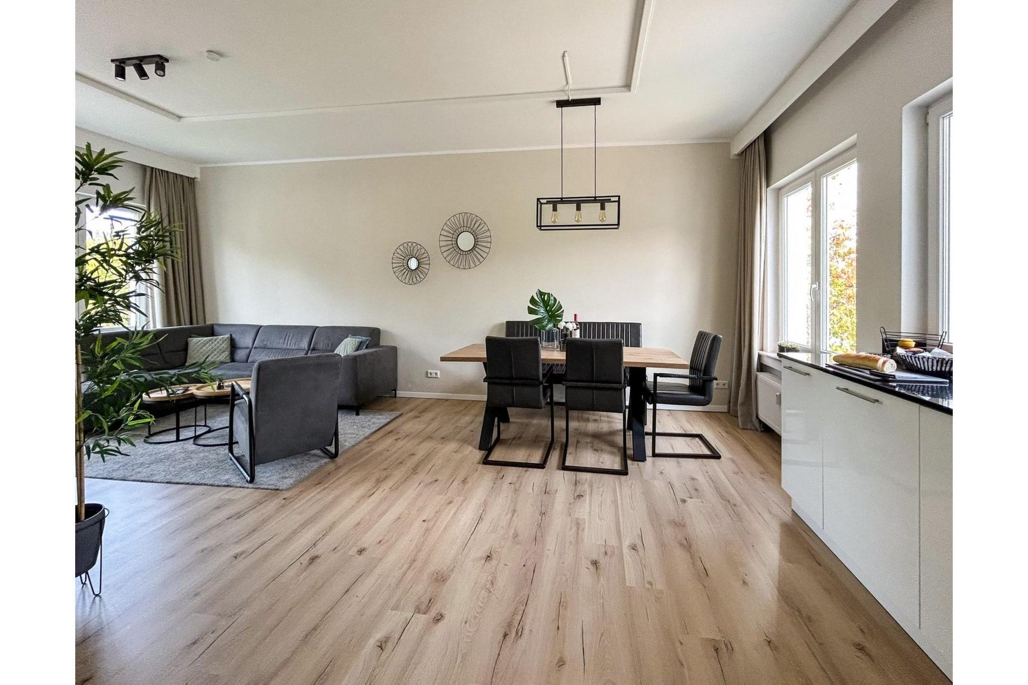 In der 2. Etage: (offene Küche(Esstisch, Wasserkocher, Kochherd(4 Kochplatten, Ceranfeld), Kaffeemaschine, Backofen, Kühl-/Gefrierkombination), Wohn/Esszimmer(TV(smart TV), Sitzecke), Schlafzimmer(Doppelbett(Boxspring, 180 x 210 cm)), Schlafzimmer(Doppelbett(Boxspring, 180 x 210 cm)), Badezimmer(Dusche, Waschbecken, Toilette, Föhn)) Waschmaschine, Balkon, Parkplatz, Hochstuhl, Handtücher/Bettwäsche (extra Gebühr)