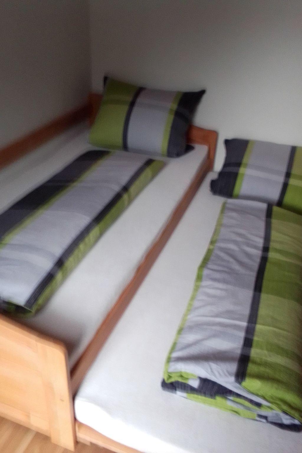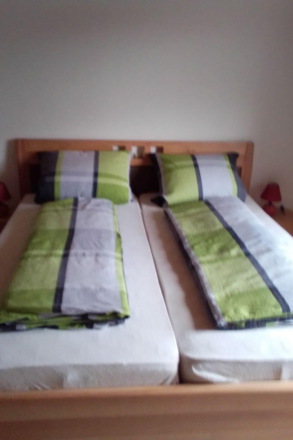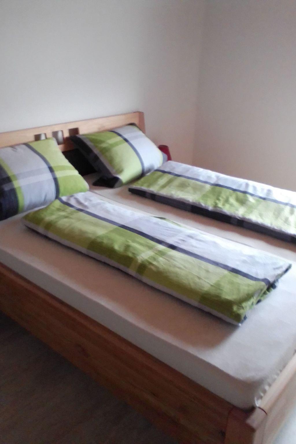 Genießen Sie eine Auszeit vom Alltag, nur zu zweit oder mit der Familie.Unsere Ferienwohnung ist 70 qm groß mit 2 Schlafzimmern, Küche, Wohnzimmer, Bad mit WC und begehbarer Dusche.Die Wohnung wurde im Jahr 2022 komplett renoviert.Die Küche ist mit einer modernen Mikrowelle und einem Kühlschrank mit Gefrierfach ausgestattet.Eine mobile Kochplatte ist ebenfalls vorhanden, sowie Kaffeemaschine, Wasserkocher und Toaster.Koch- und Essgeschirr ist ausreichend vorhanden.Im Wohnzimmer befindet sich der Essbereich mit einem großen Holztisch. Eine extra Sitzgarnitur für die kleinen Gäste ist ebenfalls vorhanden.Das Bett im Kinderzimmer ist ein Einzelbett, wo die zweite Schlafmöglichkeit bei Bedarf schnell herausgezogen werden kann.Die dritte Schlafmöglichkeit für ein Kind wäre dann eine Faltmatratze oder ein Kinderbett im Elternschlafzimmer.Ein Balkon und ein Garten direkt vor der Wohnungstür gehört ebenfalls zur Wohnung. Im Garten können Sie grillen, die Kinder spielen oder auch einfach nur entspannen, da hier keine Straße vorbeigeht.