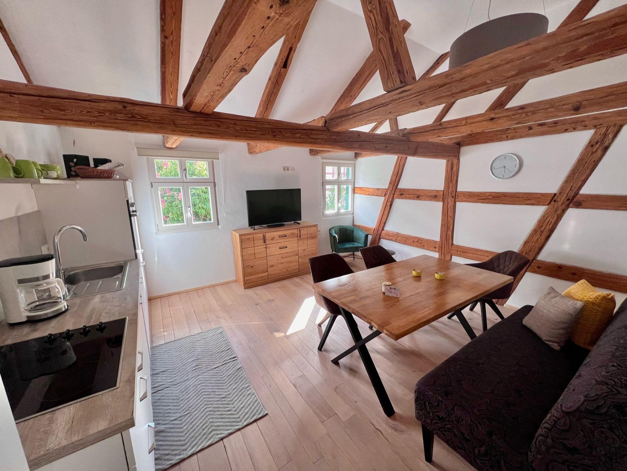 Hohe Räume mit frei gelegtem altem Gebälk geben dieser Wohnung die ganz besondere Note.