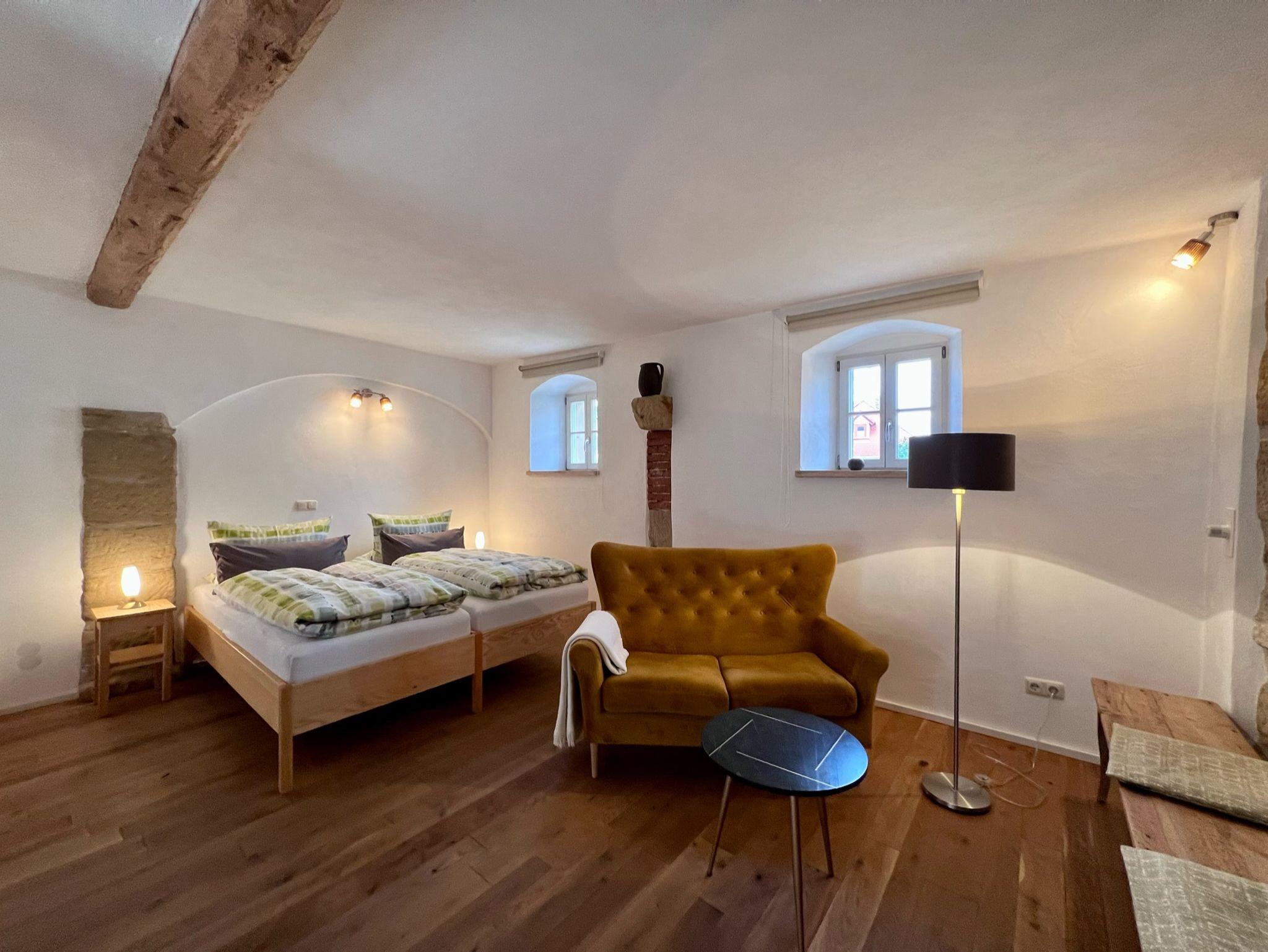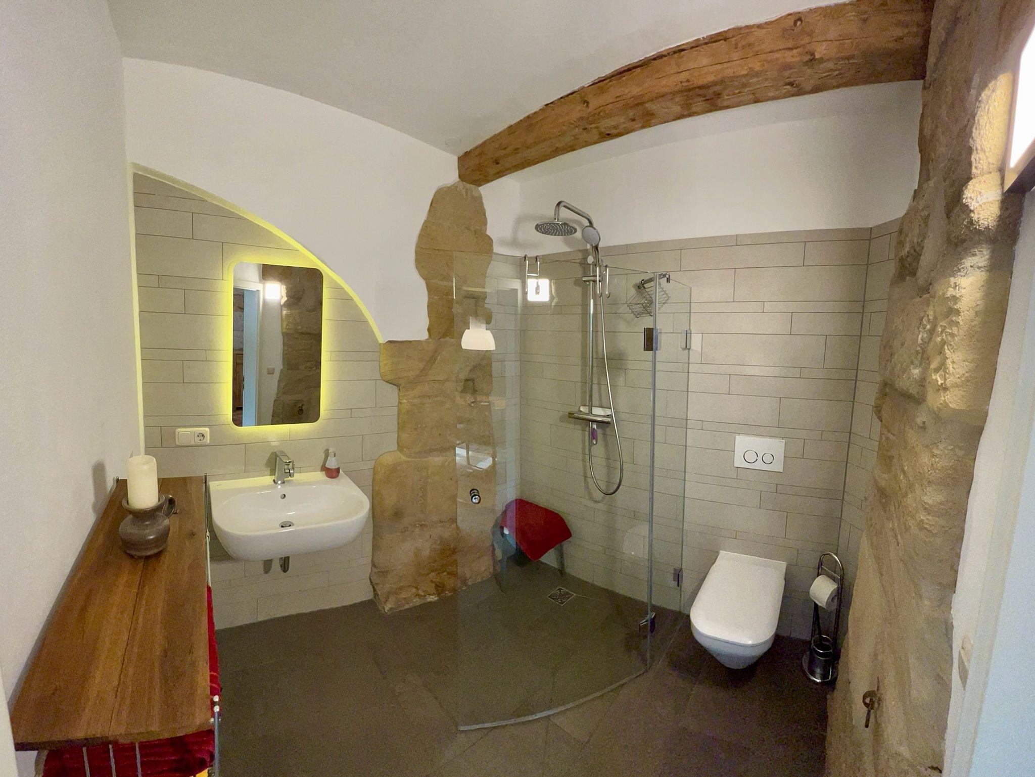 Das Denkmal geschützte Anwesen wurde in den letzten Jahren neu aufgebaut und mit Detailversessenheit liebevoll renoviert. Die Sanierungsmaßnahmen sind mit biologischen Baumaterialien unter Berücksichtigung Denkmal pflegerischer Gesichtspunkte ausgeführt worden. Dadurch wurde ein einzig artiges Raum- und Wohnklima geschaffen. Die frei gelegten Sandsteinwände und das bis in die Dachspitzen offene Gewölbe verleiht den Wohnungen die Einmaligkeit.