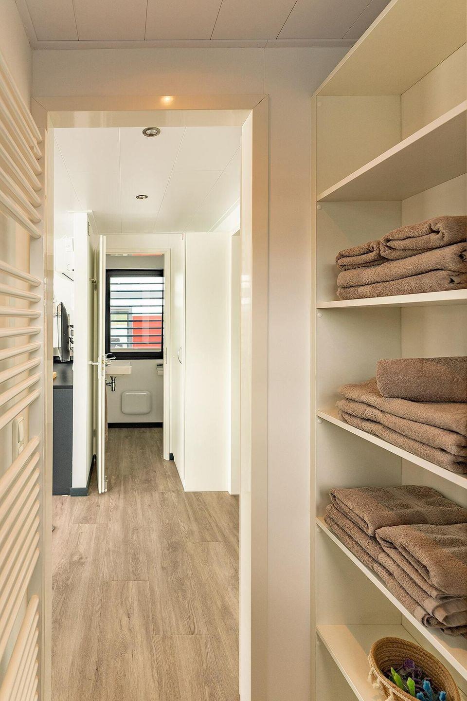 Der Wohnbereich ist als gemütliches Wohnzimmer mit Sofaecke und Esstisch gestaltet und wird durch eine offene Küche ergänzt. Für angenehmes Raumklima sorgen Klimaanlage in allen Aufenthaltsräumen sowie eine Elektroheizung; zusätzlich schafft der Kaminofen eine behagliche Atmosphäre, besonders an kühleren Tagen. WLAN, TV und Radio stehen für Ihre Unterhaltung bereit. Fliegengitter, Sonnenschutz und Sichtschutz für alle Fenster erhöhen den Komfort und die Privatsphäre.