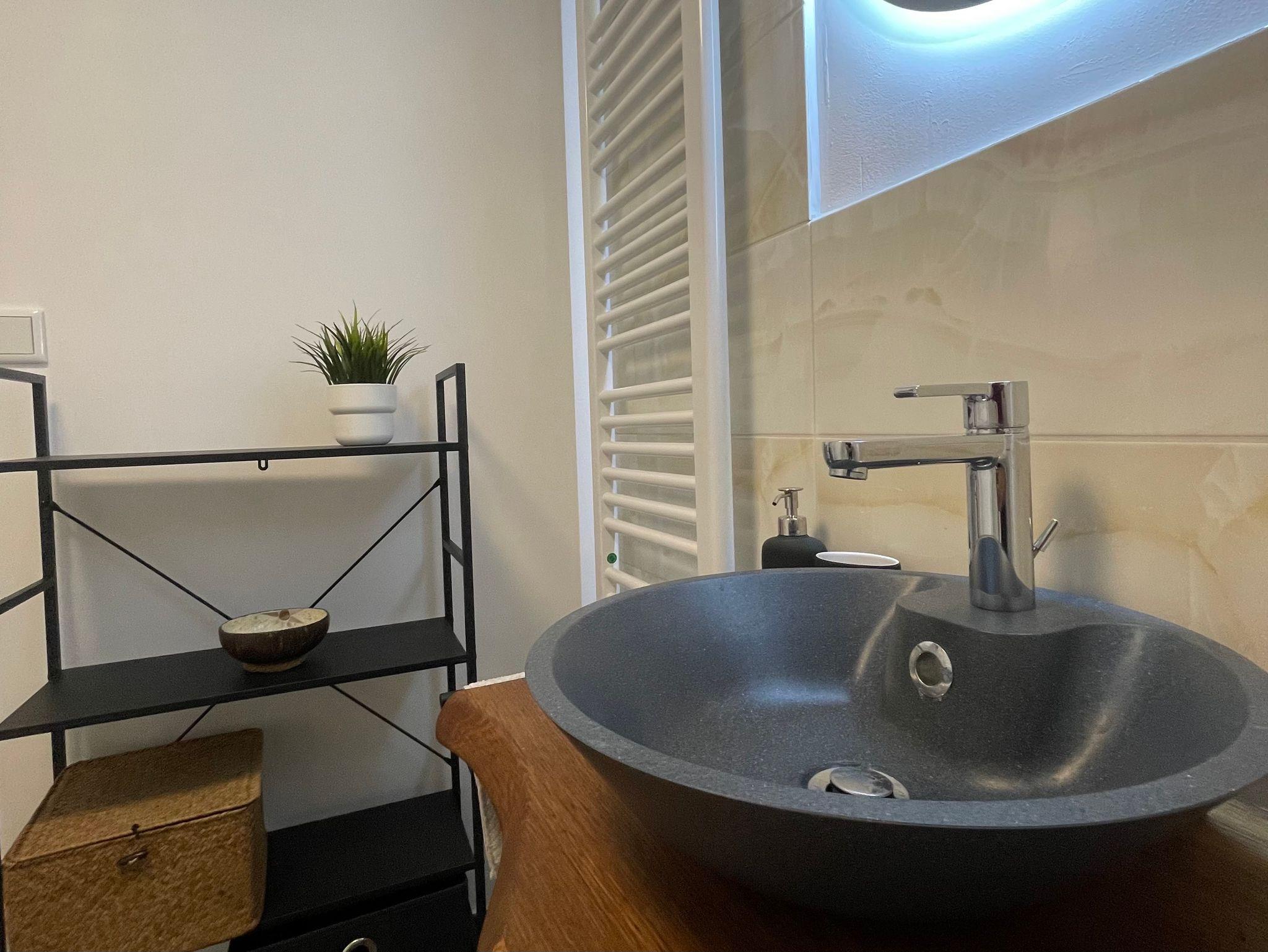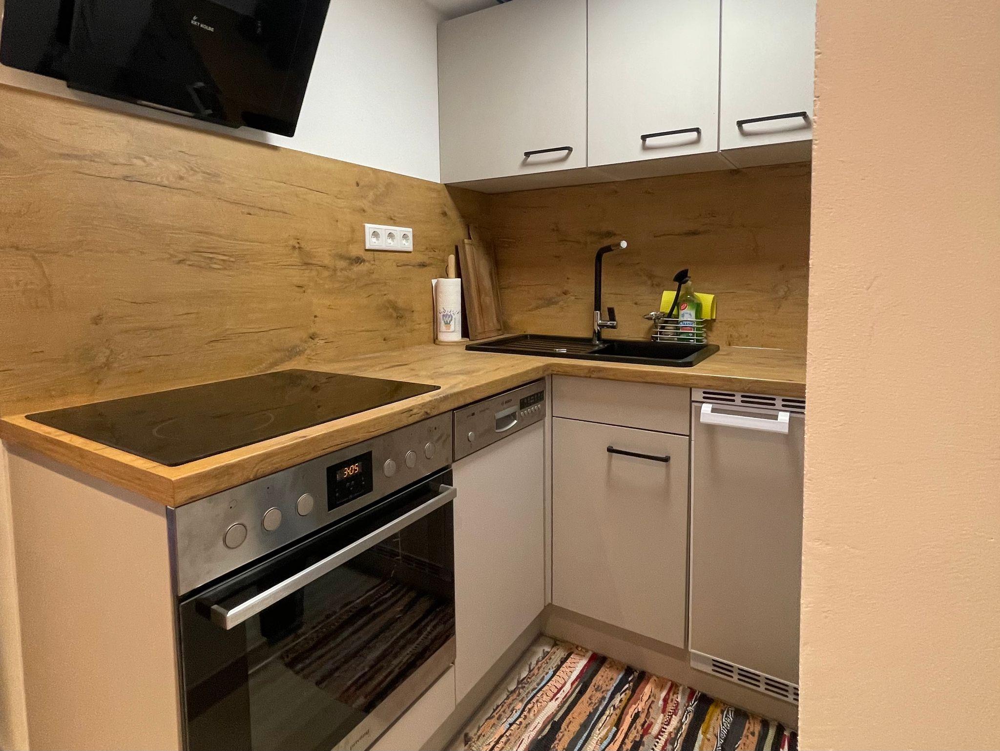 Unsere Wohnung bietet Platz für bis zu vier Personen und ist voll möbliert. Sie verfügt über ein gemütliches Doppelbett sowie eine große Schlafcouch im Wohnzimmer. Die Küche ist mit allem ausgestattet, was Sie für einen komfortablen Aufenthalt benötigen: Toaster, Mikrowelle, Wasserkocher, Kaffepadmaschine, Spülmaschine und Backofen. Der Wohnbereich ist mit einem Fernseher, einer Auswahl an Spielen und einer Nintendo Switch ausgestattet.