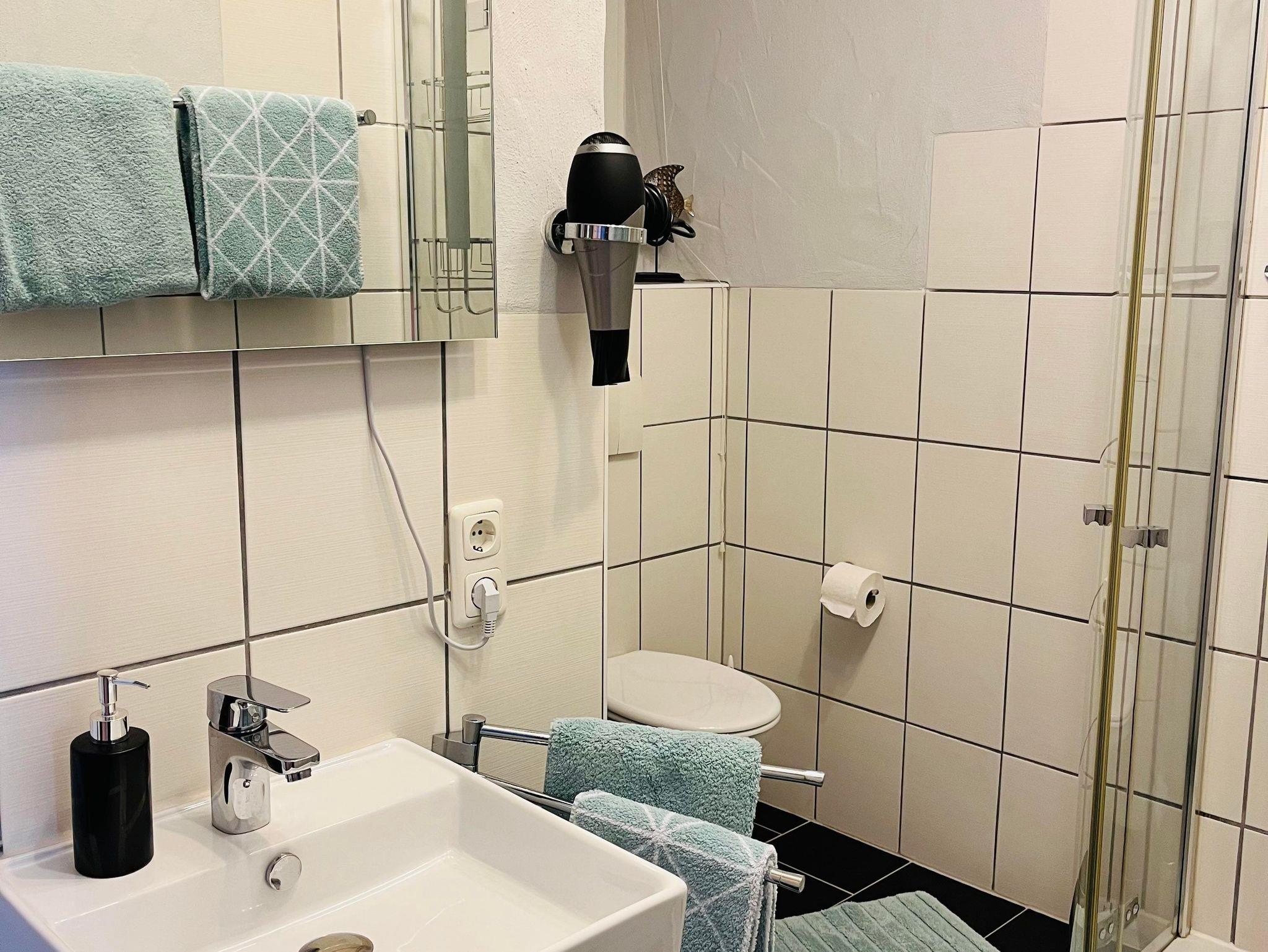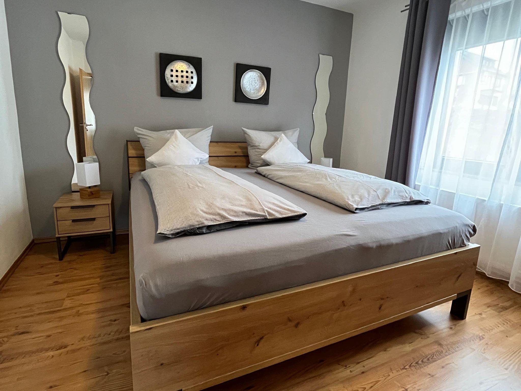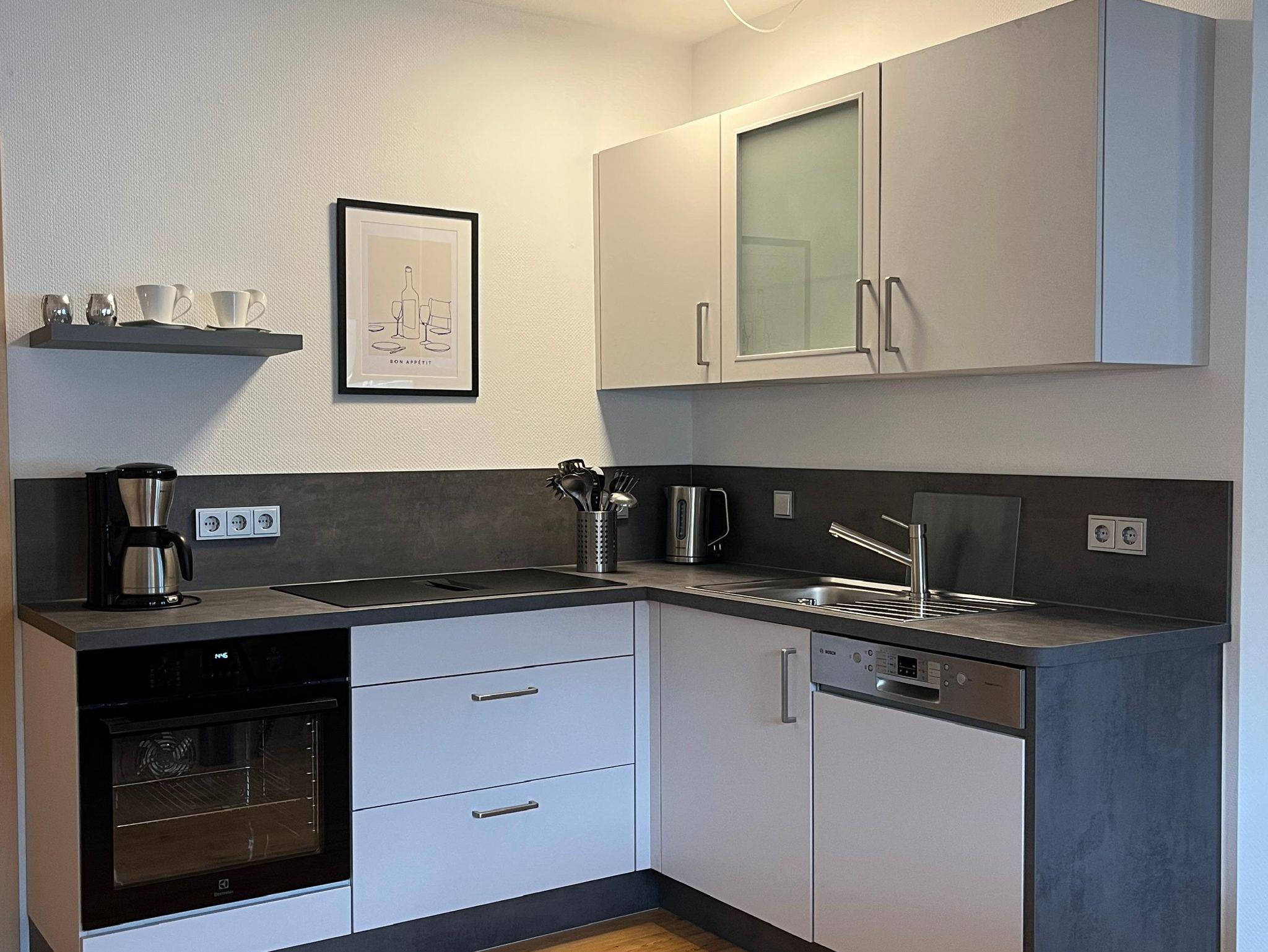 Helle, modern eingerichtete Ferienwohnung mit Balkon 48 qm für 2 Personen. Offener Wohnraum, separates Bad und Schlafzimmer.