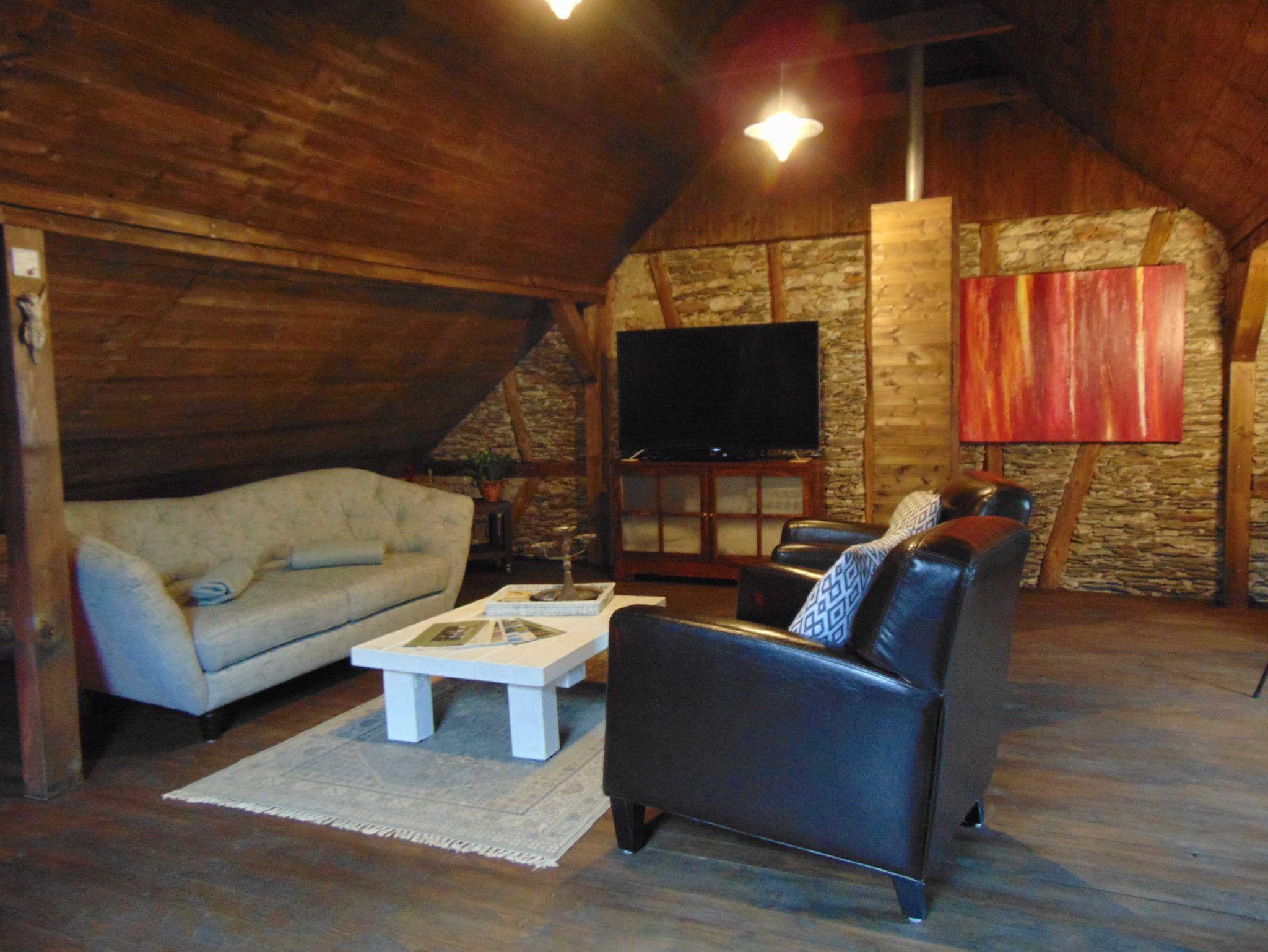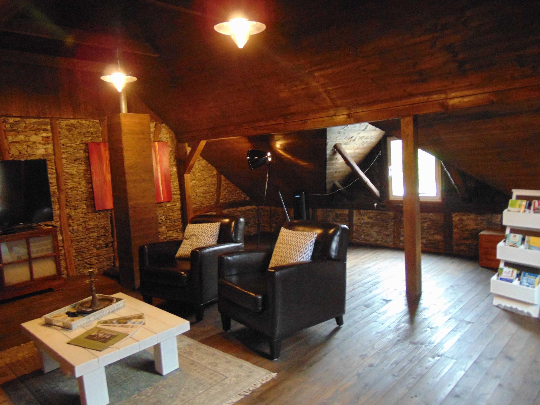 Im Dachgeschoss befindet sich ein Studio dort befinden sich ein großer Fernseher, eine Stereo- Anlage, 2 Leder- Couchen, 2 Ledersessel und ein Wohnzimmertisch.