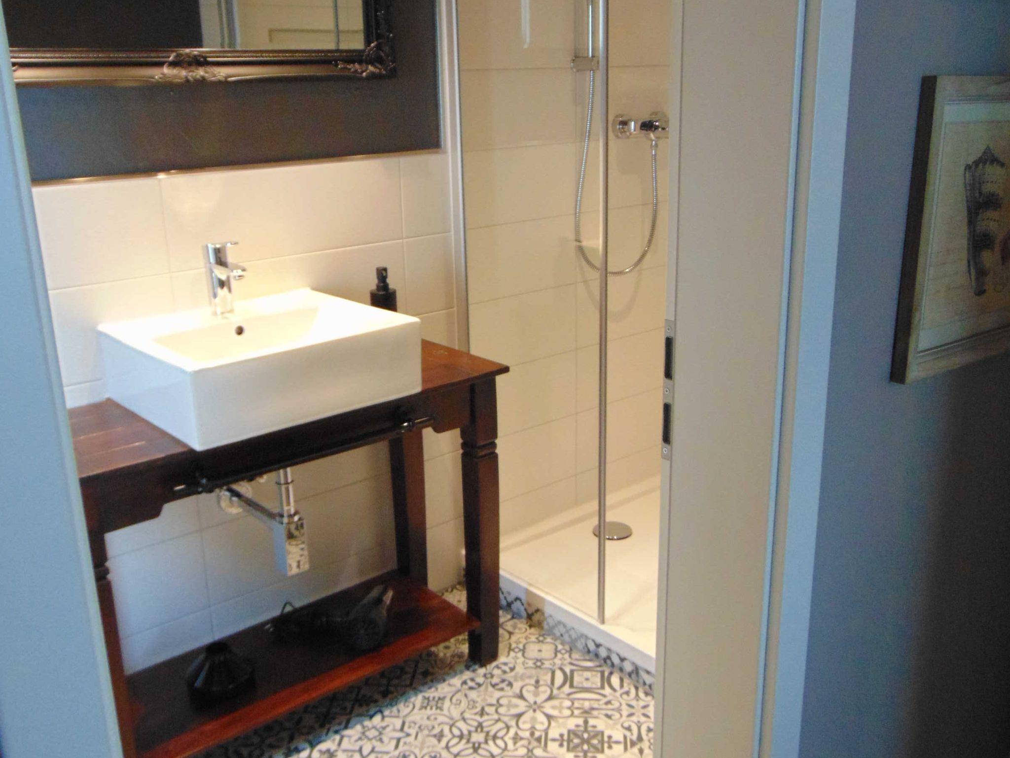 Im Obergeschoss befinden sich 2 Schlafzimmer. Das kleinere hat ein Boxspringbett für 2 Personen, das größere der beiden Schlafzimmer hat ein Doppelbett mit einem Kleiderschrank und es gibt einen Fernseher. Das Badezimmer ist mit einer Dusche, Waschbecken und einem WC ausgestattet.