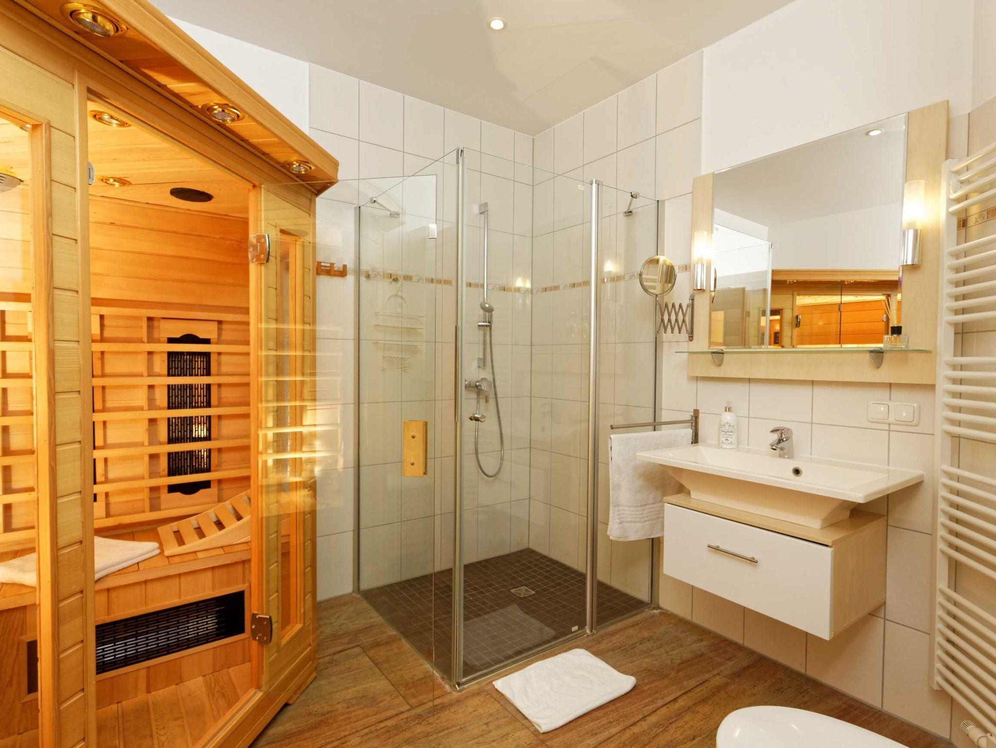 Exklusive Dachgeschoßwohnung „Ostseeblick“ mit Eck-Terrasse, Kamin und Infrarotsauna. Die Wohnung ist sehr hochwertig ausgestattet mit italienischen Bodenfliesen, Kamin, Fußbodenheizung u.v.m. Das Bad ist mit einer bodengleichen Dusche ausgestattet.