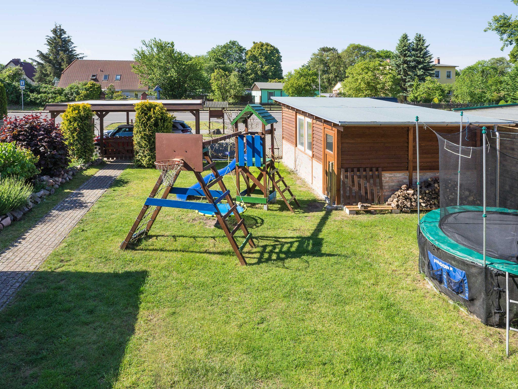 Spielplatz auf dem Grundstück: Turm mit Rutsche, Doppelschaukel und Riesentrampolin(3m), Baskettballkorb; Spieleschrank mit div. Bällen, Malkreiden, Federballset,