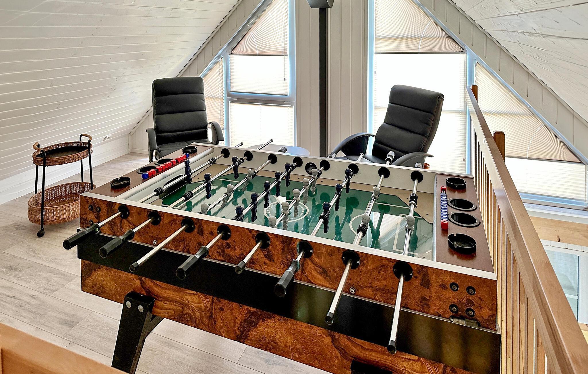 Das Ferienhaus verfügt über eine moderne Einbauküche mit angrenzendem Ess- und Wohnbereich. Dieser lädt zu einem gemeinsamen Essen und angenehmen Gesprächen ein. Auf der Galerie im ersten Obergeschoss können Sie durch die bodentiefe Panoramaverglasung einen einzigartigen Blick über das Grundstück und in die Natur genießen. Auch zu Tischfußballturnieren können Sie sich herausfordern.