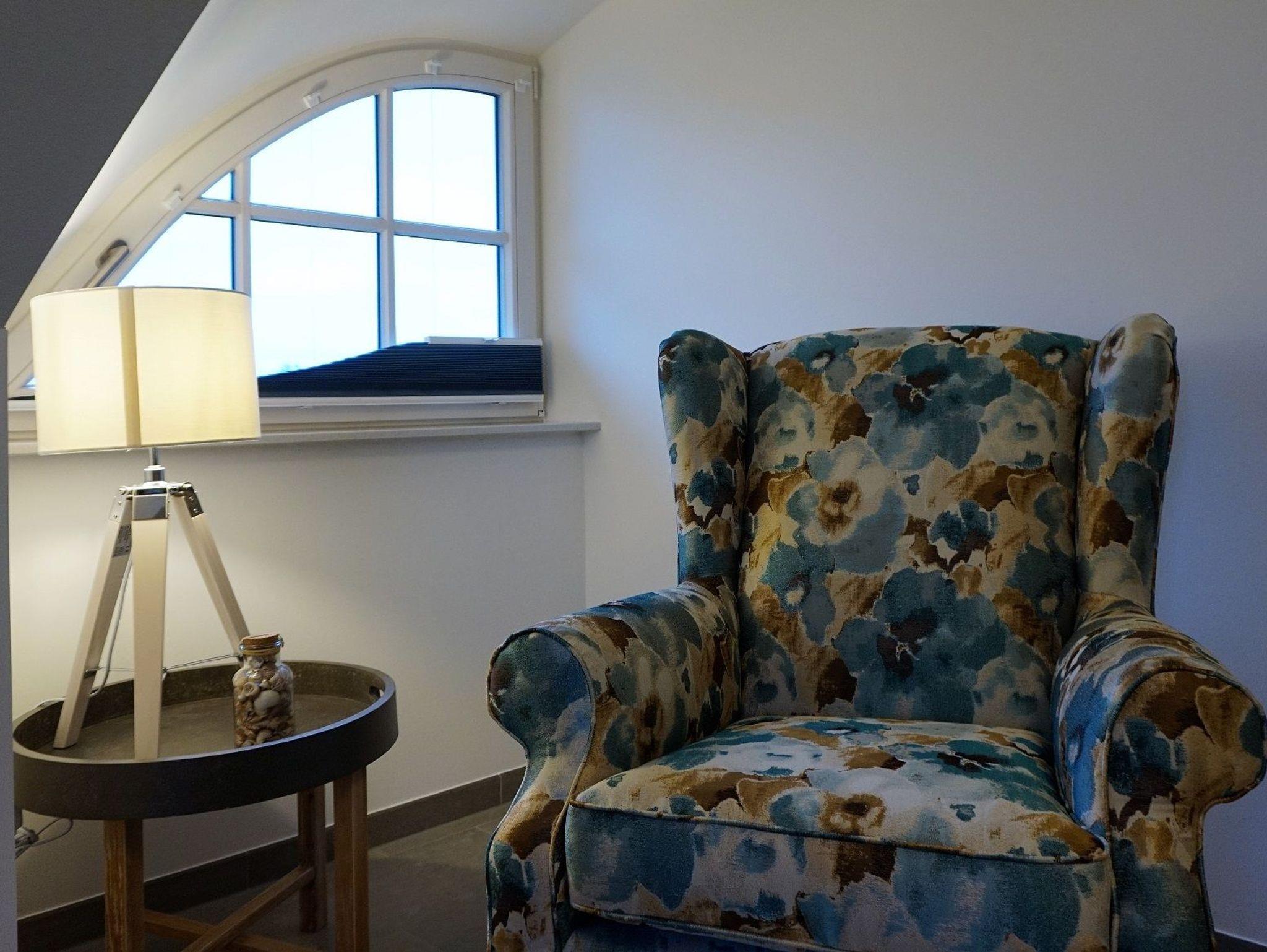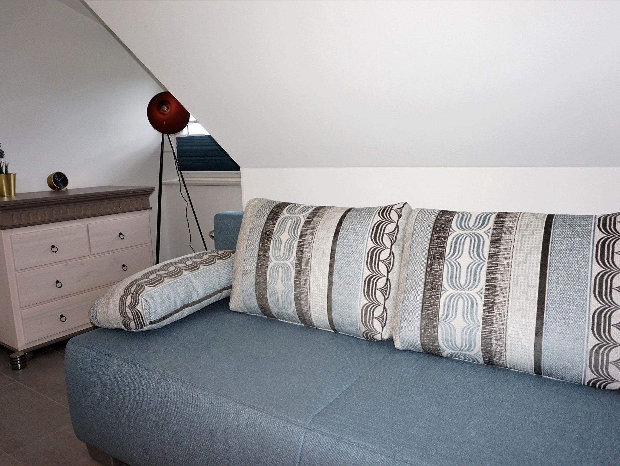 Im Obergeschoss befinden sich die drei Schlafzimmer. Sie sind mit Vollholzmöbel[nbsp]hell eingerichtet. Zwei Schlafzimmer sind mit je[nbsp]einer Schlafcouch und einer Kommode sowie TV eingerichtet - ideal für Ihre Kinder![nbsp] Für die Kleinen Gäste stehen Kinderhochstuhl, Kinderreisebett und Treppenschutzgitter bereit! Eine Kleinkindausstattung für das Badezimmer ist vorhanden. Das große Elternschlafzimmer ist mit einem Doppelbett, Kleiderschrank, Lesesessel und TV / Play-Station 4 inkl. Spielen ausgestattet. Das Vollbad im Obergeschoss verfügt über eine Wanne und der bodentiefen Dusche mit Echtglasabtrennung. Dort finden Sie ebenfalls einen Handtuchheizung, Waschbecken und Föhn - so kann der Tag starten. Der Außenbereich ist komplett eingezäunt und die Terrasse ist zur Westseite ausgerichtet. Hier können Sie sonnige Stunden genießen oder Grillabende mit Ihrer Familie oder Freunden einplanen. Ein fest stehender Grill steht bereit. Genießen Sie die Sonnenstunden auf den Gartenliegen oder im hauseigenen Strandkorb. Vor dem Haus sind zwei Parkplätze. Mitgebrachte Fahrräder können Sie im hauseigenen Abstellschuppen einschließen.