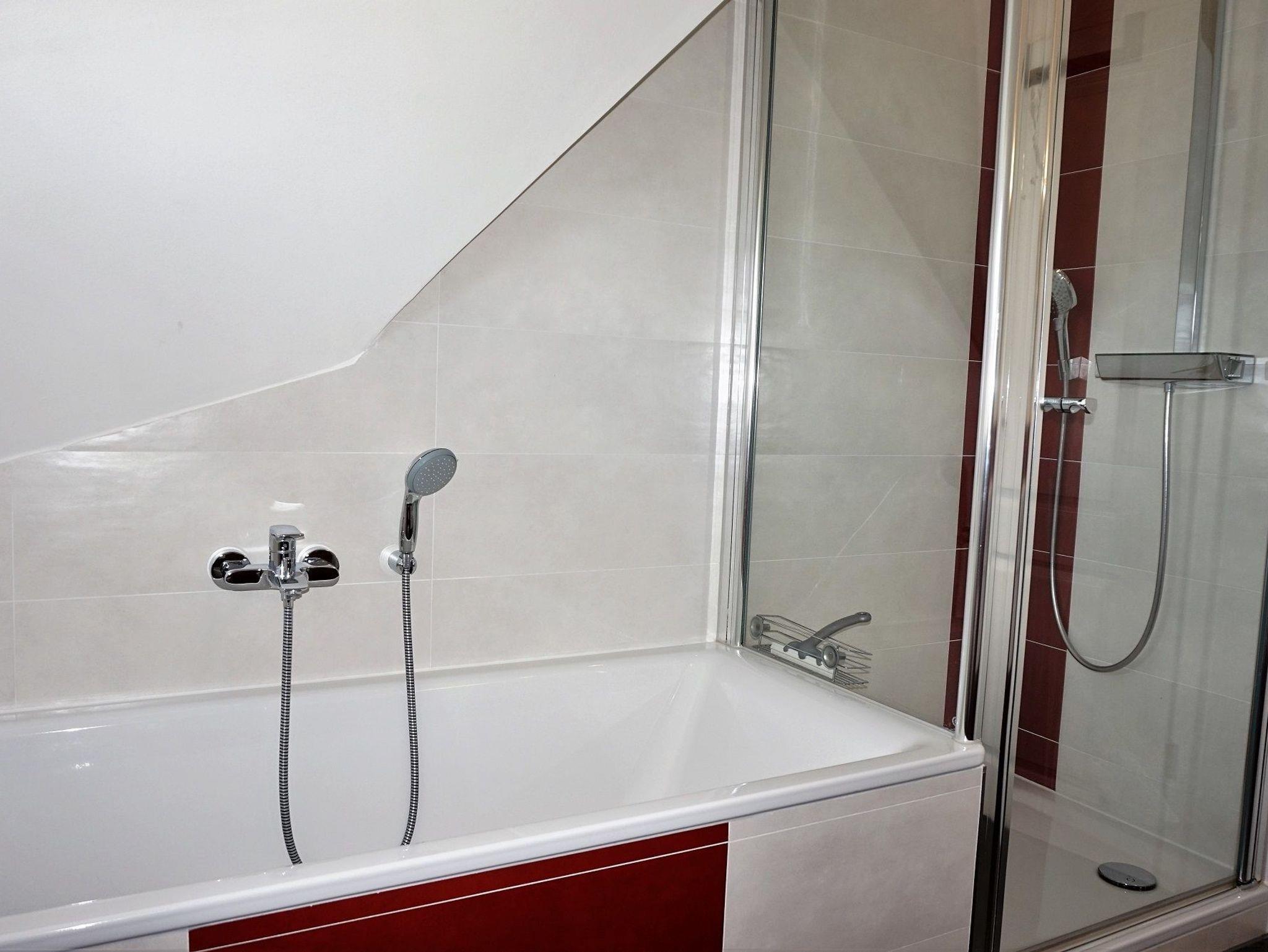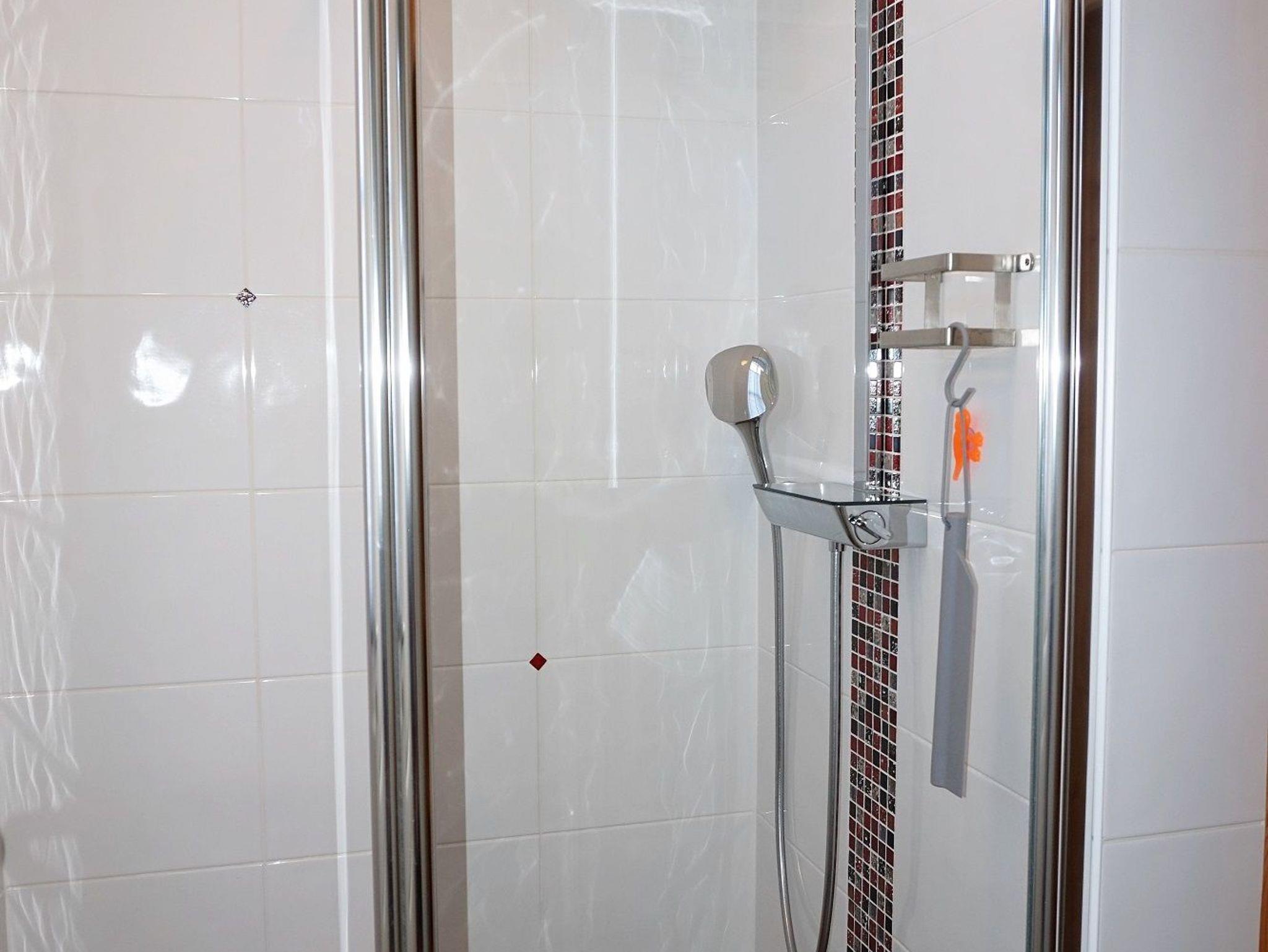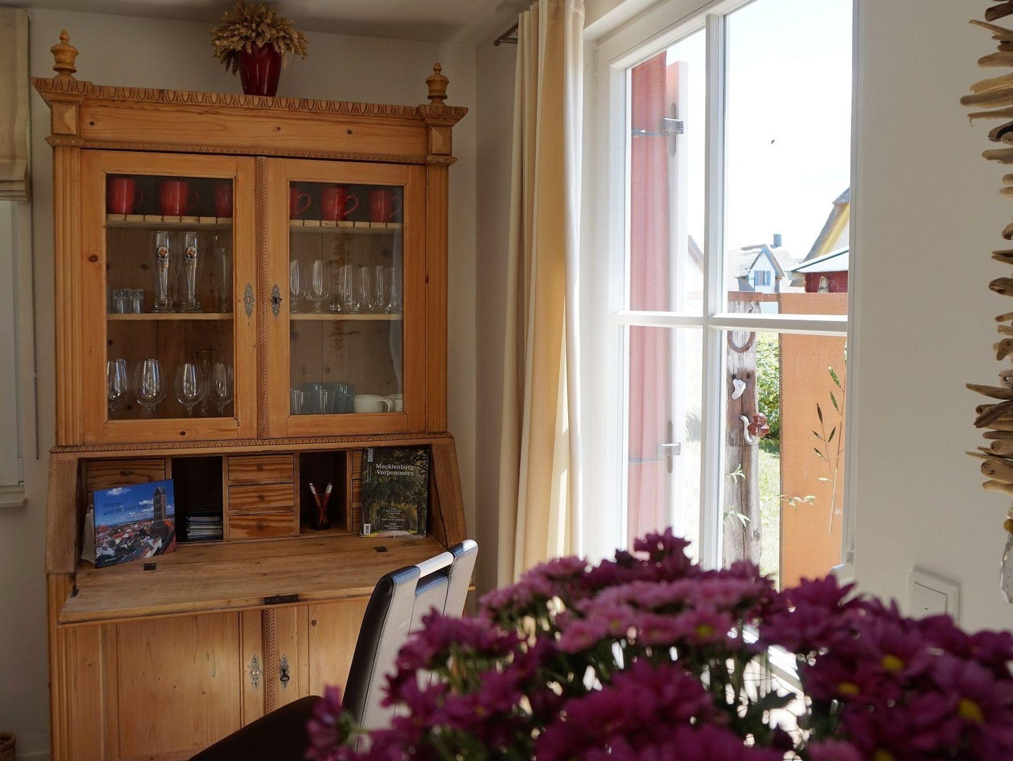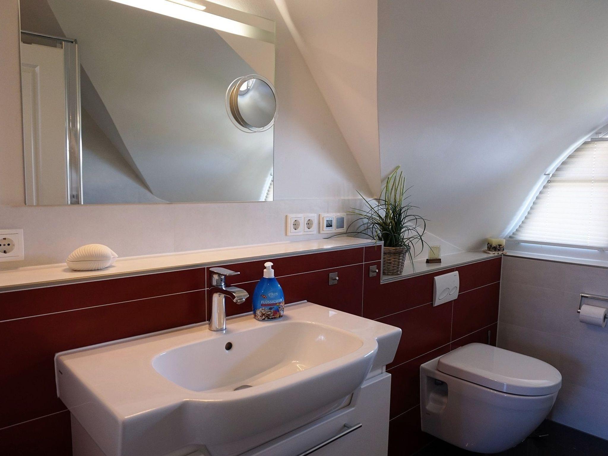 Für den Hund steht ein Lederkorb und Hundenäpfe unter der Treppe. Bitte lassen Sie den Vierbeiner im Erdgeschoss! Ein Gäste-WC mit Tageslicht befindet sich zudem im Erdgeschoss. Zwei separate Schlafzimmer sowie ein hochwertiges Vollbad sind im Obergeschoss vorhanden. Im Elternschlafzimmer befinden sich ein großer eingebauter Kleiderschrank mit 2. TV und Doppelbett. Von hier aus haben Sie einen wunderbaren Blick auf die Ostsee. Im Kinderschlafzimmer sind drei Einzelbetten nutzbar. Ein Kinderreisebett steht bereit. Ihr Urlaub kann direkt beginnen - die Bettwäsche ist bei Anreise bereits bezogen und Handtücher liegen bereit. Im Haus sind Fliegenschutzgitter und Gardinen bzw. Pliesses als Sichtschutz angebracht. Im Hauswirtschaftsraum stehen eine Wasch- Trocknerkombi und ein Bügelbrett/Bügeleisen sowie Putzutensilien bereit. Ein Safe für Ihre Wertsachen ist vorhanden. Vor dem Ferienhaus können Sie zwei PKW`s abstellen.