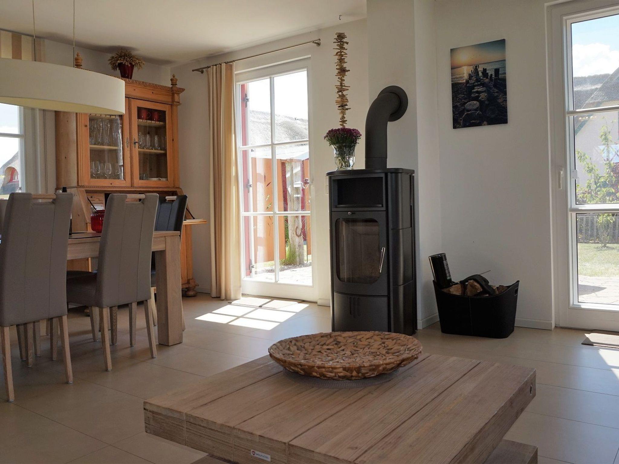 Das Ferienhaus ist eingezäunt und der große sonnige Garten lädt zu gemütlichen Stunden am Haus ein. Genießen Sie Ihren Urlaub in den zwei Strandkörben oder auf der Sonnenliege. Die Gartenmöbel auf der überdachten Terrasse bieten eine schöne Sitzgelegenheit z. B. für ein Frühstück am Morgen. Als kleines Highlight steht eine kleine Zapfanlage im HWR. Lassen Sie den Urlaubstag mit einem frisch gezapften Bier und leckeren Speisen vom Grill ausklingen. Die Terrasse ist mit Sichtschutz abgegrenzt und ein feststehender Grill sowie Abstellschuppen für mitgebrachte Fahrräder stehen bereit. Kleine Strandpiraten können kostenfrei den hauseigenen Bollerwagen nutzen. Im Haus erwartet Sie eine exklusive Ausstattung. Der sehr großzügig und hell gestaltete Wohnraum erstreckt sich über zwei Ebenen auf ca. 97m² und bietet Platz für bis zu 5 Personen. Die moderne Ausstattung des Hauses wird Sie begeistern. Der Essbereich im Wohnzimmer bietet bis zu 5 Personen viel Platz zum Speisen und spielen. Ein Kinderhochstuhl steht für kleine Gäste bereit. Die Küchenzeile ist sehr gut mit Geschirrspüler, Kühlschrank, Herd, Mikrowelle, Nespressomaschine, Waffeleisen und Mixer ausgestattet und besticht durch die Hochglanzoptik. Der Kaminofen bringt an kühleren Tagen wohlige Wärme ins Haus. Nach einem langen Strandspaziergang können Sie in der Sauna mit Dusche entspannen. Auf den beiden Sofas können Sie es sich mit einem Buch oder vor dem schwenkbaren TV gemütlich machen. Viele Bücher, Spiele, Umgebungs- und Radkarten, DVD`s und etwas Kinderspielzeug stehen Ihnen für einen unbeschwerten Urlaub zur Verfügung.