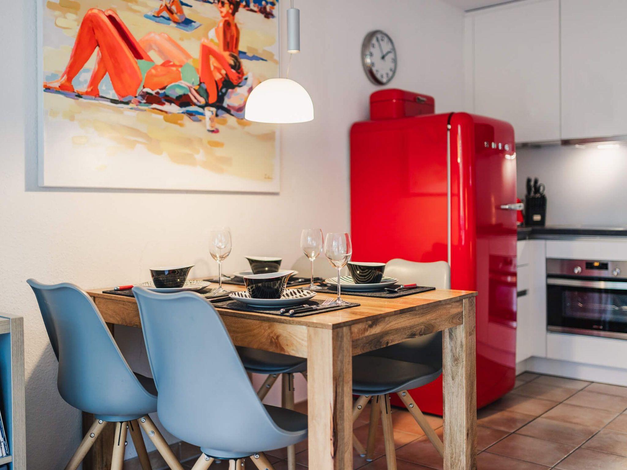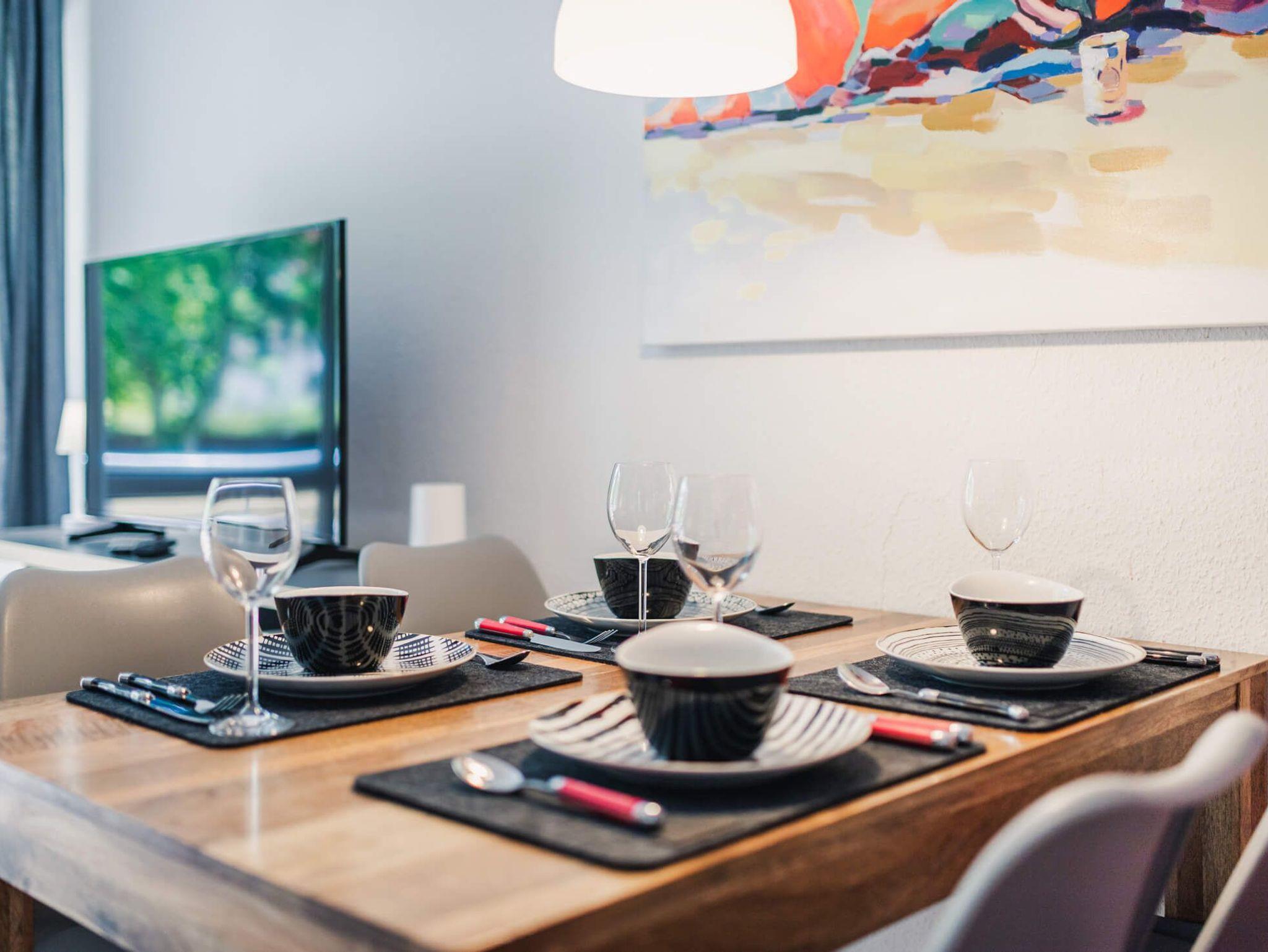 Das Wohnzimmer ist der perfekte Ort, um sich nach einem Tag voller Aktivitäten zu entspannen. Hier können Sie auf dem bequemen Sofa Platz nehmen, einen Film auf dem Flachbildfernseher schauen oder einfach die Aussicht aus den großen Fenstern genießen. Das WLAN ermöglicht es Ihnen, Ihre Ausflüge in der Umgebung zu planen oder einen Tag im Homeoffice zu verbringen. Vom Wohnzimmer aus hat man direkten Zugang zum möblierten Balkon und kann hier wunderschöne Sommerabende verbringen.