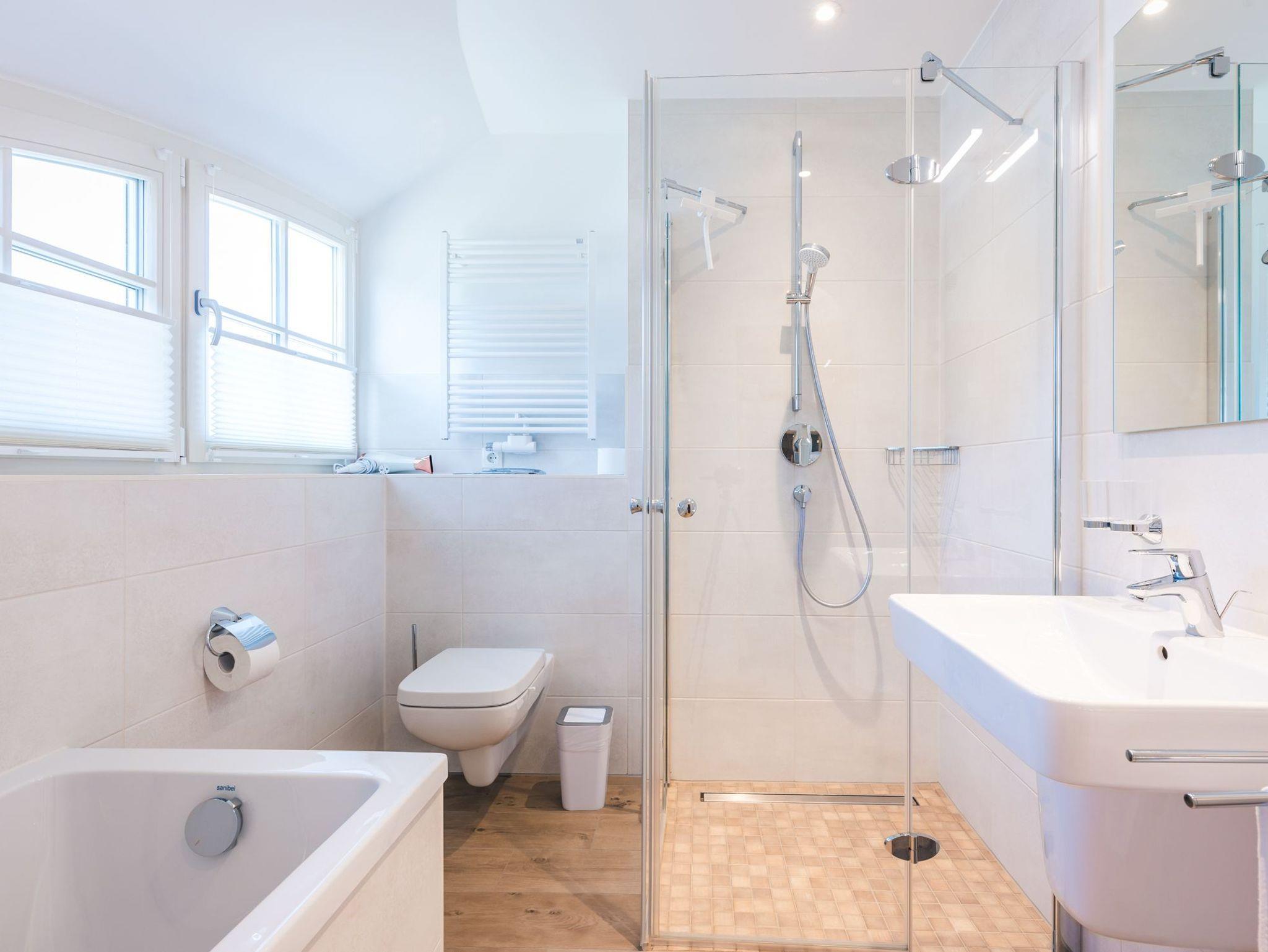 Ebenfalls auf dieser Ebene befindet sich das voll ausgestattete Badezimmer mit großer finnischer Sauna und bodengleicher Dusche sowie einer Badewanne.