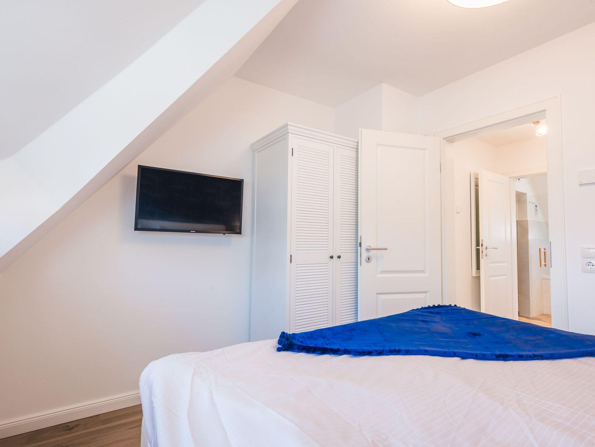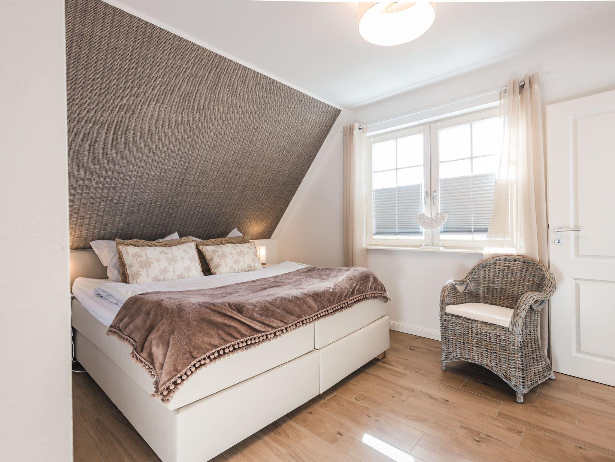 Im Obergeschoss des Ferienhauses befinden sich zwei Schlafzimmer für je zwei Personen, eines der Hauptschlafzimmer hat Zugang zu einem separaten weiteren kleinen Zimmer mit Einzelbett. Die Schlafzimmer sind mit Boxspringbetten ausgestattet. Der ausgebaute Spitzboden verfügt über zwei weitere Einzelbetten. 3 von 4 Schlafzimmern verfügen über einen Flatscreen TV.