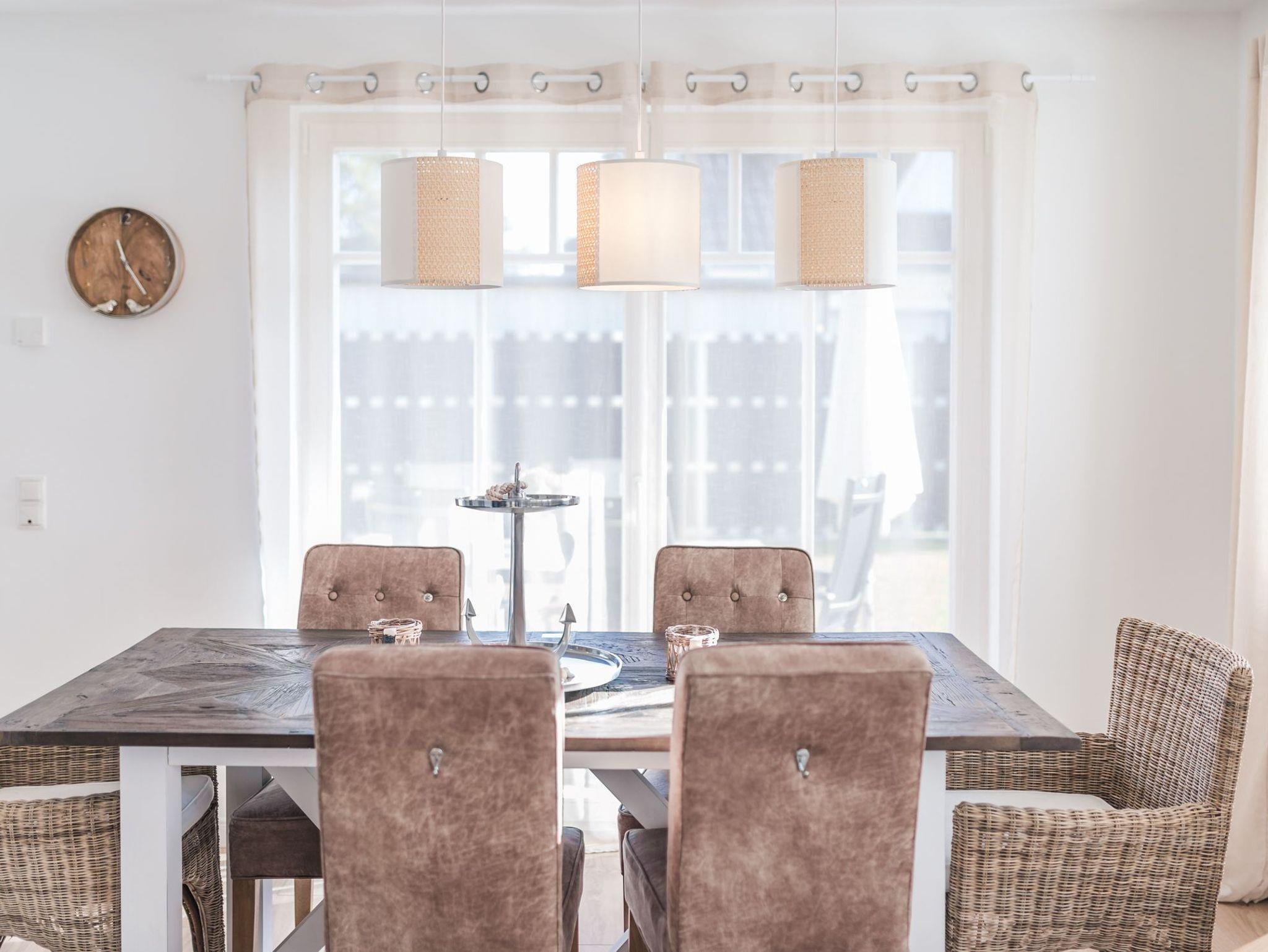 Im Erdgeschoss des Ferienhauses befindet sich der lichtdurchflutete und großzügig gestaltete Wohn- und Essbereich. Während die offene Küche mit hochwertiger Ausstattung keine Wünsche offen lässt, lassen sich am Esstisch für sieben Personen Urlaubsmahlzeiten genießen. Von hier aus fällt der Blick über große Fensterfronten auf die anliegende Terrasse die traumhafte Sonnenstunden verspricht. Ob gemütliche Abende oder romantisches Candle Light Dinner ? unvergessliche Urlaubsmomente sind hier garantiert. Die komfortable Sitzlandschaft des Wohnbereichs vorm Kaminofen lädt zum Verweilen ein.Ebenfalls sorgt im Erdgeschoss ein Bad mit Dusche für zusätzlichen Komfort. Natürliche Materialien, dezente Formen und abgestimmte Farben machen den Charme dieses Ferienhauses aus ? Ankommen-Wohlfühlen und Durchatmen garantiert.