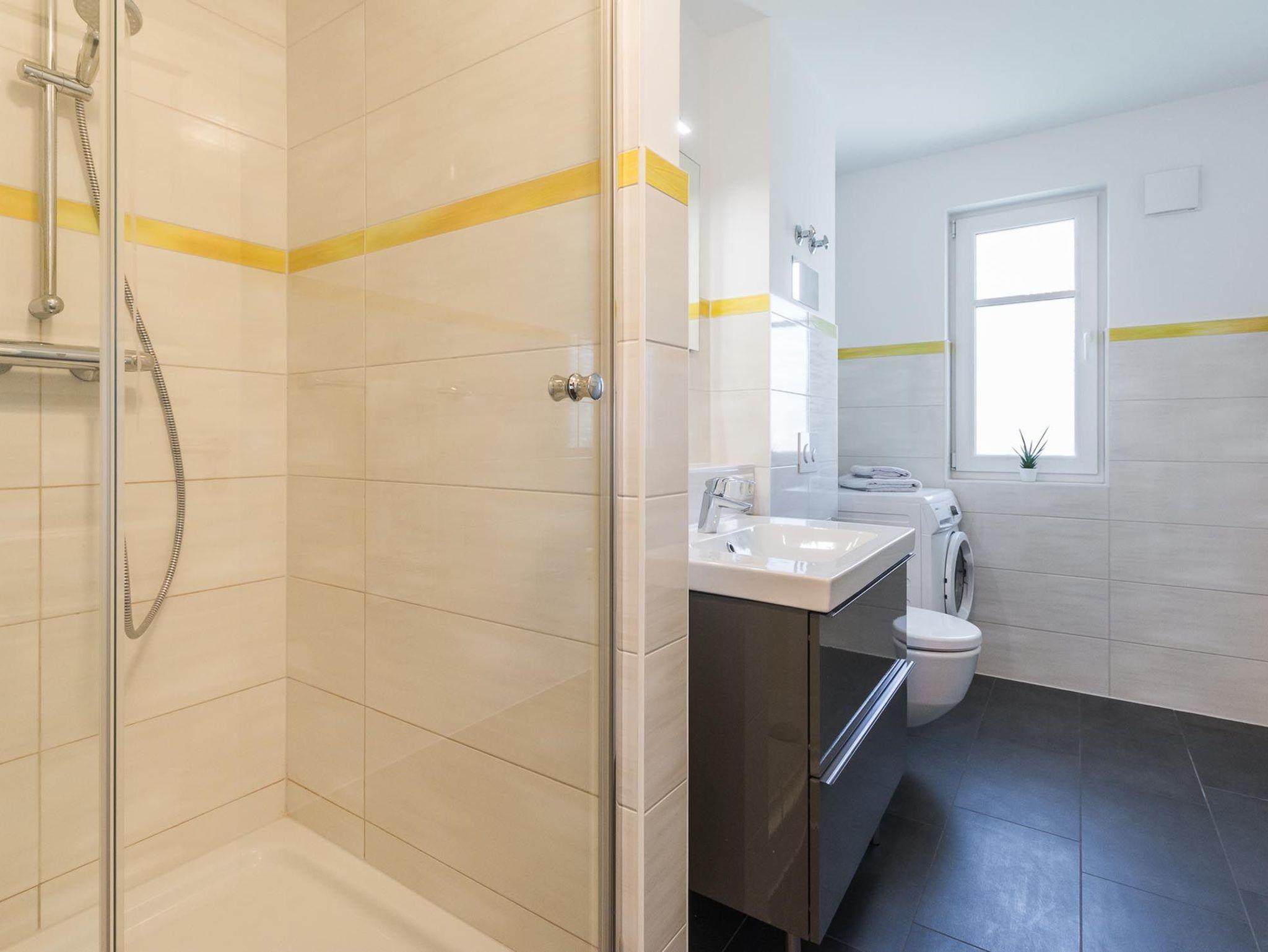 Das modern eingerichtete Badezimmer ist mit einer hochwertigen Dusche sowie einer Waschmaschine ausgestattet.