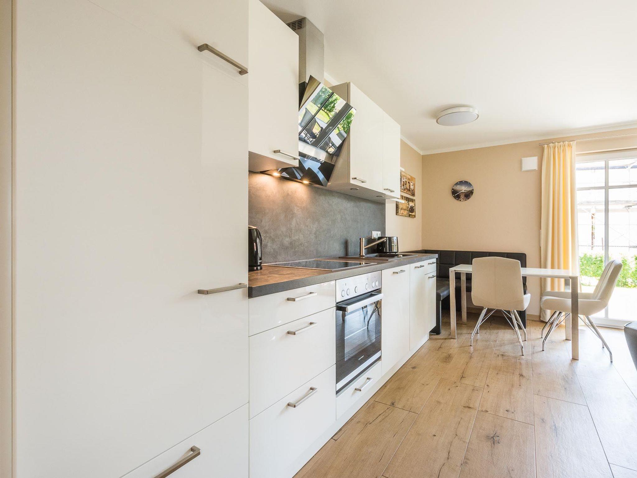 Das Appartement verfügt über einen lichtdurchfluteten Wohnbereich mit einer offenen Küche und gemütlichem Essbereich. Die Küche ist voll ausgestattet.