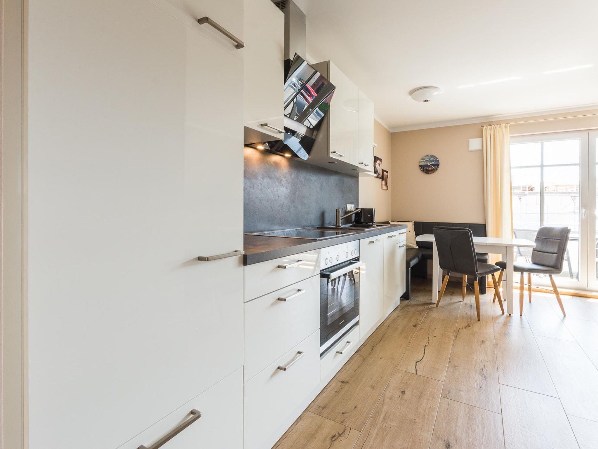 Das Appartement verfügt über einen lichtdurchfluteten Wohnbereich mit einer offenen Küche und gemütlichem Essbereich. Die Küche ist voll ausgestattet.