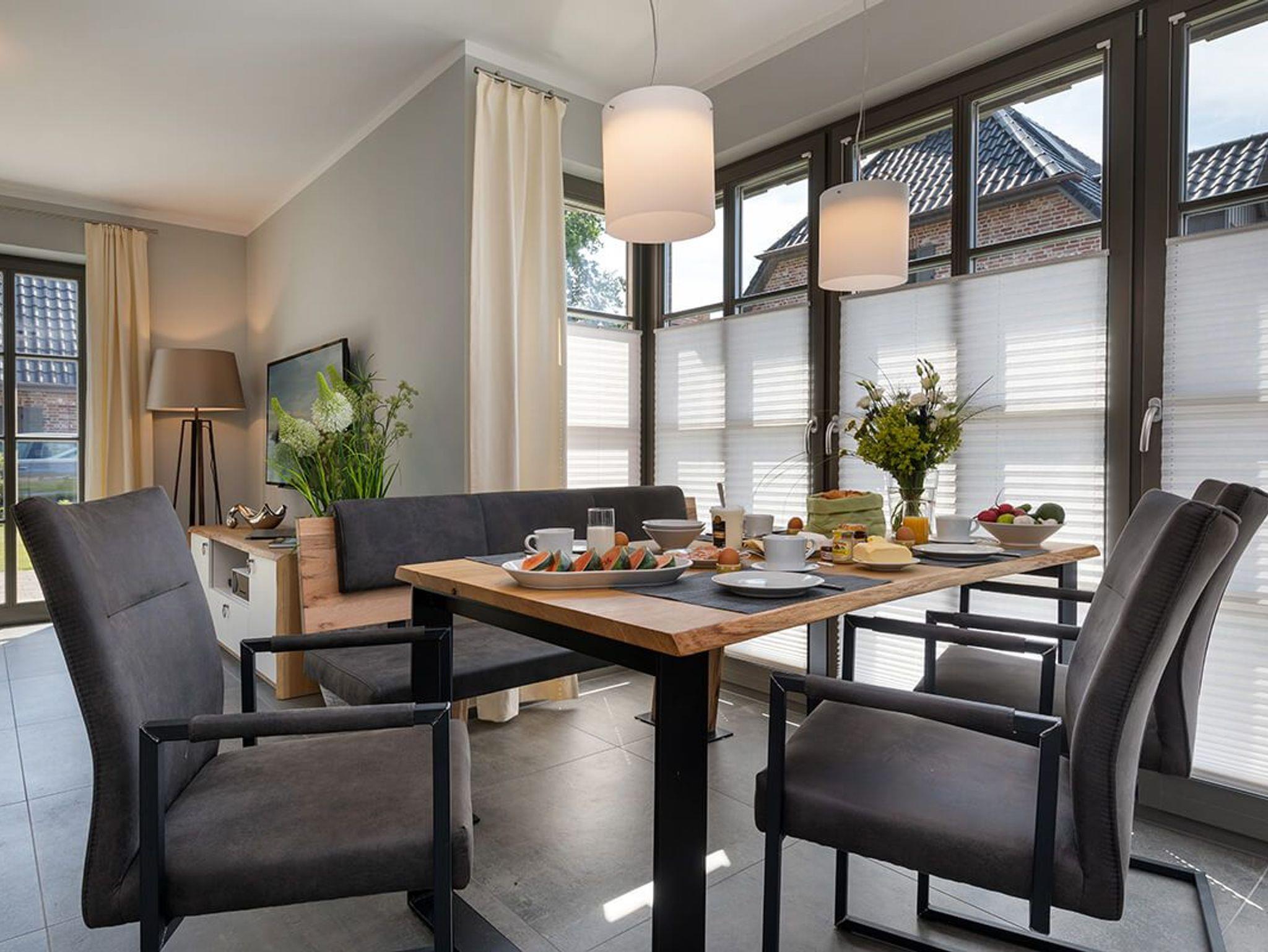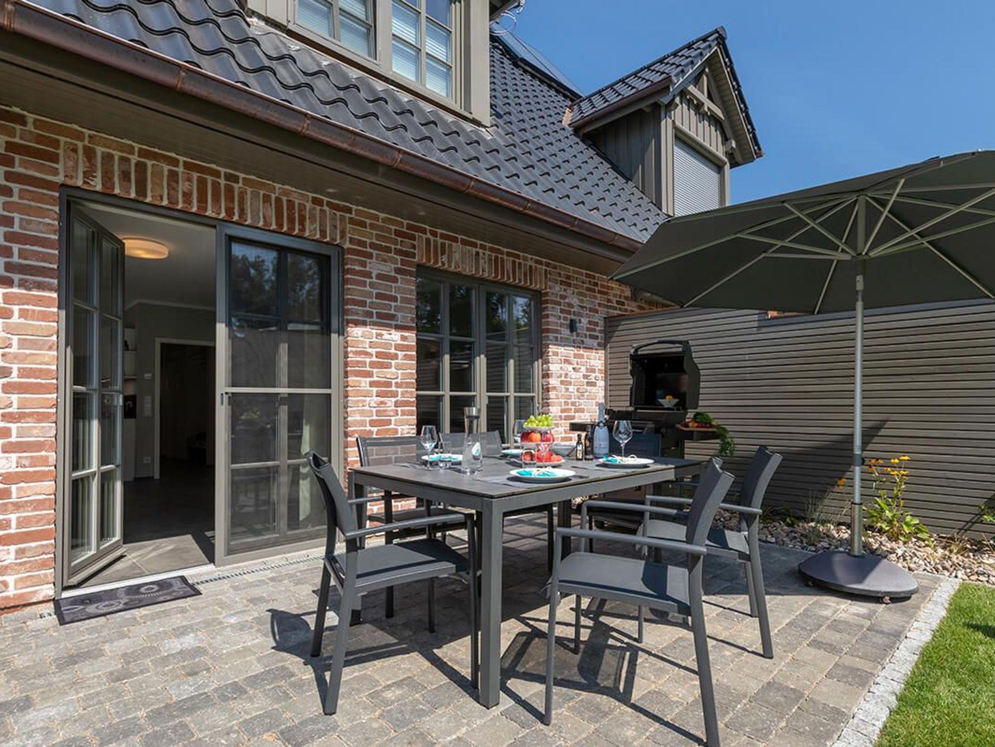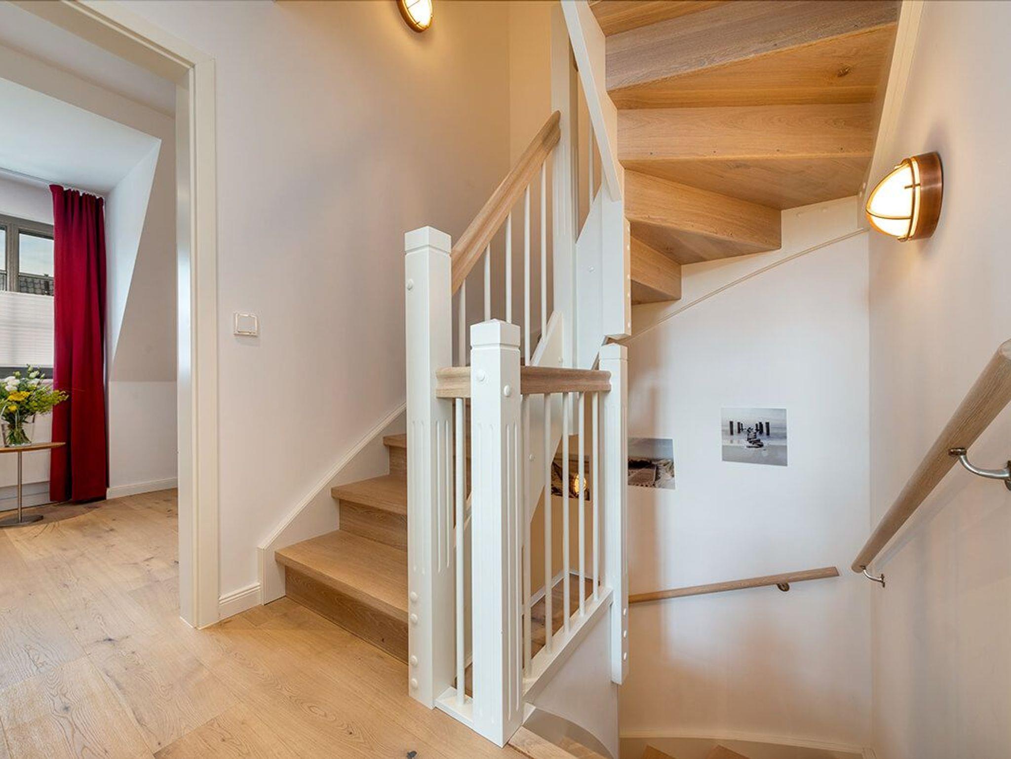 Diese lichtdurchflutete, 94 m² große Doppelhaushälfte erstreckt sich über drei Wohnebenen und bietet Platz für bis zu 6 Personen. Das Erdgeschoss überzeugt durch einen großzügigen, offenen Wohn- und Essbereich, der durch einen modernen Gaskamin eine behagliche Atmosphäre erhält. Die voll ausgestattete Küche grenzt direkt an die sonnige Südterrasse. Ein vollwertiges Duschbad sowie ein Hauswirtschaftsraum mit Waschmaschine und Trockner bieten zusätzlichen Komfort. Im 1. Obergeschoss befinden sich zwei stilvolle Schlafzimmer mit hochwertigen Echtholzbetten sowie das Hauptbadezimmer inklusive privater finnischer Sauna. Das Dachgeschoss bietet im ausgebauten Spitzboden zwei weitere vollwertige Schlafplätze. Hochwertige Details wie Fußbodenheizung, Außenrollos und Insektenschutz garantieren einen erholsamen Aufenthalt. (Tierfrei & Nichtraucher).