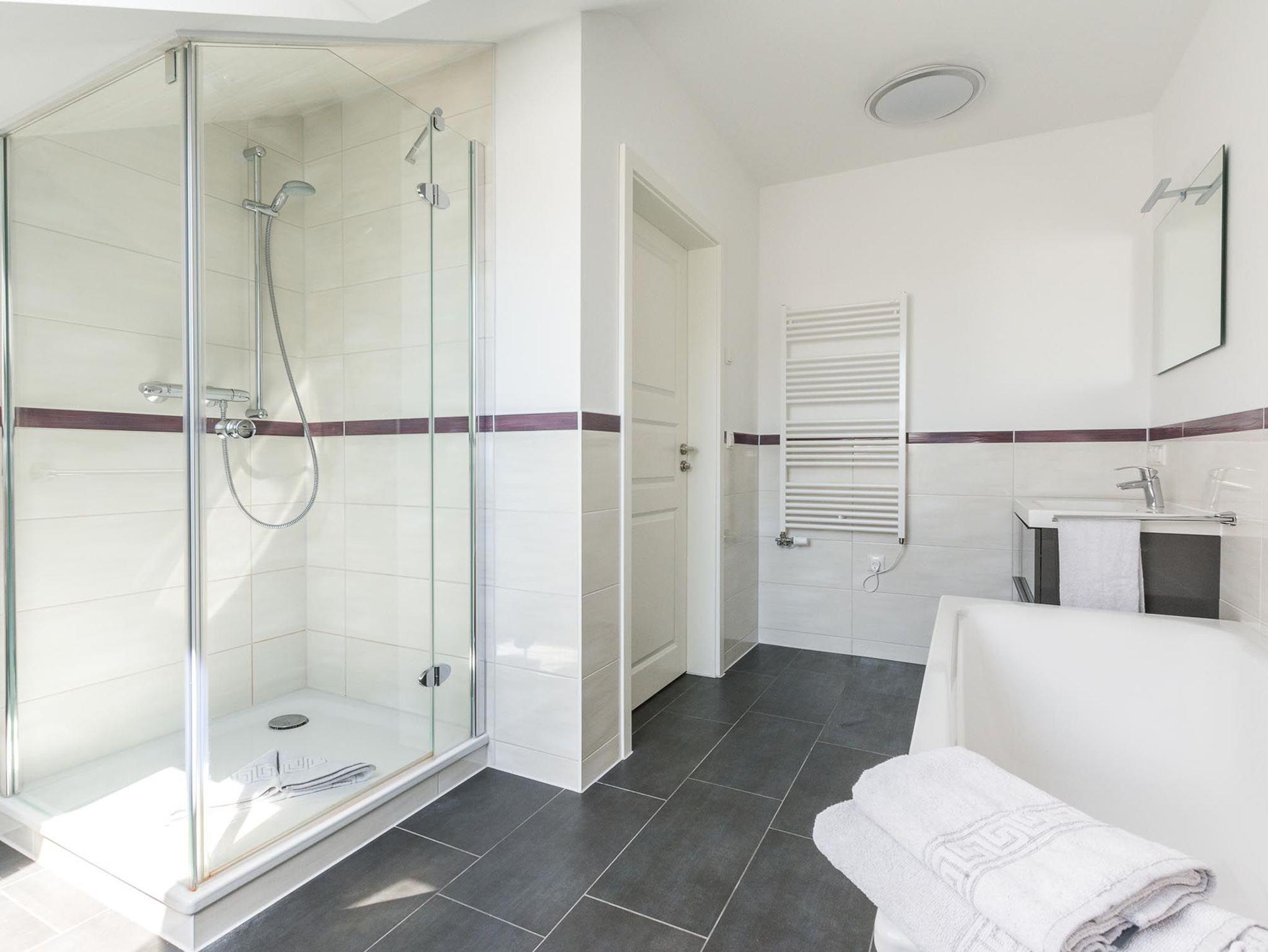 Das modern eingerichtete Badezimmer ist mit einer hochwertigen Dusche, einer großen Badewanne sowie einer Waschmaschine ausgestattet.