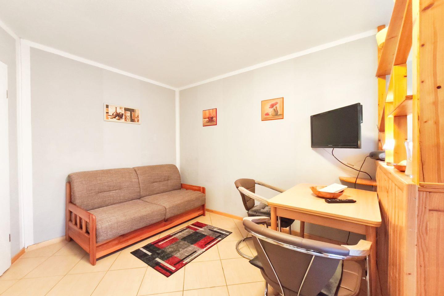 Die Wohnung verfügt über ein gemütliches Schlafzimmer und einen offenen Wohnbereich, der mit einer gut ausgestatteten Küche verbunden ist. Hier finden Sie alles, was Sie für die Zubereitung schmackhafter Mahlzeiten benötigen, von einem Herd über einen Kühlschrank bis hin zu Küchenutensilien und einer Mikrowelle. Essbereich und Sofaecke laden zum Entspannen ein – genießen Sie gemeinsame Abende bei einem Film auf dem digitalen TV oder einfach einen entspannten Abend bei einem Glas Wein.