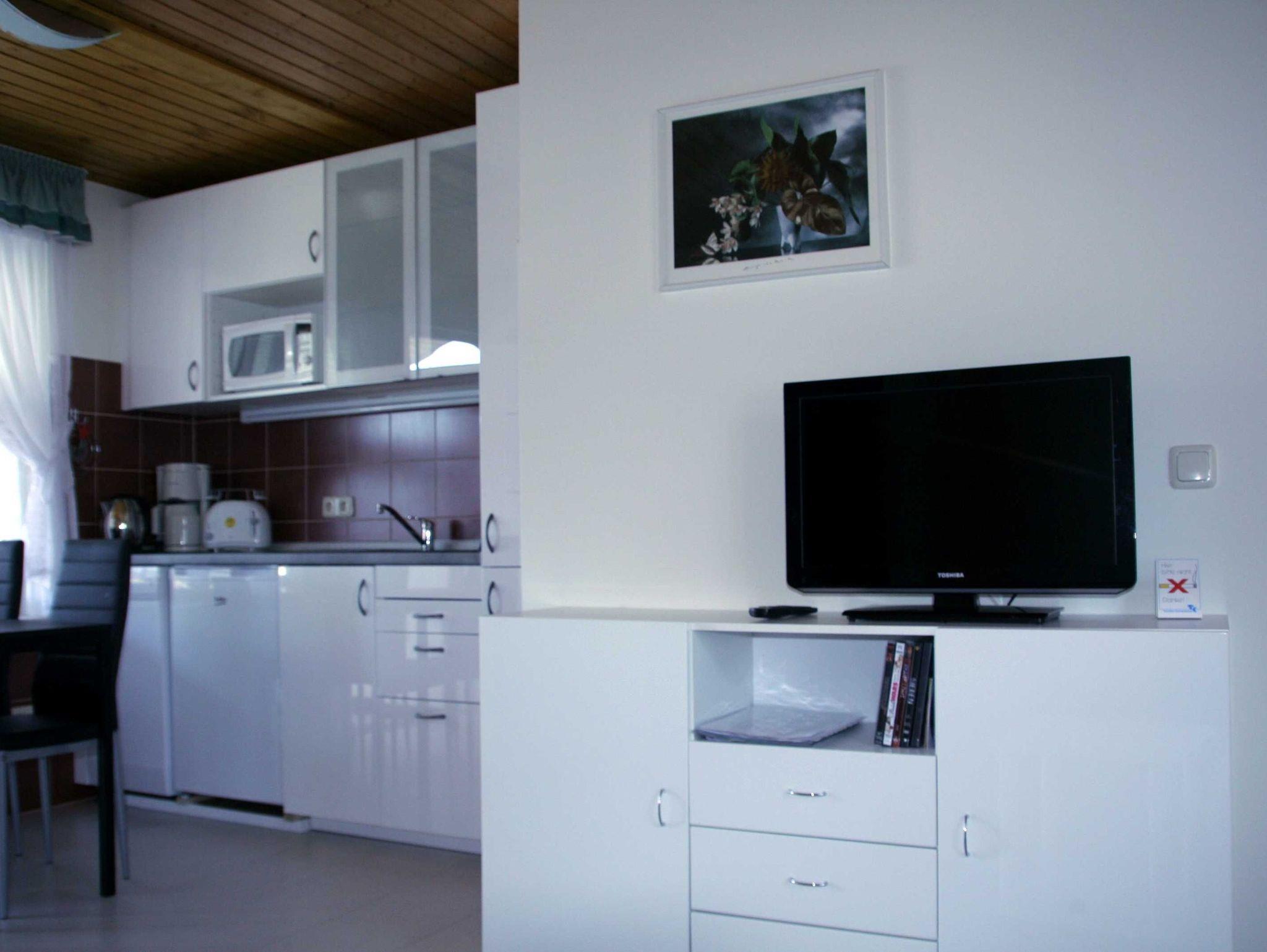 Wohnzimmer mit Kabel-TV und Küchenradio,