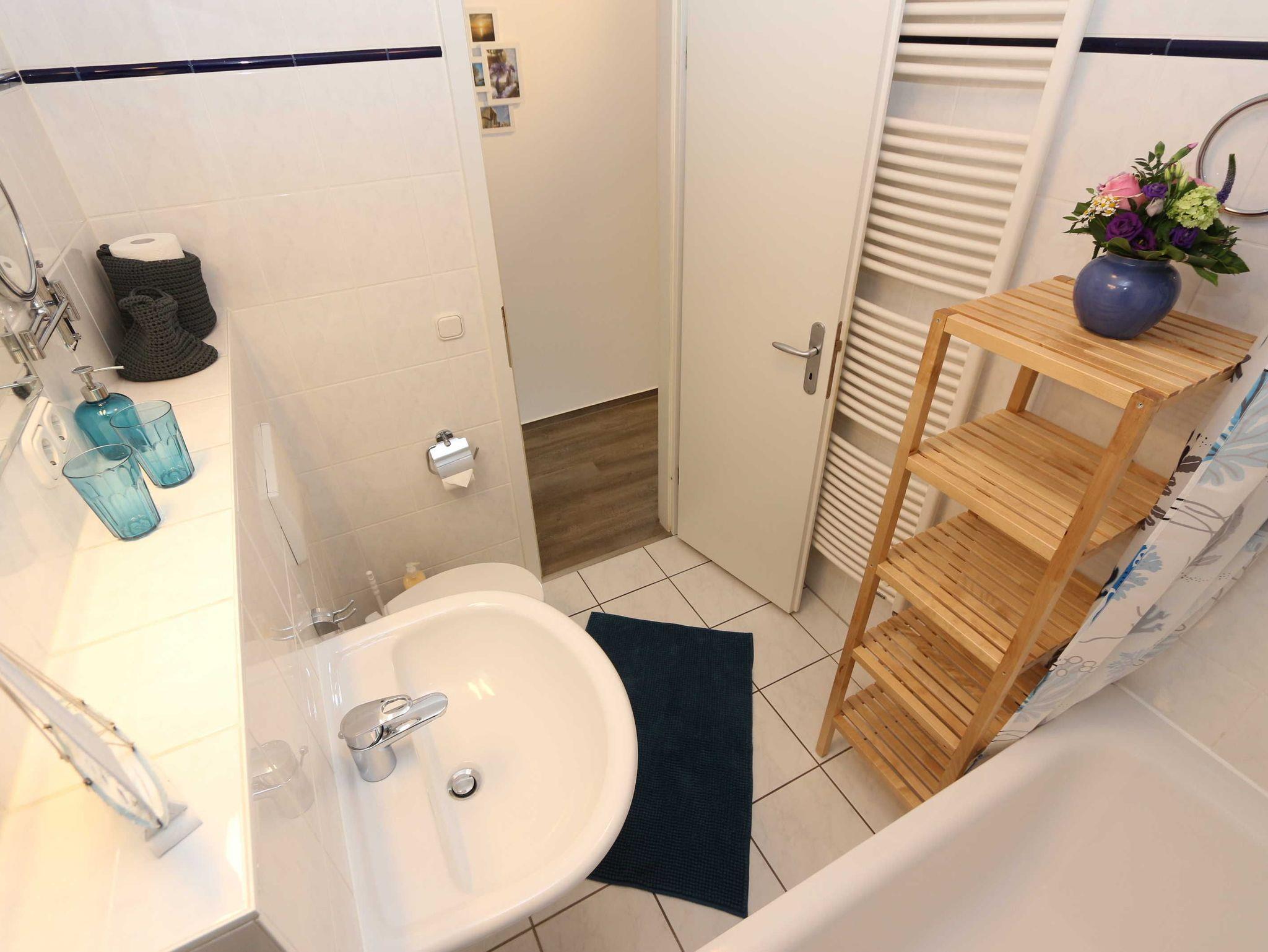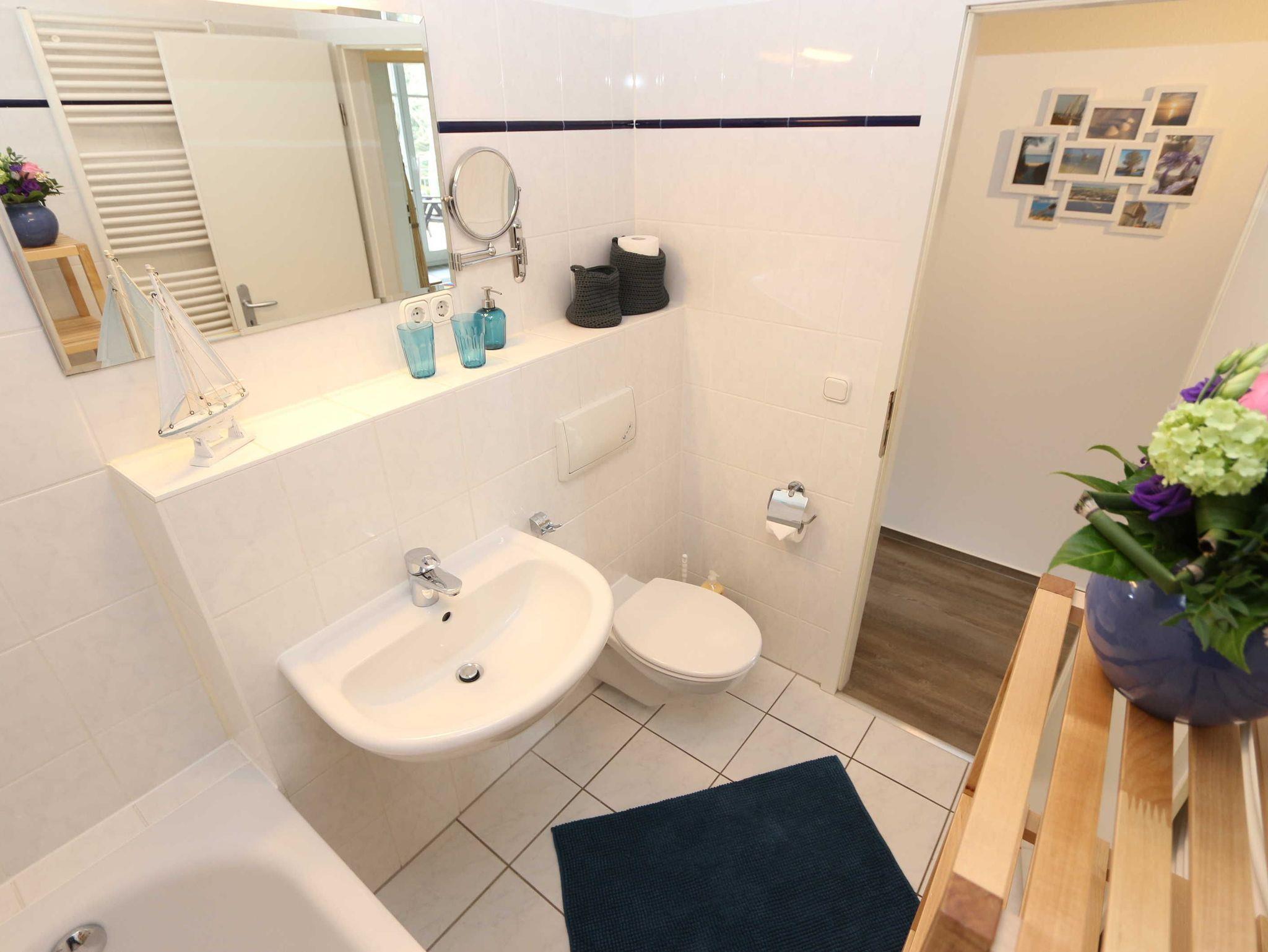 • Badezimmer mit Badewanne, WC, Waschbecken und Handtuchtrockenheizkörper.
