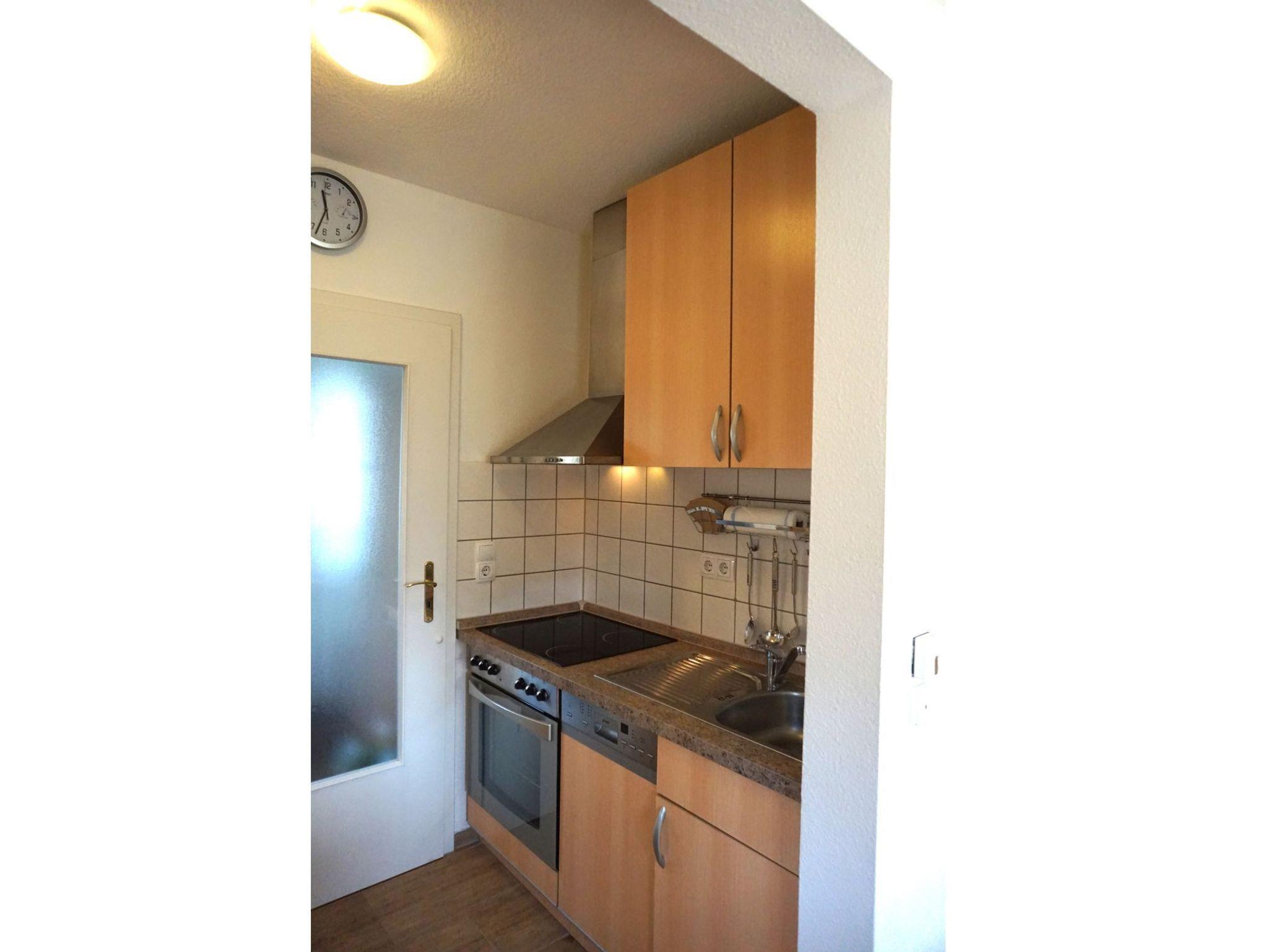 gut eingerichtete Küche mit Ceranherd, Wasserkocher, Backofen, Geschirr, Besteck, Gläser, Kaffeemaschine, Toaster, Kühlschrank, Mikrowelle, Staubsauger, TV, Mini-Stereoanlage mit CD-Player, WLAN