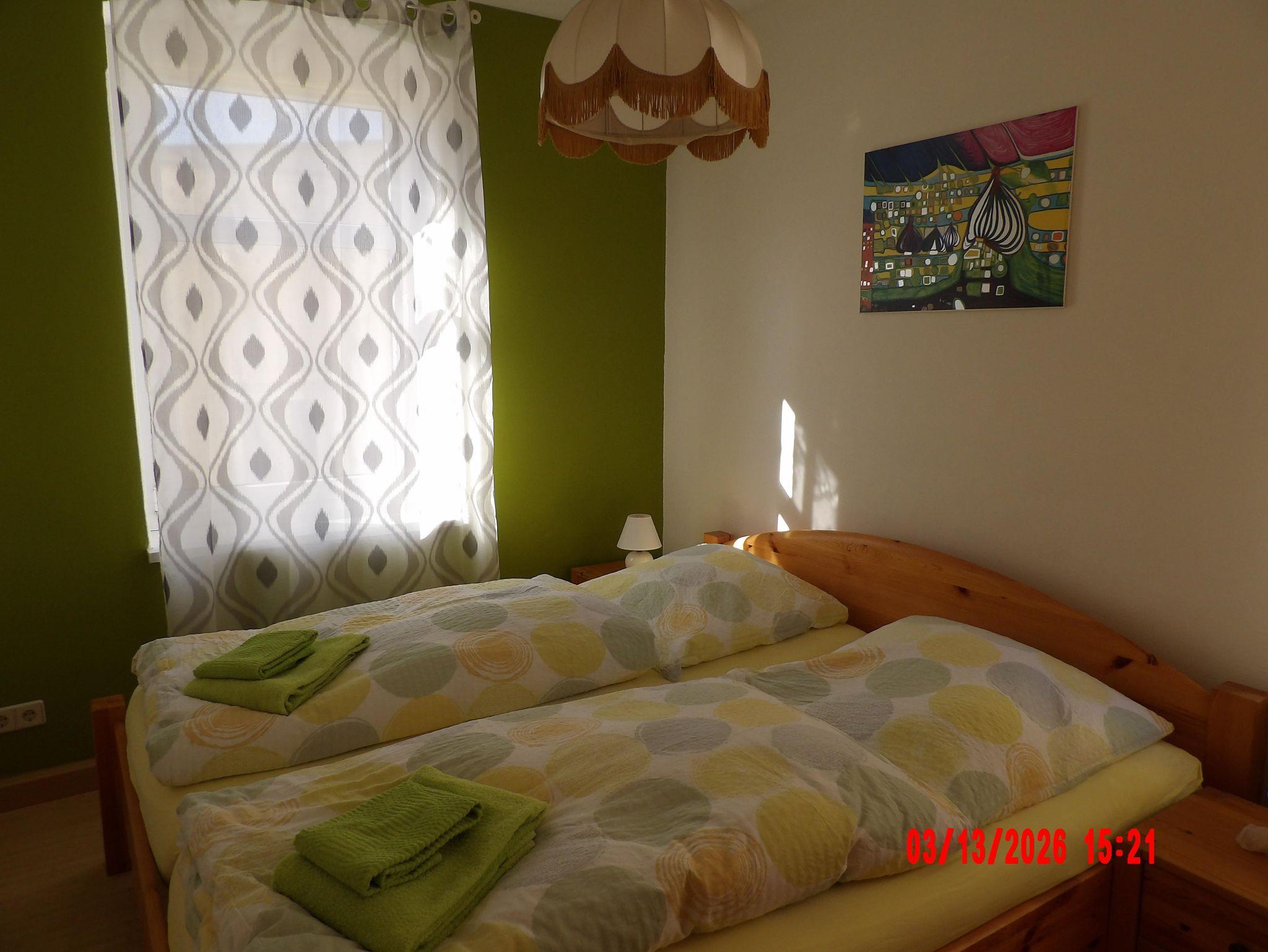 Die Wohnung befindet sich im Erdgeschoss und verfügt über 1 Schlafzimmer mit 2 Einzelbetten, 1 Schlafzimmer mit 1 Doppelbett, Wohnzimmer, Küchenzeile mit Geschirrspüler und Mikrowelle, Dusche/ WC, TV und kostenloses WLAN.