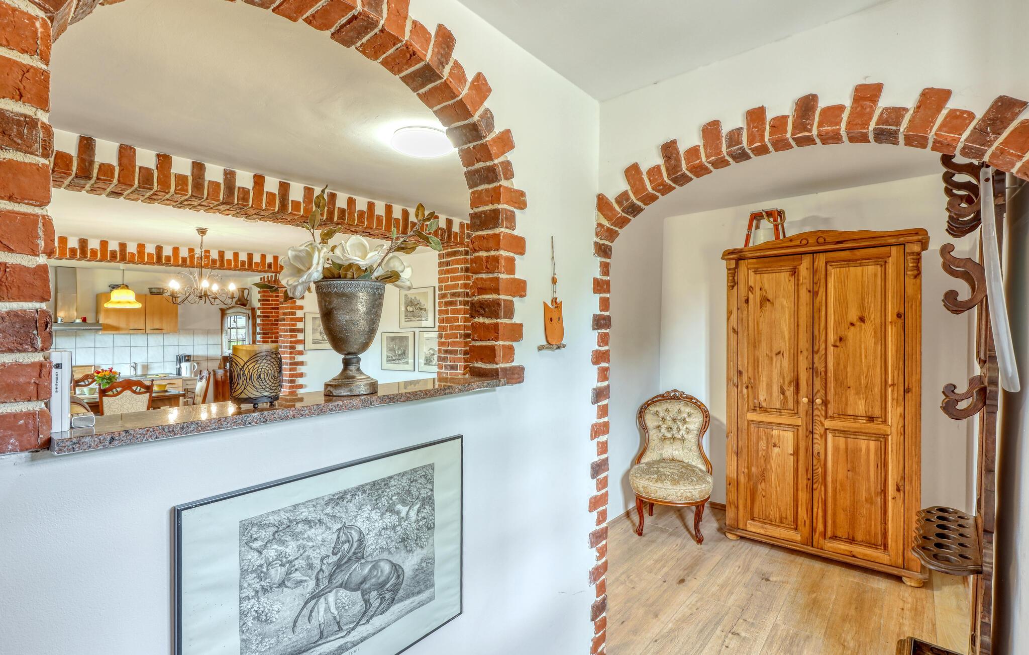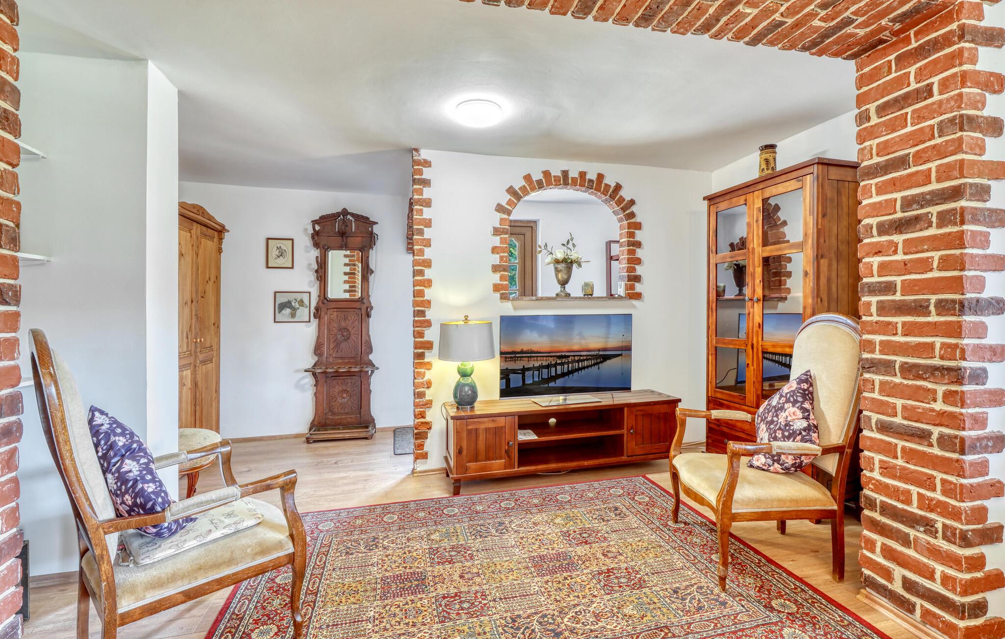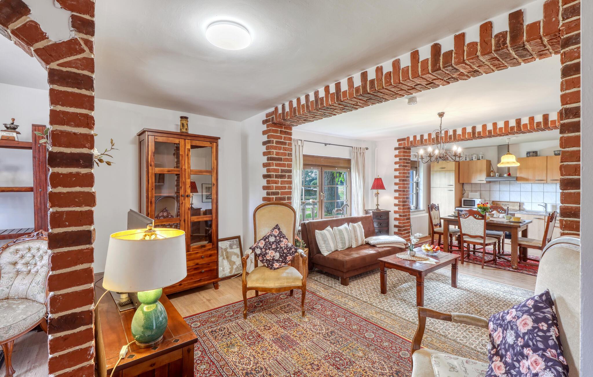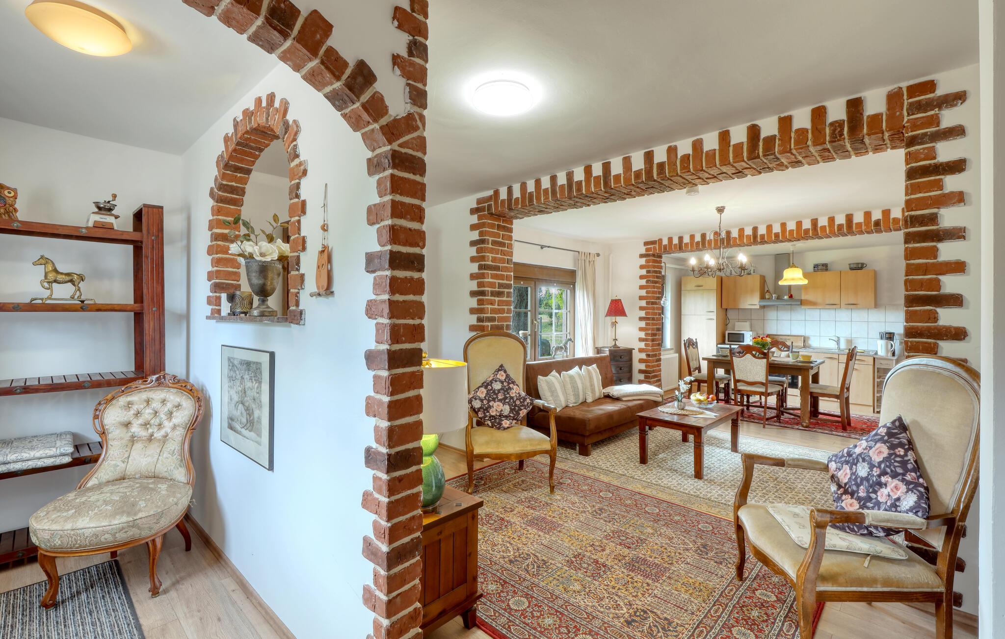 Ihre Unterkunft verbindet Tradition und Behaglichkeit miteinander. Hier erleben Sie entspannte Urlaubstage, an denen Sie die Natur genießen und den Alltag hinter sich lassen können. Machen Sie es sich auf den Sofas im Wohnzimmer bequem und nutzen Sie den Fernseher für einen entspannten Abend. Bewundern Sie die sichtbaren Backsteinbögen, die dem Raum einen rustikalen Charme verleihen, und bereiten Sie Ihre Mahlzeiten in der heimeligen Küche mit Esstisch zu.