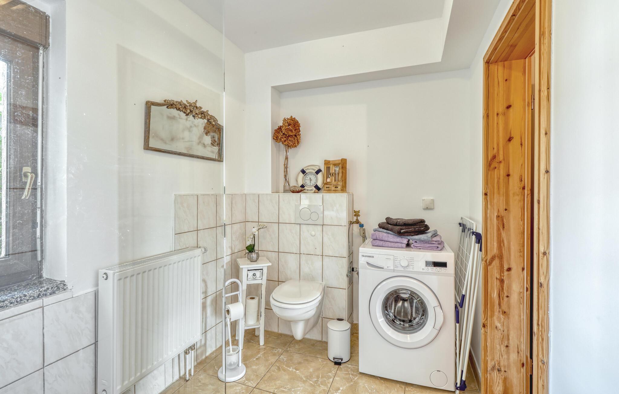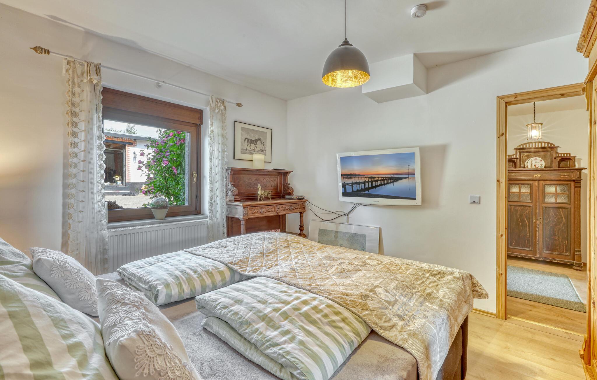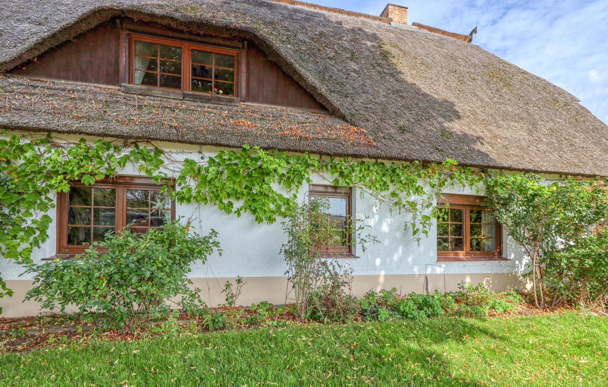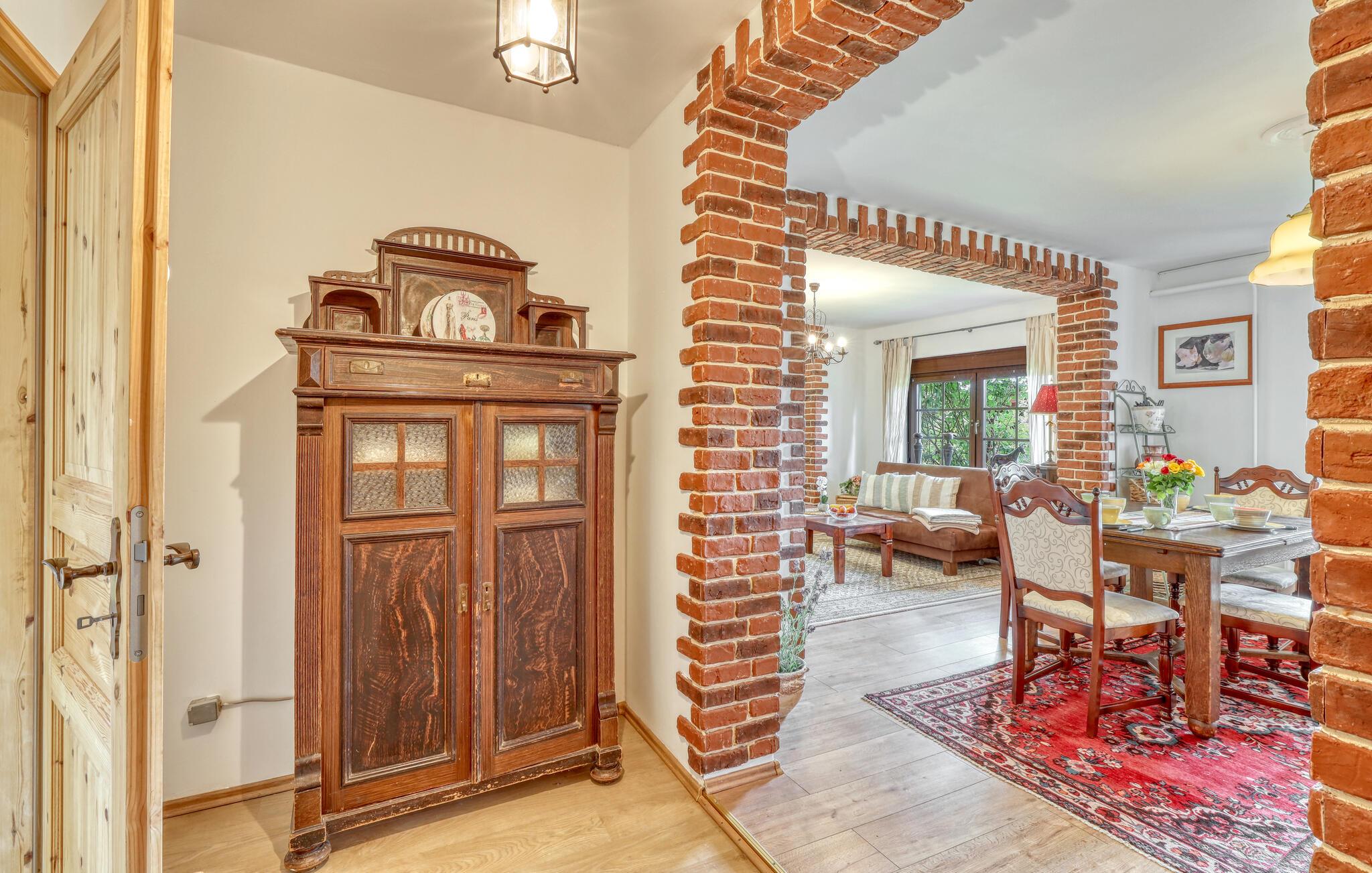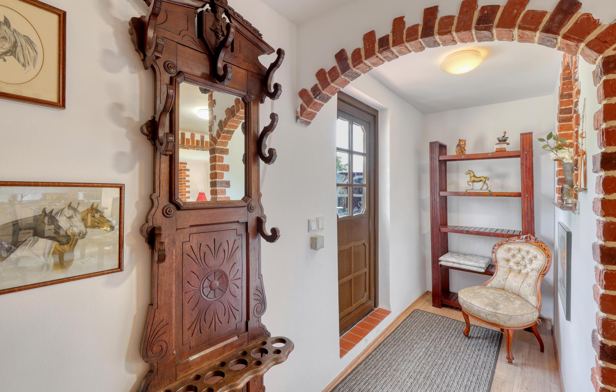 Ihre Unterkunft verbindet Tradition und Behaglichkeit miteinander. Hier erleben Sie entspannte Urlaubstage, an denen Sie die Natur genießen und den Alltag hinter sich lassen können. Machen Sie es sich auf den Sofas im Wohnzimmer bequem und nutzen Sie den Fernseher für einen entspannten Abend. Bewundern Sie die sichtbaren Backsteinbögen, die dem Raum einen rustikalen Charme verleihen, und bereiten Sie Ihre Mahlzeiten in der heimeligen Küche mit Esstisch zu.