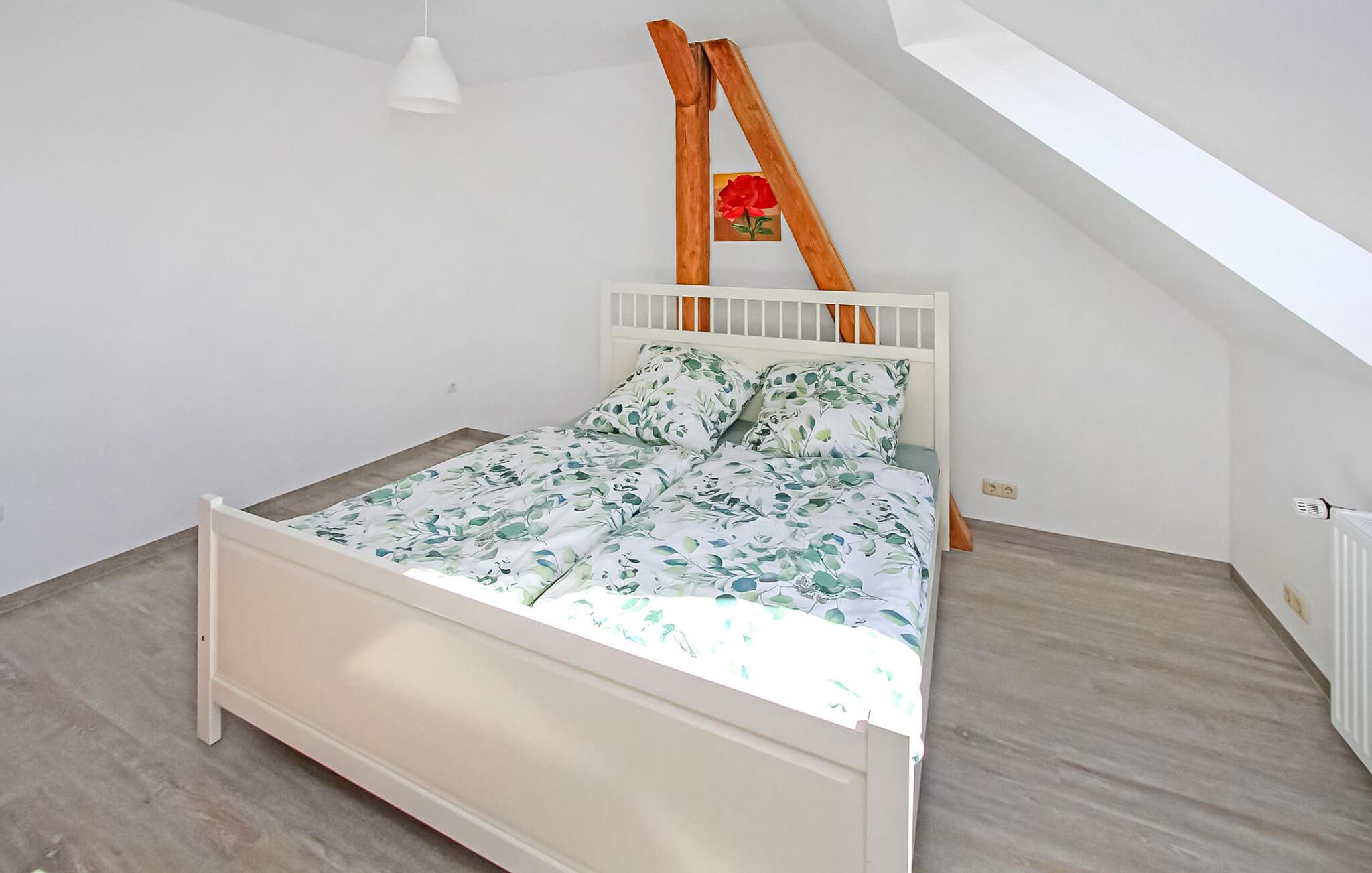 Umgeben von Feldern und Wiesen befindet sich auf einem ca. 3000 qm großen, komplett umzäunten Grundstück mit eigener Zufahrt die 135 qm große, ruhig gelegene Ferienwohnung für bis zu 8 Personen im Obergeschoss eines Wohnhauses. Der im Erdgeschoss wohnende Eigentümer ist für gewöhnlich nur an Wochenenden vor Ort. Die großräumige Wohnung wurde im Jahre 2021 komplett saniert und neu ausgestattet. Erstbezug Frühjahr 2021. Vorhanden sind ein großer Wohnbereich (Couchgarnitur, Sessel, Schreibtisch, Esstisch, Flachbild-TV, Radio, CD-Player, DVD) mit offener Küche (E-Herd, Backofen, Geschirrspüler, Kühlschrank, Mikrowelle, div. Küchengeräte), ein kombinierter Wohn-/Schlafraum (Doppelbett, Flachbild-TV, Sitzecke), 2 weitere Schlafräume (je Doppelbett) sowie ein Bad (Dusche, zwei Waschtische, WC). Im Eingangsbereich befindet sich zudem ein Gäste-WC. Für Kleinkinder stehen ein Kinderbett und ein Hochstuhl bereit. W-LAN ist ebenfalls vorhanden. Weiterhin stehen zur Verfügung: eine überdachte Sitzecke im Freien mit Kühlschrank und Grill, Sonnenliegen, ein kleiner Kinderspielplatz sowie Parkplatz auf dem Grundstück.