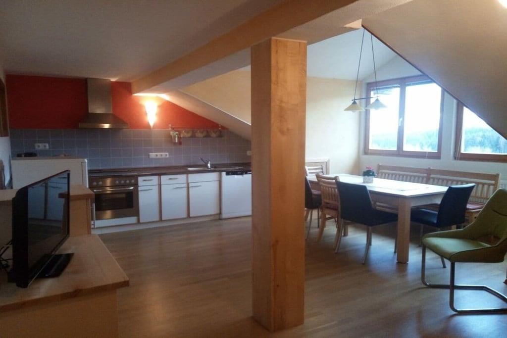 Unsere gemütliche 4-Zimmer-Ferienwohnung ist mit Schreinermöbeln und Holzparkettboden ausgestattet. In der Wohnküche finden Sie eine voll ausgestattete Küche und einen Esstisch mit Platz für bis zu 8 Personen. Ein Kinderstuhl ist vorhandenl Zur Wohnung gehört eine kleine Sommerküche mit Waschmaschine, überdachter Terrasse und Zugang zum Garten mit Grillplatz und Spielgeräten. Die Wohnung ist auch als kleine Variante mit 2 Schlafzimmern und 1 Bad buchbar. Fragen Sie hier gerne nach unseren Preisen. Wir sind arberaktivCARD-Gastgeber - über 50 Leistungen - Schwimmbäder in der Region, Bayerwaldsauna in Zwiesel, Baumwipfelpfad, verschiedene Museen und Veranstaltungen nutzen Sie mit Ihrer Gästekarte kostenfrei - UND freie Fahrt mit Bus und Bahn!