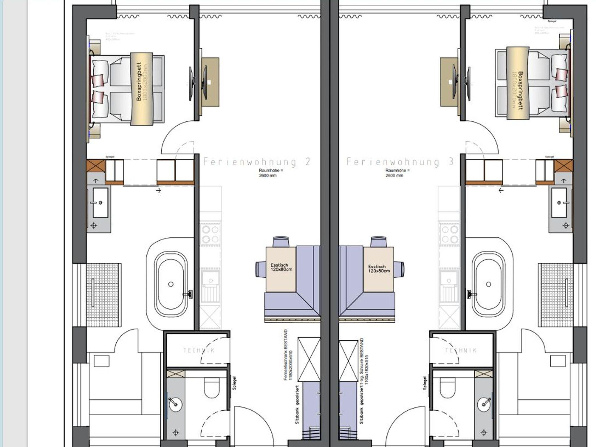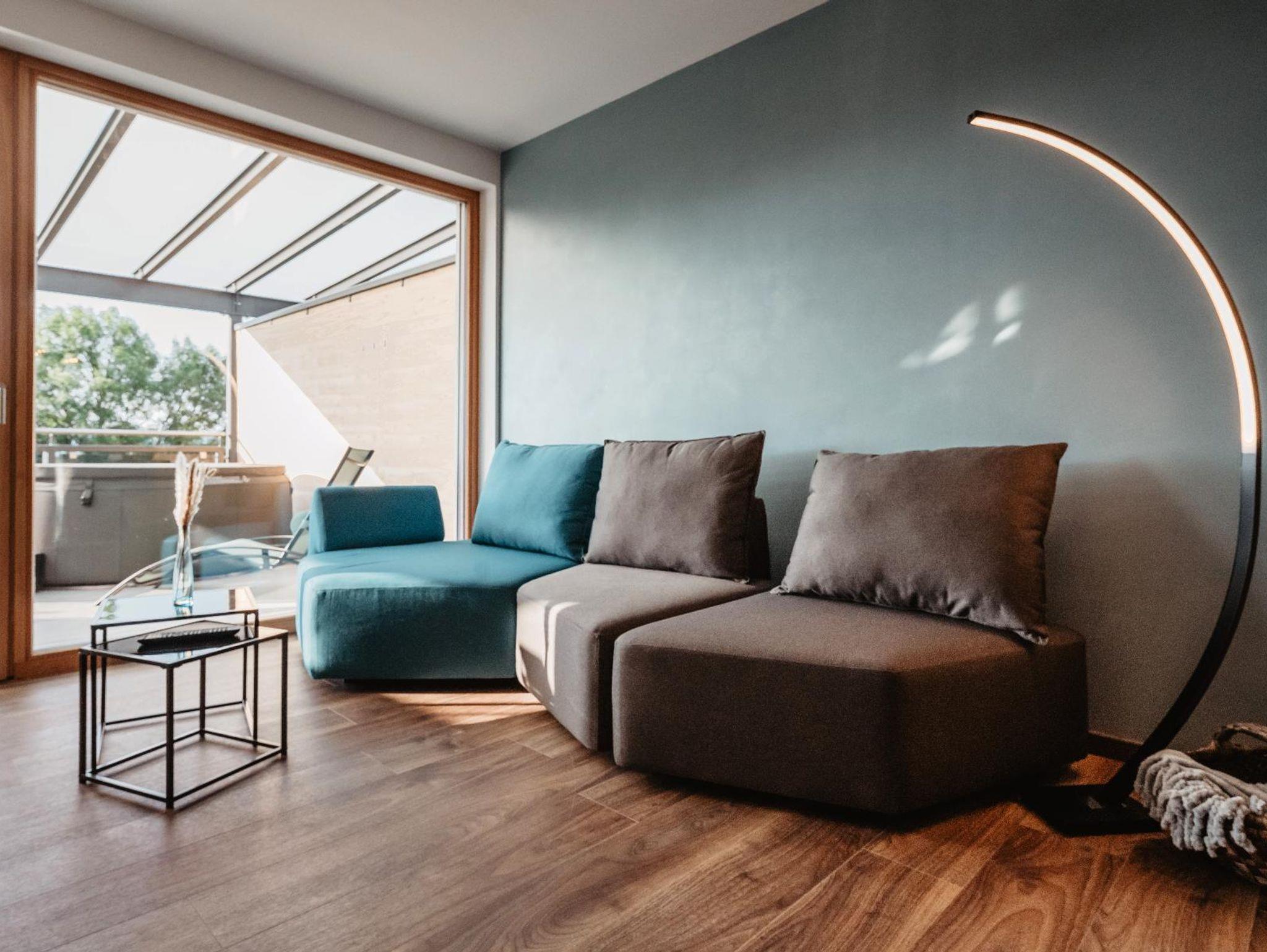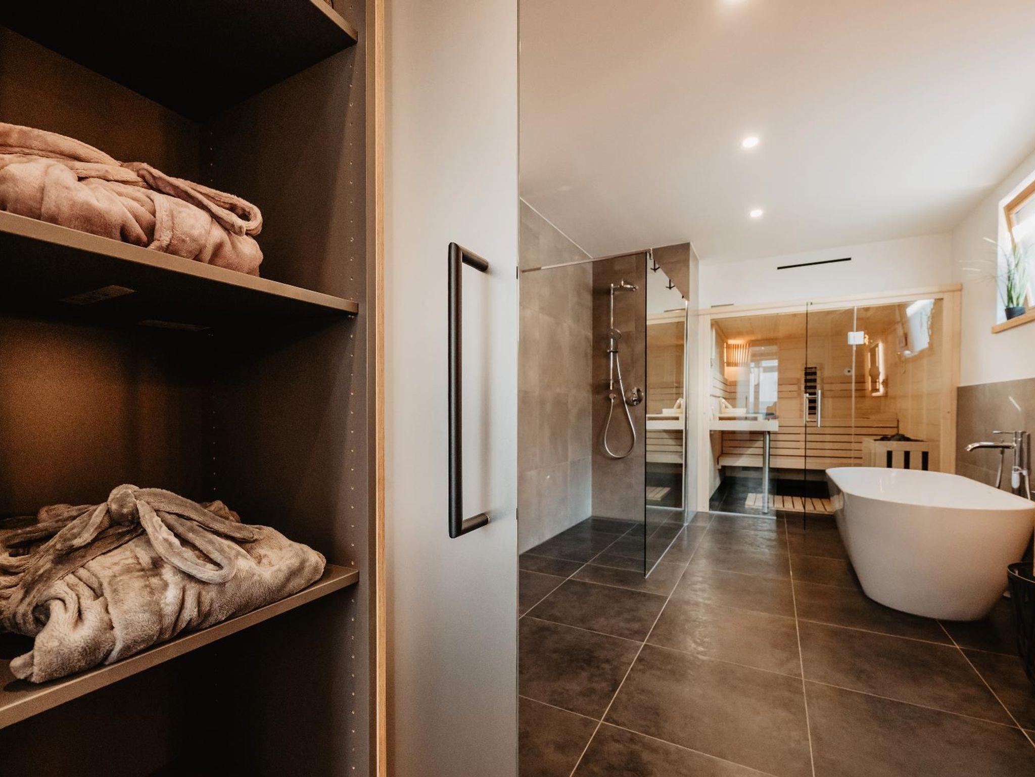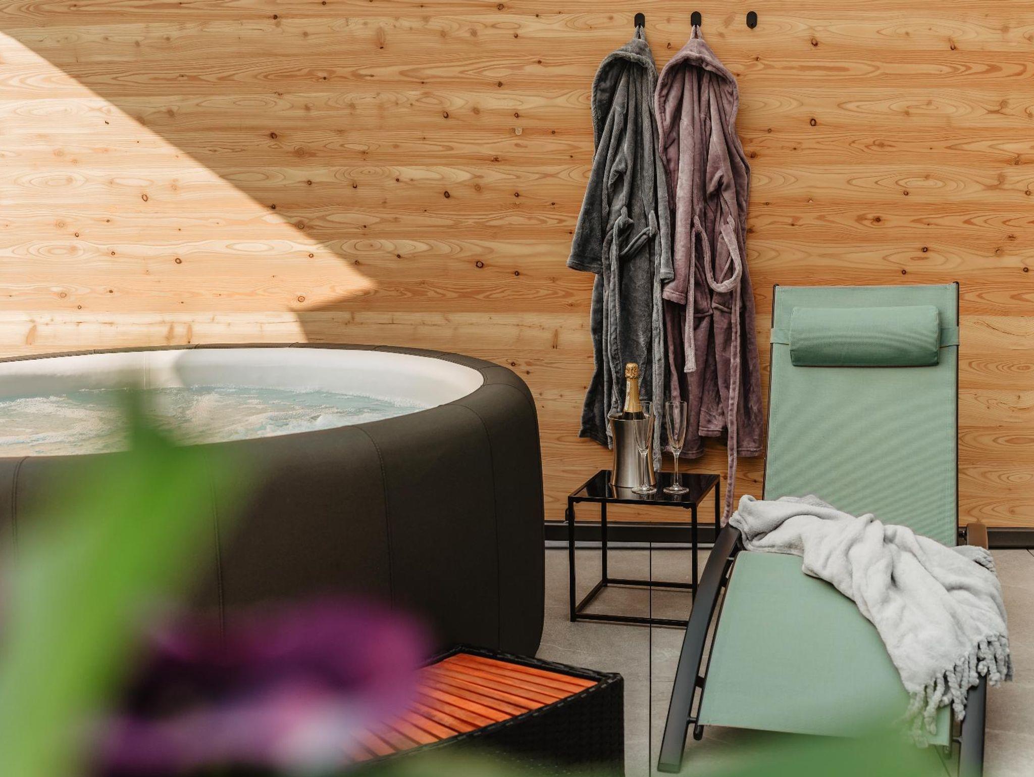 Diese beiden luxuriösen Wohnungen mit eigener Sauna und eigenem Whirlpool liegen im Erdgeschoss und können jeweils über einen eigenen Eingang barrierearm betreten werden. Sie bieten Raum und Wellness für je zwei Personen.