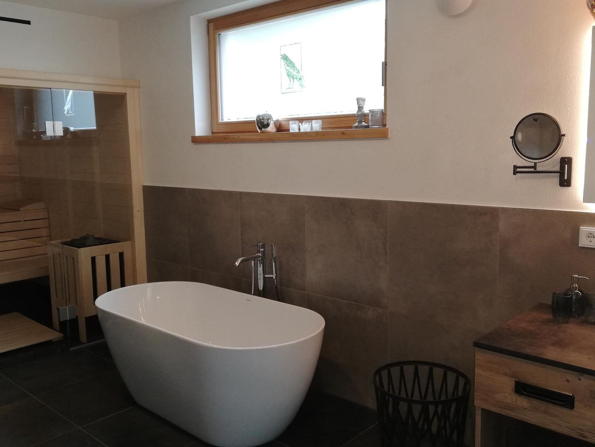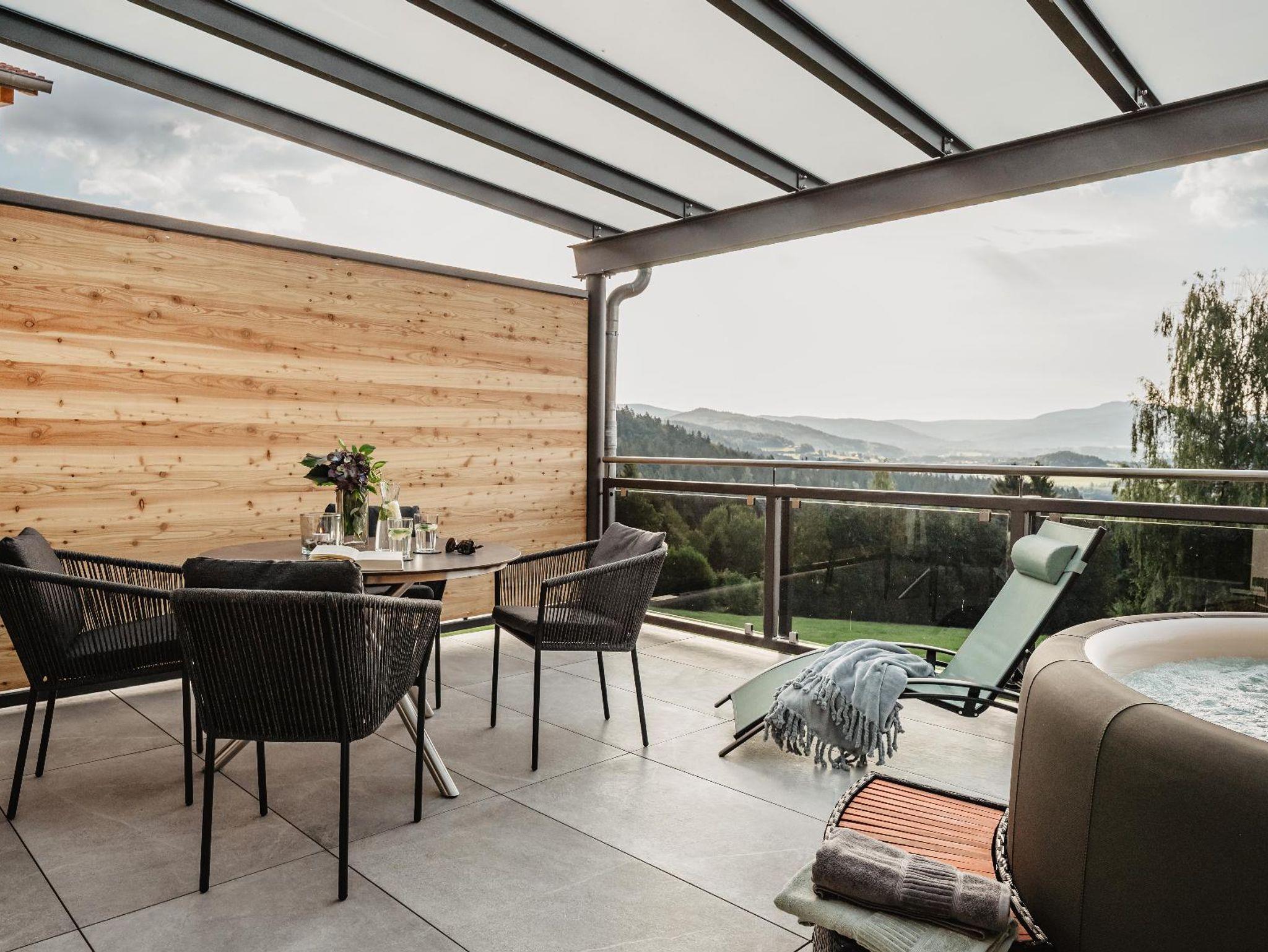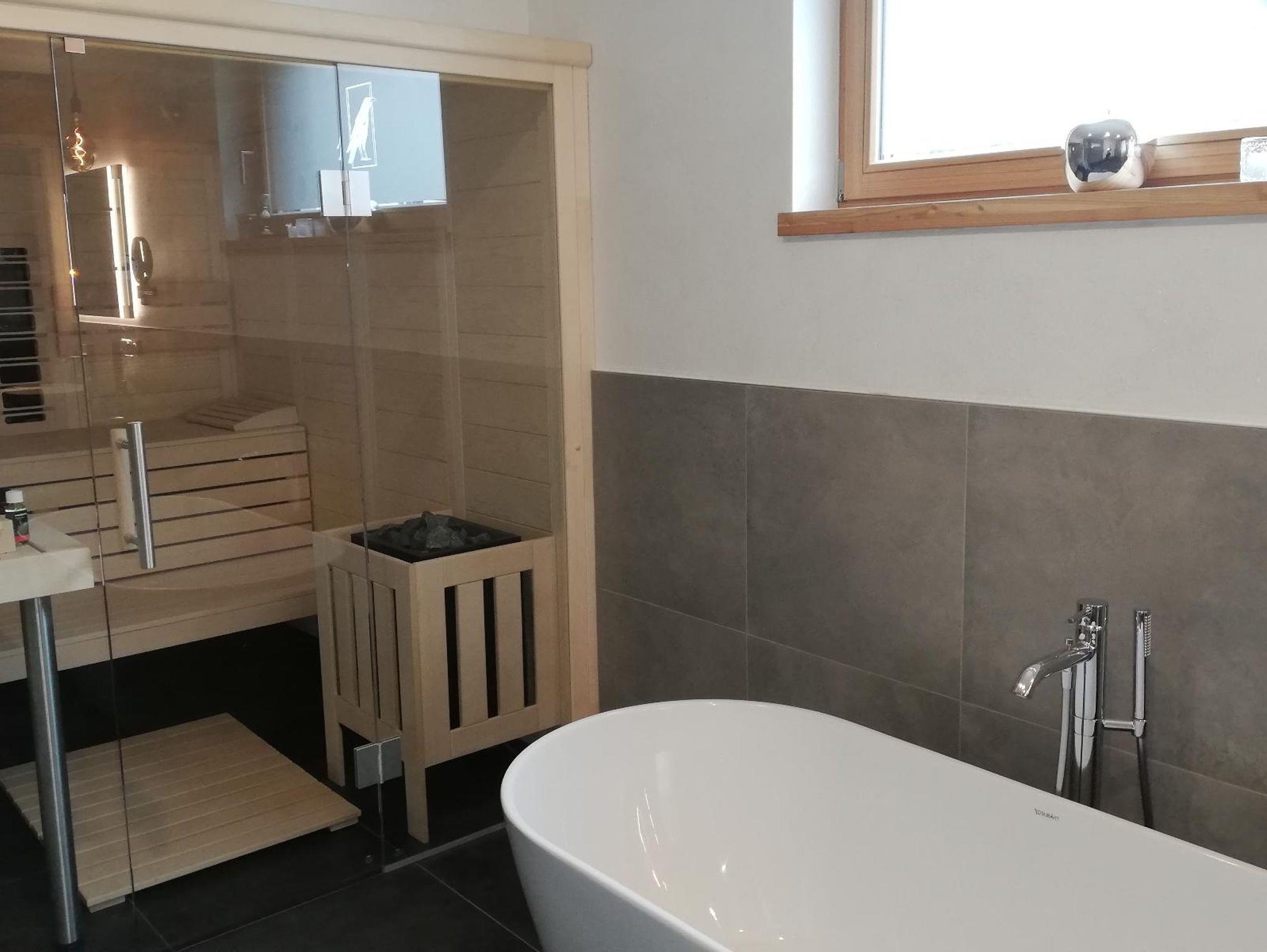 Im Eingangsbereich befindet sich die Garderobe sowie die Toilette mit Fenster. Der großzügige Wohnbereich besteht aus einer gut ausgestatteten Küche mit Weinkühlschränken, Kaffeevollautomat, Mikrowelle usw., einem Essplatz, einer gemütlichen Couchecke und einem 55 Zoll Smart TV-Gerät. Von hier aus gelangt man in das Schlafzimmer mit Boxspringbett und Smart TV. Nebenan liegt das großzügige Badezimmer mit steuerbarer Wellness-Ambiente-Beleuchtung, freistehender Badewanne, Walk-in-Regendusche, Einbauradio mit Bluetooth-Funktion und finnischer Sauna mit Infrarot-Bereich. Ein besonderes Highlight ist der 25 qm große überdachte Balkon, den man über Wohn- und Schlafzimmer betreten kann und der mit Sonnenliegen, Sitzgarnitur und einem Whirlpool ausgestattet ist. Von dort aus haben Sie einen traumhaften Ausblick auf die grandiose Natur. Genießen Sie Ihren privaten Relax- und Wellnessbereich!